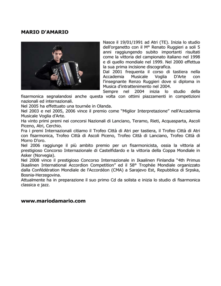 MARIO D'AMARIO Nasce il 19/01/1991 ad Atri (TE). Inizia lo studio dell’organetto con il M° Renato Ruggieri a soli 5 anni raggiungendo subito importanti risultati come la vittoria del campionato italiano nel 1998 e di quello mondiale nel 1999. Nel 2000 effettua la sua prima incisione discografica. Dal 2001 frequenta il corso di tastiera nella Accademia Musicale Voglia D'Arte con l'insegnante Renzo Ruggieri dove si diploma in Musica d'intrattenimento nel 2004. Sempre nel 2004 inizia lo studio della fisarmonica segnalandosi anche questa volta con ottimi piazzamenti in competizioni nazionali ed internazionali. Nel 2005 ha effettuato una tournée in Olanda. Nel 2003 e nel 2005, 2006 vince il premio come “Miglior Interpretazione” nell'Accademia Musicale Voglia d’Arte. Ha vinto primi premi nei concorsi Nazionali di Lanciano, Teramo, Rieti, Acquasparta, Ascoli Piceno, Atri, Cerchio. Fra i premi Internazionali citiamo il Trofeo Città di Atri per tastiera, il Trofeo Città di Atri con fisarmonica, Trofeo Città di Ascoli Piceno, Trofeo Città di Lanciano, Trofeo Città di Morro D'oro. Nel 2006 raggiunge il più ambito premio per un fisarmonicista, ossia la vittoria al prestigioso Concorso Internazionale di Castelfidardo e la vittoria della Coppa Mondiale in Asker (Norvegia). Nel 2008 vince il prestigioso Concorso Internazionale in Ikaalinen Finlandia “4th Primus Ikaalinen International Accordion Competition” ed il 58° Trophée Mondiale organizzato dalla Confédération Mondiale de l'Accordéon (CMA) a Sarajevo Est, Repubblica di Srpska, Bosnia-Herzegovina. Attualmente ha in preparazione il suo primo Cd da solista e inizia lo studio di fisarmonica classica e jazz. www.mariodamario.com