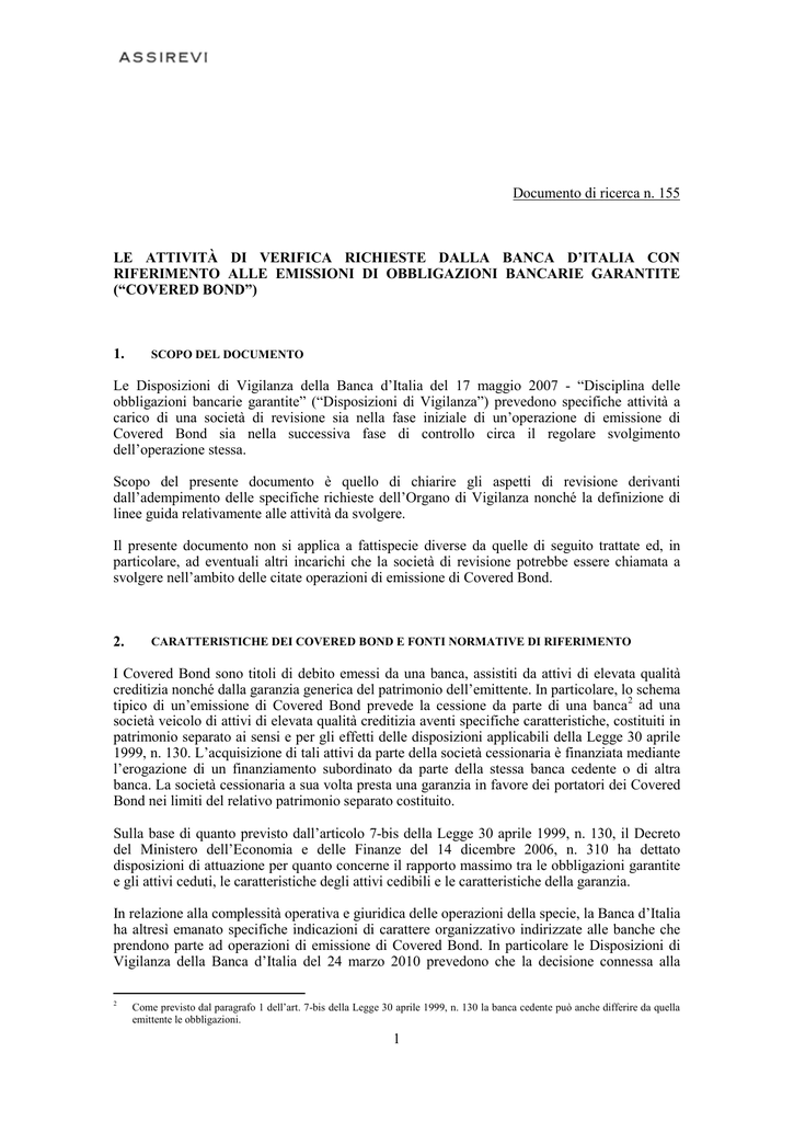 Documento di ricerca n. 155 LE ATTIVITÀ DI VERIFICA RICHIESTE DALLA BANCA D’ITALIA CON RIFERIMENTO ALLE EMISSIONI DI OBBLIGAZIONI BANCARIE GARANTITE (“COVERED BOND”) 1. SCOPO DEL DOCUMENTO Le Disposizioni di Vigilanza della Banca d’Italia del 17 maggio 2007 - “Disciplina delle obbligazioni bancarie garantite” (“Disposizioni di Vigilanza”) prevedono specifiche attività a carico di una società di revisione sia nella fase iniziale di un’operazione di emissione di Covered Bond sia nella successiva fase di controllo circa il regolare svolgimento dell’operazione stessa. Scopo del presente documento è quello di chiarire gli aspetti di revisione derivanti dall’adempimento delle specifiche richieste dell’Organo di Vigilanza nonché la definizione di linee guida relativamente alle attività da svolgere. Il presente documento non si applica a fattispecie diverse da quelle di seguito trattate ed, in particolare, ad eventuali altri incarichi che la società di revisione potrebbe essere chiamata a svolgere nell’ambito delle citate operazioni di emissione di Covered Bond. 2. CARATTERISTICHE DEI COVERED BOND E FONTI NORMATIVE DI RIFERIMENTO I Covered Bond sono titoli di debito emessi da una banca, assistiti da attivi di elevata qualità creditizia nonché dalla garanzia generica del patrimonio dell’emittente. In particolare, lo schema tipico di un’emissione di Covered Bond prevede la cessione da parte di una banca2 ad una società veicolo di attivi di elevata qualità creditizia aventi specifiche caratteristiche, costituiti in patrimonio separato ai sensi e per gli effetti delle disposizioni applicabili della Legge 30 aprile 1999, n. 130. L’acquisizione di tali attivi da parte della società cessionaria è finanziata mediante l’erogazione di un finanziamento subordinato da parte della stessa banca cedente o di altra banca. La società cessionaria a sua volta presta una garanzia in favore dei portatori dei Covered Bond nei limiti del relativo patrimonio separato costituito. Sulla base di quanto previsto dall’articolo 7-bis della Legge 30 aprile 1999, n. 130, il Decreto del Ministero dell’Economia e delle Finanze del 14 dicembre 2006, n. 310 ha dettato disposizioni di attuazione per quanto concerne il rapporto massimo tra le obbligazioni garantite e gli attivi ceduti, le caratteristiche degli attivi cedibili e le caratteristiche della garanzia. In relazione alla complessità operativa e giuridica delle operazioni della specie, la Banca d’Italia ha altresì emanato specifiche indicazioni di carattere organizzativo indirizzate alle banche che prendono parte ad operazioni di emissione di Covered Bond. In particolare le Disposizioni di Vigilanza della Banca d’Italia del 24 marzo 2010 prevedono che la decisione connessa alla 2 Come previsto dal paragrafo 1 dell’art. 7-bis della Legge 30 aprile 1999, n. 130 la banca cedente può anche differire da quella emittente le obbligazioni. 1 partecipazione a singole operazioni o a programmi di emissione di Covered Bond siano precedute, oltre che da una mappatura e valutazione di tutti i rischi legati all’operazione, anche da una preventiva definizione di adeguate procedure di controllo circa la conformità delle suddette operazioni alla normativa di riferimento e da un’analisi di impatto delle stesse sull’equilibrio economico-patrimoniale della banca. In tale contesto le Disposizioni di Vigilanza richiedono in primo luogo che la cessione degli attivi e le successive eventuali integrazioni, siano accompagnate da una attestazione predisposta dalla società di revisione3, da rilasciarsi qualora la cessione degli attivi sia effettuata a valori diversi da quelli di iscrizione nell’ultimo bilancio approvato del cedente su cui sia stato formulato un giudizio di revisione senza rilievi 4. Le citate Disposizioni di Vigilanza prevedono altresì che una società di revisione indipendente rispetto alla banca che conferisce l’incarico e agli altri soggetti partecipanti all’operazione5, assuma il ruolo di Asset Monitor svolgendo specifici controlli finalizzati a verificare la regolarità dell’operazione e l’integrità della garanzia a favore degli investitori. I controlli effettuati e le valutazioni sull’andamento dell’operazione sono oggetto di un’apposita relazione annuale indirizzata anche all’organo con funzione di controllo della banca che ha conferito l’incarico. Delle informazioni fornite e delle valutazioni espresse dall’Asset Monitor se ne avvale anche la funzione di revisione interna della banca emittente e del relativo gruppo, nella verifica almeno annuale che è chiamata a svolgere e i cui risultati sono portati a conoscenza degli organi aziendali. La finalità ed i contenuti delle attività di revisione precedentemente descritte nonché le relative modalità di svolgimento sono illustrate nei paragrafi successivi. 3. LA RELAZIONE DI ATTESTAZIONE SUGLI ATTIVI CEDUTI Come già precedentemente descritto le Disposizioni di Vigilanza prevedono che, a supporto delle deliberazioni concernenti la cessione di attivi, tanto nella fase iniziale di una operazione quanto per la successiva integrazione, la banca cedente richieda alla società di revisione l’emissione di apposita attestazione. In particolare è richiesto che la società di revisione attesti che, sulla base del lavoro svolto, non siano emersi elementi che facciano ritenere che i criteri di valutazione applicati dalla banca cedente per la determinazione del prezzo di cessione degli attivi ceduti non siano conformi a quelli che la stessa è tenuta ad osservare nella redazione del bilancio d’esercizio. Tale attestazione non è richiesta se la cessione è fatta ai valori di iscrizione nell’ultimo bilancio approvato della banca cedente, su cui sia stato formulato un giudizio di revisione senza rilievi da parte della società di revisione. In relazione al contenuto ed alle finalità della citata relazione nonché allo specifico ruolo della socie
