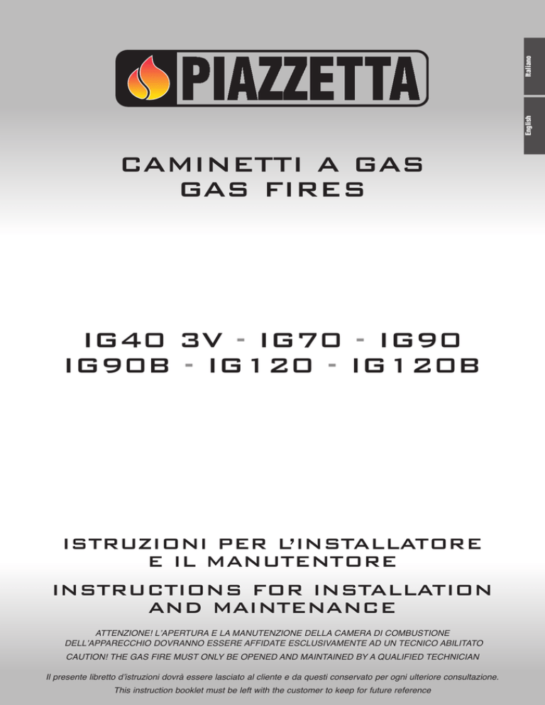 Italiano IG40 3V - IG70 - IG90 IG90B - IG120 - IG120B ISTRUZIONI PER L’INSTALLATORE E IL MANUTENTORE INSTRUCTIONS FOR INSTALLATION AND MAINTENANCE ATTENZIONE! L’APERTURA E LA MANUTENZIONE DELLA CAMERA DI COMBUSTIONE DELL’APPARECCHIO DOVRANNO ESSERE AFFIDATE ESCLUSIVAMENTE AD UN TECNICO ABILITATO CAUTION! THE GAS FIRE MUST ONLY BE OPENED AND MAINTAINED BY A QUALIFIED TECHNICIAN Il presente libretto d’istruzioni dovrà essere lasciato al cliente e da questi conservato per ogni ulteriore consultazione. This instruction booklet must be left with the customer to keep for future reference English CAMINETTI A GAS GAS FIRES DT2011534-01 Italiano PREFAZIONE • Questo libretto di istruzioni è stato redatto dal costruttore e costituisce parte integrante del prodotto. In caso di vendita o trasferimento del prodotto il libretto deve essere sempre ceduto con il prodotto, perché le informazioni in esso contenute sono indirizzate all’acquirente, e a tutte quelle persone che a vario titolo concorrono all’installazione, all’uso e alla manutenzione del prodotto. • Conservare il seguente libretto istruzioni e le istruzioni fornite con i tubi, in un luogo asciutto e facilmente reperibile per future consultazioni • Leggete con attenzione le istruzioni e le informazioni tecniche contenute in questo libretto, prima di procedere all’installazione, all’utilizzo e a qualsiasi intervento sul prodotto. • L’osservanza delle indicazioni contenute nel presente libretto istruzioni garantisce la sicurezza delle persone e delle cose, assicura l’economia di esercizio ed una più lunga durata di funzionamento. • Questo apparecchio è stato progettato, collaudato e omologato in conformità alle norme vigenti in materia di utilizzo, rendimento e sicurezza dei prodotti. • Il Gruppo Piazzetta declina ogni responsabilità per danni causati da una installazione non a regola d’arte secondo normative nazionali, locali e leggi vigenti, o per la inosservanza delle indicazioni riportate nei libretti di istruzioni per l’installazione l’uso e la manutenzione. La manomissione, modifiche non autorizzate sul prodotto da parte del Gruppo Piazzetta, l’installazione di ricambi non originali e l’inosservanza delle indicazioni contenute nel presente libretto istruzioni possono compromettere la sicurezza delle persone e delle cose, ridurre la vita del prodotto e fanno decadere la garanzia. • Le immagini riportate nel presente libretto sono solamente a titolo esplicativo e talvolta possono non rappresentare esattamente il prodotto. Per i termini, limiti ed esclusioni fare riferimento al certificato di garanzia allegato al prodotto. Il costruttore nell’intento di perseguire una politica di costante sviluppo e rinnovamento del prodotto può apportare, senza preavviso alcuno, le modifiche che riterrà opportune. Questo documento è di proprietà del Gruppo Piazzetta S.p.A.; non può essere divulgato totalmente o in parte a terzi senza autorizzazione scritta del Gruppo Piazzetta S.p.A. Il Gruppo Piazzetta S.p.A. si riserva tutti i diritti a rigore di legge. In alcune parti del libretto sono utilizzati i simboli: ATTENZIONE: per azioni che richiedono particolare cautela ed adeguata preparazione. VIETATO: per azioni che NON DEVONO essere assolutamente eseguite. Il Gruppo Piazzetta S.p.A. progetta e costruisce i propri prodotti secondo il Sistema Qualità ISO 9001, inoltre i prodotti sono realizzati in accordo alle normative europee di sicurezza EN, UNI. I prodotti del Gruppo Piazzetta S.p.A. sono omologati CE. 2 H07032060 / DT2002298 - Rev. 03 DT2010187-00 INDICE Titolo . . . . . . . . . . . . . . . . . . . . . . . . . . . . . . . . . . . . . . . . . . . . . . . . . . . . . . . . . . . . . . . . . . . . . . . . . . . . . . . .Pag. 1.0 1.1 1.2 1.3 1.4 1.5 1.6 1.7 1.8 1.9 1.10 1.11 1.12 1.13 1.14 NORME GENERALI . . . . . . . . . . . . . . . . . . . . . . . . . . . . . . . . . . . . . . . . . . . .4 NORME DI RIFERIMENTO . . . . . . . . . . . . . . . . . . . . . . . . . . . . . . . . . . . . . . .4 AVVERTENZE GENERALI . . . . . . . . . . . . . . . . . . . . . . . . . . . . . . . . . . . . . . .4 REGOLE FONDAMENTALI DI SICUREZZA . . . . . . . . . . . . . . . . . . . . . . . . . . .5 CAPACITA’ DI RISCALDAMENTO . . . . . . . . . . . . . . . . . . . . . . . . . . . . . . . . .5 MOVIMENTAZIONE E DISIMBALLO . . . . . . . . . . . . . . . . . . . . . . . . . . . . . . .6 AMBIENTE DI INSTALLAZIONE . . . . . . . . . . . . . . . . . . . . . . . . . . . . . . . . . . .6 ALIMENTAZIONE GAS . . . . . . . . . . . . . . . . . . . . . . . . . . . . . . . . . . . . . . . . . .6 ISOLANTI TERMICI IDONEI . . . . . . . . . . . . . . . . . . . . . . . . . . . . . . . . . . . . .7 DISTANZE MINIME DI SICUREZZA . . . . . . . . . . . . . . . . . . . . . . . . . . . . . . . .7 CONTROPARETE . . . . . . . . . . . . . . . . . . . . . . . . . . . . . . . . . . . . . . . . . . . . . .8 SISTEMA FUMARIO . . . . . . . . . . . . . . . . . . . . . . . . . . . . . . . . . . . . . . . . . . .9 SCARICO A PARETE . . . . . . . . . . . . . . . . . . . . . . . . . . . . . . . . . . . . . . . . . . .10 SCARICO A TETTO . . . . . . . . . . . . . . . . . . . . . . . . . . . . . . . . . . . . . . . . . . . .13 MONTAGGIO PIASTRINA DI RESTRIZIONE . . . . . . . . . . . . . . . . . . . . . . . . .16 2.1 2.2 2.3 2.4 2.5 2.6 2.7 2.8 2.9 2.10 2.11 CARATTERISTICHE E DATI TECNICI . . . . . . . . . . . . . . . . . . . . . . . . . . . . . . .17 DESCRIZIONE APPARECCHIO . . . . . . . . . . . . . . . . . . . . . . . . . . . . . . . . . . .17 DATI TECNICI IG40 3V . . . . . . . . . . . . . . . . . . . . . . . . . . . . . . . . . . . . . . . . .19 DATI TECNICI IG 70 . . . . . . . . . . . . . . . . . . . . . . . . . . . . . . . . . . . . . . . . . . .19 DATI TECNICI IG 90 . . . . . . . . . . . . . . . . . . . . . . . . . . . . . . . . . . . . . . . . . . .20 DATI TECNICI IG 90B . . . . . . . . . . . . . . . . . . . . . . . . . . . . . . . . . . . . . . . . . .20 DATI TECNIC