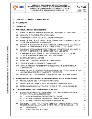 MODALITA’ E CONDIZIONI CONTRATTUALI PER L’EROGAZIONE DA PARTE DI ENEL DISTRIBUZIONE DEL SERVIZIO DI CONNESSIONE ALLA RETE ELETTRICA CON TENSIONE NOMINALE SUPERIORE AD 1 kV DK 5310 Maggio 2006 Ed. I - 1/90 1 OGGETTO ED AMBITO DI APPLICAZIONE 4 2 RIFERIMENTI 6 3 DEFINIZIONI 8 DIVISIONE INFRASTRUTTURE E RETI - INGEGNERIA RETE ELETTRICA 4 PROCEDURA PER LA CONNESSIONE 10 4.1 MODALITA’ PER LA PRESENTAZIONE DELLA RICHIESTA DI ACCESSO 10 4.2 MODALITÀ E TEMPI DI RISPOSTA DI ENEL 11 4.3 TERMINI DI VALIDITA’ DELLA SOLUZIONE PROPOSTA 12 4.4 MODALITÀ PER LA SCELTA DELLA SOLUZIONE PER LA CONNESSIONE DA PARTE DEL SOGGETTO RICHIEDENTE 12 4.5 DISCIPLINA DEGLI IMPIANTI DI RETE PER LA CONNESSIONE NEL CASO DI IMPIANTI DI GENERAZIONE NON SOTTOPOSTI AL D. LGS. 387/03 14 4.6 DISCIPLINA DEGLI IMPIANTI DI RETE PER LA CONNESSIONE NEL CASO DI IMPIANTI DI GENERAZIONE SOTTOPOSTI AL D. LGS. 387/03 14 4.7 ADEMPIMENTI SUCCESSIVI ALL’ACCETTAZIONE DELLA SOLUZIONE TECNICA MINIMA GENERALE PER LA CONNESSIONE 15 4.8 ELABORAZIONE DELLA STMD 16 4.9 STIPULA DEL CONTRATTO PER LA CONNESSIONE 17 4.10 PRESENTAZIONE DI GARANZIE FINANZIARIE 18 4.11 MODALITA’ PER LA REALIZZAZIONE DEGLI IMPIANTI DI RETE PER LA CONNESSIONE 19 4.12 MODALITÀ PER IL PAGAMENTO DEI CORRISPETTIVI DOVUTI A ENEL E PER LA COMUNICAZIONE DELL’AVVENUTO PAGAMENTO 20 4.13 RIEPILOGO DELLE CONDIZIONI ECONOMICHE PER LA CONNESSIONE 21 5 INDIVIDUAZIONE DEI PARAMETRI CARATTERISTICI DELLA CONNESSIONE 22 5.1 INDIVIDUAZIONE DEL PUNTO DI CONNESSIONE 22 5.2 INDIVIDUAZIONE DELLA SOLUZIONE TECNICA CONVENZIONALE 22 5.3 DETERMINAZIONE DEL LIVELLO DI TENSIONE PER LA CONNESSIONE 23 6 CONNESSIONI ALLA RETE DI DISTRIBUZIONE IN AT 24 6.1 SOLUZIONI TECNICHE CONVENZIONALI PER LA REALIZZAZIONE DEGLI IMPIANTI PER LA CONNESSIONE IN AT 6.1.1 CONNESSIONE IN ENTRA-ESCE DA LINEA AT 6.1.2 CONNESSIONE IN ANTENNA DA CABINA PRIMARIA 6.1.3 CONNESSIONE IN DERIVAZIONE DA LINEA AT 24 25 27 29 6.2 STANDARD TECNICI E SPECIFICHE DI PROGETTO ESSENZIALI PER LA REALIZZAZIONE DELL’IMPIANTO DI RETE PER LA CONNESSIONE IN AT 6.2.1 GENERALITA’ 6.2.2 AMBITO DI APPLICAZIONE 31 31 32 MODALITA’ E CONDIZIONI CONTRATTUALI PER L’EROGAZIONE DA PARTE DI ENEL DISTRIBUZIONE DEL SERVIZIO DI CONNESSIONE ALLA RETE ELETTRICA CON TENSIONE NOMINALE SUPERIORE AD 1 kV 6.2.3 6.2.4 6.2.5 6.2.6 DIVISIONE INFRASTRUTTURE E RETI - INGEGNERIA RETE ELETTRICA 6.2.7 6.2.8 6.2.9 6.2.10 6.2.11 6.2.12 6.2.13 6.2.14 6.2.15 6.2.16 6.2.17 DK 5310 Maggio 2006 Ed. I - 2/90 STANDARD TECNICI DEI CONDUTTORI NUDI STANDARD TECNICI DEI CAVI STANDARD TECNICI DEGLI ISOLATORI PER LINEE AEREE STANDARD TECNICI DEI SOSTEGNI 6.2.6.1 Sostegni a traliccio 6.2.6.2 Sostegni monostelo STANDARD TECNICI DELLE FONDAZIONI 6.2.7.1 Fondazioni per tralicci 6.2.7.2 Fondazioni per sostegni monostelo STANDARD TECNICI DELLA CABINA DI CONSEGNA STANDARD TECNICI DELL’IMPIANTO DI CONSEGNA STANDARD TECNICI DELLO STALLO IN C.P. STANDARD TECNICI DEL SEZIONAMENTO PER CONSEGNA ALIMENTAZIONE DEI SERVIZI AUSILIARI DELLA CABINA/IMPIANTO DI CONSEGNA IMPIANTO DI TERRA 6.2.13.1 Collegamenti ad altri impianti di terra IMPIANTO LUCE E FORZA MOTRICE DEL FABBRICATO SERVIZI E DEL BOX MISURE IMPIANTO LUCE ESTERNA INDIVIDUAZIONE DELLE TIPOLOGIE DEGLI IMPIANTI DI RETE PER LA CONNESSIONE CHE POSSONO ESSERE PROGETTATI E REALIZZATI A CURA DEI SOGGETTI RICHIEDENTI AI SENSI DELL’ART. 3.4 GENERALITA’ PER L’IMPIANTO DI UTENZA PER LA CONNESSIONE 7 CONNESSIONI ALLA RETE DI DISTRIBUZIONE IN MT 7.1 SOLUZIONI TECNICHE CONVENZIONALI PER LA REALIZZAZIONE DEGLI IMPIANTI PER LA CONNESSIONE IN MT 7.1.1 CONNESSIONE CON STALLO DA SEZIONE MT DI CABINA PRIMARIA O CENTRO SATELLITE 7.1.2 CONNESSIONE IN ENTRA-ESCE DA LINEA MT 7.1.3 CONNESSIONE CON STALLO DA SBARRA MT DI CABINA SECONDARIA 7.1.4 CONNESSIONE IN DERIVAZIONE DA LINEA MT 7.2 STANDARD TECNICI E SPECIFICHE DI PROGETTO ESSENZIALI PER LA REALIZZAZIONE DELL’IMPIANTO DI RETE PER LA CONNESSIONE IN MT 7.2.1 GENERALITÀ 7.2.2 AMBITO DI APPLICAZIONE 7.2.3 STANDARD TECNICI DEI CONDUTTORI NUDI 7.2.4 STANDARD TECNICI DEI CAVI 7.2.5 STANDARD TECNICI DEGLI ISOLATORI 7.2.6 STANDARD TECNICI DEI SOSTEGNI 7.2.7 STANDARD TECNICI DELLE FONDAZIONI 7.2.8 STANDARD TECNICI PER CABINE ELETTRICHE MT 33 34 35 36 36 36 38 38 39 40 42 43 44 46 47 48 49 49 50 51 52 52 53 55 57 59 60 60 61 62 63 64 66 69 70 MODALITA’ E CONDIZIONI CONTRATTUALI PER L’EROGAZIONE DA PARTE DI ENEL DISTRIBUZIONE DEL SERVIZIO DI CONNESSIONE ALLA RETE ELETTRICA CON TENSIONE NOMINALE SUPERIORE AD 1 kV 7.2.9 DK 5310 Maggio 2006 Ed. I - 3/90 7.2.8.1 Standard tecnici dell’edificio civile 7.2.8.2 Standard tecnici degli impianti di terra 7.2.8.3 Standard tecnici delle apparecchiature elettriche di manovra e di misura in media tensione INDIVIDUAZIONE DELLE TIPOLOGIE DEGLI IMPIANTI DI RETE PER LA CONNESSIONE CHE POSSONO ESSERE PROGETTATI E REALIZZATI A CURA DEI SOGGETTI RICHIEDENTI AI SENSI DELL’ART. 3.4 70 71 73 75 8 MISURA DELL’ENERGIA PRELEVATA DA CLIENTI CONNESSI A RETE DI ALTRO GESTORE 76 ALLEGATO A: FAC-SIMILE DI DOMANDA DI CONNESSIONE 77 DIVISIONE INFRASTRUTTURE E RETI - INGEGNERIA RETE ELETTRICA ALLEGATO B: INDIRIZZI PER LA SPEDIZIONE DELLA DOMANDA DI CONNESSIONE 82 ALLEGATO C: SCHEMA DI CONTRATTO PER LA CONNESSIONE 83 ALLEGATO D: SCHEMA DI CONTRATTO DI FIDEJUSSIONE BANCARIA 84 ALLEGATO E: TEMPI MEDI DI ESECUZIONE DELLE FASI REALIZZATIVE DELLA SOLUZIONE DI CONNESSIONE 86 ALLEGATO F: 88 COSTI UNITARI PER TIPOLOGIA DI IMPIANTO MODALITA’ E CONDIZIONI CONTRATTUALI PER L’EROGAZIONE DA PARTE DI ENEL DISTRIBUZIONE DEL SERVIZIO DI CONNESSIONE ALLA RETE ELETTRICA CON TENSIONE NOMINALE SUPERIORE AD 1 kV 1 DK 5310 Maggio 2006 Ed. I - 4/90 OGGETTO ED AMBITO DI APPLICAZIONE DIVISIONE INFRASTRUTTURE E RETI - INGEGNERIA RETE ELETTRICA Il presente documento definisce le modalità e le condizioni contrattuali per l’erogazione da parte di Enel Distribuzione (nel seguito Enel) del servizio di connessione alle reti elettriche con tensione nominale superiore ad 1 kV con obbligo di connessio