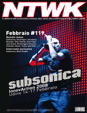 Musica 2 febbraio 2008 / Network Caffè n. 119 / Anno XII / Fax 040370005 / Aut. Trib. TS n. 980 del 9/4/1998 NTWK Aut. Trib. TS 1028 del 22/06/2001 - DIFFUSIONE GRATUITA - Spedizione in A.P. - 70% DC TS FREE PRESS 1 /FEBBRAIO2008 NTWK Musica NTWK FEBBRAIO2008 / 2 119 numero Copertina > Da pagina 4 InnovAction 2008 In copertina: Samuel, voce dei Subsonica Febbraio 2008 Teatro Tel. 040773730 Fax 040370005 www.ntwk.it [email protected] [email protected] Direttore Editoriale Fabio Fieramosca Direttore responsabile Marco Cernaz Redazione di Trieste Laura Moretuzzo Coordinatrice testi Set grafico Marco Kirchmayr Impaginazione Sergio Zennaro Hanno collaborato Daniele Cattonar, Mitti Cavallar, Roberto Vidali, Electrosacher, Elisa Marzi, Ricky e Elisa Russo, Andrea Rodriguez, Walter Specogna, Corrado Premuda, Cinematic, Denis Furlan, Bostjan Romano, Alberto Zamattio, Matteo Caenazzo, Lorenzo De Vecchi. Tutti gli uffici stampa e agenzie grafiche di competenza, che ringraziamo come sempre di cuore. Direttore creativo Fabio Fieramosca Ufficio Redazionale 34122 Trieste, piazza San Giovanni 3 Stampa Tipografia Villaggio del Fanciullo - Trieste Distribuzione in esclusiva Matras srl - Logistica & trasporti Alcune immagini e testi riprodotti sono usati a scopo informativo e divulgativo e mantengono il © dei rispettivi detentori. La responsabilità su giudizi ed opinioni espressi negli articoli è esclusivamente di chi li ha firmati o siglati e non necessariamente della direzione o della proprietà editrice. Le date dei concerti possono subire variazioni o errori di stampa: decliniamo ogni responabilità ed invitiamo ad usare le info disponibili. È vietata la riproduzione anche parziale dei testi o delle immagini senza espressa autorizzazione della casa editrice. Questo numero è stato chiuso per la stampa il 29 gennaio 2008. Distribuzione gratuita > Da pagina 6 I principali spettacoli e tutti i cartelloni Chamber Music Teatro dell’Elfo Pomeriggi d’Inverno Visti dalla platea Intervista a Moni Ovadia contenuti Relax > Da pagina 36 Recensuoni Comics Bookcrossing Zoom dvd Gente simpatica La città brucia Zapping > Da pagina 32 Il 700 sulle tavole goriziane San Valentino Arte > Da pagina 16 Spot art Intervista a Luca Bidoli Musica Schermi > Da pagina 20 Alpi Giulie Cinema Cappella Underground Trieste Film Festival Musica > Da pagina 22 Concertoni del mese Intervista ai Subsonica Jazz Koinè Sachernews Groovebox Helpiscoming > Da pagina 41 Etnoblog Session Le date del nord Italia e del Friuli Venezia Giulia al 100%. Trenchtown Rock Le date possono variare o essere annullate, quindi consultate le info. Sistema Network Caffè Copertina InnovAction 2008 Salone della conoscenza, delle idee e dell’innovazione al servizio delle imprese Dal 14 al 17 febbraio 2008 torna a Udine Fiere InnovAction, l’annuale appuntamento con le ultime frontiere dell’innovazione, promosso e organizzato dalla Regione Autonoma FVG con Udine e Gorizia Fiere e con l’Università degli Studi di Udine. Giunta alla terza edizione, dedicata quest’anno al tema più che mai attuale della Qualità della Vita, InnovAction è una fondamentale occasione d’incontro, sinergica e positiva contaminazione tra il mondo della ricerca (nelle sue molteplici accezioni, dai laboratori agli incubatori di imprese, dai parchi scientifici e tecnologici alle università), e quello delle imprese e della finanza. Secondo la formula collaudata e premiata negli anni da un successo di pubblico sempre crescente, anche quest’anno allo spazio espositivo – che si compone di due sezioni: la Piazza delle Idee, in cui vengono presentate proposte ancora alla ricerca di partner e finanziatori, e la Piazza dell’Innovazione, con l’opportunità di conoscere e testare nuovi prodotti, processi e servizi, alcuni dei quali già in commercio, altri allo stadio di prototipo avanzato NTWK FEBBRAIO2008 / 4 – si affianca quello congressuale della Piazza della Conoscenza, momento di confronto e condivisione di esperienze. Non mancheranno i Corner, “isole” di innovazione al confine tra stand e laboratori interattivi, spazi a disposizione degli espositori per presentare in maniera dinamica prodotti, progetti, brevetti e idee. Particolarmente ricco e qualificato il programma degli incontri, che ruota tutto intorno al filo conduttore della qualità della vita, proponendosi di indagare le molteplici sfaccettature dello sviluppo scientifico, tecnologico ed economico e le fondamentali implicazioni che esso ha nell’esistenza quotidiana degli abitanti del pianeta. Gli eventi, oltre all’intervento in videocollegamento dell’inventore e futurologo Raymond Kurzweil, prevedono la partecipazione di autorevoli personalità del panorama dell’innovazione italiana e internazionale, come il premio Nobel per la Fisica 1998 Robert Laughlin, i genetisti William Haseltine e Michael Morgan, il presidente del Comitato Nazionale per la Bioetica Francesco Paolo Casavola, il co-ideatore del World Wide Web Robert Cailliau, il direttore del Biomechatronics Group del Media Lab Hugh Herr, gli esperti di economia ambientale Bernard Barraqué e Meine-Pieter van-Dijk, Neil Gerschenfeld del Bits and Atoms Center MIT, il genetista e biologo dell’Università Vita-Salute San Raffaele di Milano Edoardo Boncinelli, il Direttore Generale del Ministero dell’Ambiente e della Tutela del Territorio Corrado Clini, l’esperto di bioetica e docente di Storia della Medicina presso l’Università La Sapienza di Roma Gilberto Corbellini, l’esperto internazionale di rifiuti e docente di ingegneria ambientale presso l’Università di Padova Raffaello Cossu, il direttore scientifico del Kyoto Club Gianni Silvestrini, l’ideatrice del Network Innoversity Susanne Justesen, l’esperto di economia energetica Philip Verleger, che dialoga con Kathleen Kennedy e Jaremy Leggett sui temi della crescita economica e della compatibilità ambientale. Di particolare rilievo la presenza istituzionale che vede, ol