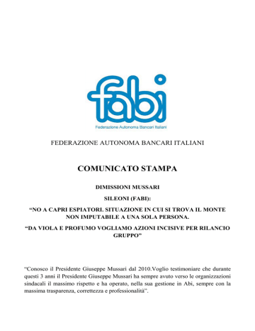 FEDERAZIONE AUTONOMA BANCARI ITALIANI COMUNICATO STAMPA DIMISSIONI MUSSARI SILEONI (FABI): “NO A CAPRI ESPIATORI. SITUAZIONE IN CUI SI TROVA IL MONTE NON IMPUTABILE A UNA SOLA PERSONA. “DA VIOLA E PROFUMO VOGLIAMO AZIONI INCISIVE PER RILANCIO GRUPPO” “Conosco il Presidente Giuseppe Mussari dal 2010.Voglio testimoniare che durante questi 3 anni il Presidente Giuseppe Mussari ha sempre avuto verso le organizzazioni sindacali il massimo rispetto e ha operato, nella sua gestione in Abi, sempre con la massima trasparenza, correttezza e professionalità”. Questo il commento del Segretario generale della FABI, Lando Maria Sileoni, a proposito delle dimissioni del Presidente dell’Abi Giuseppe Mussari. “Non vorrei che si stesse cercando un capro espiatorio per attenuare molteplici responsabilità, attribuibili sia alla politica nazionale sia a quella locale, anche perchè non credo che la difficile situazione in cui si trova oggi il Monte dei Paschi possa essere imputabile a una sola persona”. “Dov’era la politica? Dov’erano i consiglieri d’amministrazione? Dov’era la Fondazione, quando negli ultimi anni il Monte dei Paschi affondava?” “Ci aspettiamo da Alessandro Profumo e Fabrizio Viola, rispettivamente presidente e amministratore delegato della banca, azioni incisive per il rilancio dell’azienda a tutela dei lavoratori del Gruppo, delle famiglie, della clientela e dei territori”. Info: Flavia Gamberale Addetta Stampa FABI Cell. 339/4004306