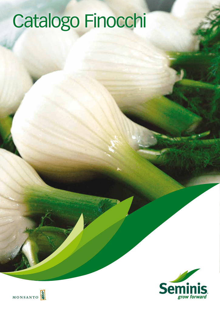 Catalogo Finocchi Seminis Seminis è il marchio leader di Monsanto in oltre 150 Paesi in tutto il mondo, nella ricerca, produzione e commercializzazione di sementi orticole professionali per il pieno campo e per serra non riscaldata. Seminis vanta un’altissima esperienza e professionalità sul mercato, oggi ancora più forte grazie all’eredità di alcuni importanti marchi leader nel campo della ricerca e sviluppo di semi ibridi. La gamma Seminis include nuove varietà di sementi orticole in oltre 20 colture di pieno campo e serra, con caratteristiche e qualità che ben si adattano alle esigenze del produttore e del consumatore locale. Grazie ai significativi investimenti in ricerca e sviluppo, Monsanto è in grado di migliorare costantemente la produttività e la qualità dei propri prodotti, contraddistinguendosi per essere un’azienda innovatrice al fianco del produttore. Con Seminis, Monsanto intende contribuire al successo dei propri clienti, e soddisfare in tempi rapidi le esigenze di tutta la filiera produttiva, dall’agricoltore all’industria di trasformazione, per arrivare sulle tavole del consumatore finale. Seminis è il marchio di Monsanto che si posiziona come Partner affidabile per un’agricoltura produttiva, di qualità e sostenibile. Per maggiori informazioni: www.seminis.it Signs of success TECNOLOGIA DIALOGO INNOVAZIONE Migliorare la nostra gamma di prodotti con nuovi metodi e tecnologie. Dialogare con i clienti per trovare insieme le migliori soluzioni. Utilizzare al massimo le nostre capacità per offrire prodotti a valore aggiunto. PARTNERSHIP SOSTENIBILITÀ Collaborare con i partner di filiera per raggiungere i migliori risultati. Contribuire al successo degli agricoltori nel raggiungimento di una produzione redditizia e sostenibile per l’ambiente. VISIONE A LUNGO TERMINE Anticipare i trend di mercato per soddisfare il fabbisogno del cliente contribuendo al successo della sua attività. La Ricerca Genetica Monsanto si dedica alla ricerca e innovazione, investendo oltre 200 milioni di dollari l’anno nello sviluppo di nuove varietà orticole e vanta 60 stazioni di ricerca in 17 Paesi nel mondo. I breeder Monsanto utilizzano tecniche tradizionali di miglioramento genetico con l’ausilio di numerosi marcatori molecolari e sofisticati laboratori di qualità, al fine di soddisfare in tempi rapidi le esigenze dell’intera filiera produttiva. FINOCCHI | 2 Finocchi Ibridi Pompeo F1 Qualità e quantità senza confronto EX 06067133, ibrido atunno-invernale a ciclo medio, adatto per trapianti dal 15 agosto per produzioni da inizio novembre a tutto gennaio. Pianta molto rustica a canne erette, con grumoli dal colore bianco candido, dall’elevato peso specifico e dall’ottima qualità. Eccezionale tenuta alla sovramaturazione in campo e post-raccolta. CARATTERISTICHE Fittone dal diametro piccolo Pianta di media vigoria, eretta Grumolo di eccellente qualità e gusto VANTAGGI Ottima tenuta post-raccolta Sanità pianta Eccellente produzione per ha Eccellente presentazione in post-lavorazione BENEFICI Flessibilità temporale di raccolta Minori rischi per i coltivatori Elevata redditività per ha Eccezionale qualità sullo scaffale Il preferito da produttori, grande distribuzione e consumatori: • • • Produttività senza pari Sanità della pianta eccezionale Shelf life sopra la media Calendario colturale estivo - autunno - invernale GEN FEB MAR Periodo consigliato: APR MAG Semina GIU LUG AGO SET OTT NOV DIC Raccolta 1 1,5 2 2,5 3 3,5 4 4,5 5 5,5 6 6,5 7 7,5 8 8,5 9 Accostamento fogliare 1 = eccellente 9 = scarso Peso Archimede Diametro del fittone Qualità delle canne Fen 5 Sanità della pianta Pompeo Le descrizioni e i dati riportati su questa pagina sono puramente indicativi 3 | FINOCCHI Finocchi Ibridi Tiberio F1 Finocchio estivo precocissimo Ibrido estivo a ciclo precocissimo, per semine dal 25 giugno in tutta Italia. Pianta compatta di medio vigore, con fogliame scuro, di ottima sanità. Uniformità molto elevata con grumolo molto rotondo, bianco ed attraente, dal buon peso specifico. Calendario colturale estivo - autunno - invernale GEN FEB MAR APR MAG GIU LUG AGO SET OTT NOV DIC Sud e Isole Fucino Nord Periodo consigliato: Semina Raccolta Archimede F1 Qualità e resa a inizio stagione Ibrido autunnale, a ciclo precoce, per semina dal 20 luglio a metà agosto nel centro-sud Italia. Pianta sana e vigorosa, dall’elevata uniformità, con canne di diametro medio e grumolo molto rotondo, bianco ed attraente, dal buon peso specifico. Eccellenti qualità organolettiche. Calendario colturale estivo - autunno - invernale GEN FEB MAR Periodo consigliato: APR MAG Semina GIU LUG AGO SET OTT NOV DIC Raccolta Pitagora F1 Bello e attraente Ibrido autunno-invernale, a ciclo medio, per semine ad agosto nel centro-sud Italia. La pianta è vigorosa e rustica, dalle canne, dritte e di grosso diametro, che conferiscono al prodotto finito un aspetto molto attraente. Eccellente uniformità. Grumolo rotondo, di elevata pezzatura e di facile lavorazione commerciale. La pasta è bianca e tenera, priva di fibra. Ottima tenuta alla sovramaturazione. Calendario colturale estivo - autunno - invernale GEN FEB MAR APR MAG GIU LUG AGO SET OTT NOV DIC Sud e Isole Nord Periodo consigliato: Semina Raccolta Le descrizioni e i dati riportati su questa pagina sono puramente indicativi FINOCCHI | 4 Finocchi Ibridi Dorico F1 Tardivo resistente al freddo Ibrido autunno-invernale, a ciclo tardivo, per trapianti a settembre e ottobre. Pianta sana, eretta e di medio vigore, molto tollerante al gelo, di colore verde scuro dalle canne piene di medio diametro. Elevata uniformità. Grumolo composto dall’elevato peso specifico, con fibra evidente, e dall’ottimo colore e sapore. Calendario colturale estivo - autunno - invernale GEN FEB MAR Periodo consigliato: APR MAG Semina GIU LUG AGO SET OTT NOV DIC Raccolta Aurelio F1 Tardivo rotondo, bianco e pesante Ibrido autunno-invernale, a ciclo medio-tardivo