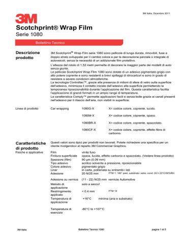 3M Italia, Dicembre 2011 Scotchprint® Wrap Film Serie 1080 Bollettino Tecnico Descrizione prodotto 3M Scotchprint® Wrap Film serie 1080 sono pellicole di lunga durata, rimovibili, fuse a doppio strato sviluppate per il cambio colore e per la decorazione parziale o integrale di autoveicoli, senza la necessità di un addizionale film protettivo. L’altezza del rotolo di 1,52 metri permette di decorare la maggior parte dei modelli di auto senza giunte. Le pellicole Scotchprint Wrap Film 1080 sono dotate di un adesivo pigmentato grigio con alto potere coprente e sono resistenti a brevi spillaggi di idrocarburi e sono in grado di resistere a severe condizioni atmosferiche. La tecnologia Controltac™, grazie alla presenza di milioni di sfere di vetro sulla superficie dell’adesivo, minimizza il contatto iniziale dell’adesivo alla superficie permettendo la temporanea riposizionabilità durante l’applicazione del film. Questa caratteristica facilita l’applicazione di grandi formati in un ampio range di temperatura. La caratteristica Comply™ permette applicazioni facili e senza bolle grazie ai canali presenti nell’adesivo per il rilascio dell’aria, non visibili in superficie. Linea di prodotto Car wrapping 1080G-X X= codice colore, coprente, lucido. 1080M-X X= codice colore, coprente, opaco. 1080BR-X X= codice colore, coprente, spazzolato. 1080CF-X X= codice colore, coprente, effetto fibra di carbonio. Caratteristiche di prodotto Questi valori sono tipici per prodotti non lavorati. Potete richiedere una specifica per un cliente rivolgendovi al reparto 3M Commercial Graphics. Fisiche e applicative Film Finitura superficiale Spessore (film) Tipo adesivo Colore adesivo Liner Adesione vinile fuso opaca, lucida, effetto carbonio e spazzolato. (Vedere linea prodotto) 90 µm (0.09 mm) acrilico solvente a pressione, riposizionabile pigmentato grigio in carta, politenata su entrambi i lati FTM 1: 180° peel, substrato: vetro; cond: 24 h 23°C/50%RH 20 N/25 mm Adesione su vernice (11 - 22) N/25 mm vernicie Automotive Metodo di applicazione Restringimento applicato Temperatura di applicazione solo a secco! Temperatura di esercizio -60°C to +107°C 3M Italia FTM 14 < 0.4 mm +16°C minima (aria e substrato) Bollettino Tecnico 1080 pagina 1 di 5 Superfici di applicazioni Supporti di applicazioni Rimozione piane, semplice curve e curve moderatamente complesse tipiche delle autovetture. alluminio, vetro, PMMA, PC*, ABS, vernice. * Il policarbonato può essere soggetto a emissione di gas (outgassing) e potrebbe esserne necessaria l’asciugatura in forno prima dell’uso per evitare la formazione di bolle sotto la pellicola (fare riferimento alle istruzioni del produttore). Rimovibile con calore e/o prodotti chimici dai supporti raccomandati. Le operazioni e la tempistica di rimozione del film 3M serie 1080 sono condizionate da molti fattori, quali: temperatura dell’aria e della superficie di applicazione, periodo intercorso dall’applicazione, metodo utilizzato e tipo di superficie. Quindi il tempo e la velocità di rimozione del film non sono quantificabili né assicurati da 3M. Residui di adesivo sono possibili e possono essere rimossi con Industrial Cleaner o Adesive Remover 231 3M. Conservazione a magazzino Scadenza Condizioni di magazzino 2 anni dalla data riportata sulla confezione originale. Il film deve essere applicato entro 1 anno dalla lavorazione e comunque entro 2 dalla ricezione. +4°C to +40°C, non esposto ai raggi solari, imballo originale in area pulita e asciutta. Non conservare mai i rotoli appoggiati orizzontalmente a contatto con una superficie per evitare fenomeni di opacizzazione. Infiammabilità Per maggiori informazioni contattare il reparto Commercial Graphics. Durabilità Non lavorato La seguente durata è intesa per il materiale non lavorato. Zone climatiche La durabilità di una grafica è significativamente determinata dal clima e dall’angolo di esposizione. La tabella seguente mostra la durabilità del prodotto in base all’angolo di esposizione e alla locazione geografica dell’applicazione dell applicazione. Zona 1 Nord Europa, Italia (nord di roma inclusa) Zona 2 Sud di Roma, isole incluse Zone 3 Area Golfo, Africa Tipi di esposizione Verticale Grafica ± 10° dalla verticale Non verticale Grafica con angolo maggiore di 10° dalla verticale e con angolo maggiore di 5° dall’orizzontale. Questo include superfici non verticali di autoveicoli, flotte di furgoni e rimorchi. Orizzontale Grafica ± 5° dall’orizzontale 3M Italia Bollettino Tecnico 1080 pagina 2 di 5 Esposizione verticale in esterno bianco/nero colorati metallici Zona 1 Zona 2 Zona 3 6 anni 5 anni 5 anni 4 anni 3 anni 3 anni 3 anni 2.5 anni 2.5 anni Esposizione non verticale in esterno Bianco/nero colori metallici Zona 1 Zona 2 Zona 3 4 anni 3 anni 3 anni 2.5 anni 1.5 anni 1.5 anni 2 anni 12 mesi 12 mesi Esposizione orizzontale in esterno bianco/nero colorati metallici Zona 1 Zona 2 Zona 3 3 anni 2 anni 2 anni 2 anni 12 mesi 12 mesi 12 mesi 6 mesi 6 mesi Importante La dichiarazione di durabilità si intende per tutti i film inclusi il metallo spazzolato e fibra di carbonio. 3M Performance Guarantee e MCS™ In aggiunta, 3M fornisce una garanzia per la grafica applicata denominata programma 3M Performance Guarantee e/o 3M MCS™. Durabilità Garantita Per la durabilità garantita del prodotto consultare le tabelle 3M MCS sul sito www.soluzionigrafiche3m.it. Limitazioni di utilizzo Specificatamente, non si garantiscono queste pellicole per le seguenti applicazioni: Grafiche applicate a - Rimozione grafiche da - segnali e grafiche sottostanti che devono rimanere intatte. - veicoli che non hanno la vernice originale OEM Grafiche soggette a - a regolare esposizione al spillaggio o a vapori di idrocarburi. - intaglio e sfridatura dove l’application tape deve aderire al liner esposto. Importante - le pellicole Scotchprint 1080 non sono testate per il settore Automotive. supporti con bassa energ