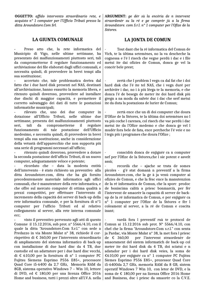 OGGETTO: affido intervento straordinario rete, e acquisto n° 1 computer per l’Ufficio Tributi presso la ditta Aroundstore.Com Srl. ARGUMENT: ge dèr sù la encèria de n intervent straordenèr su la ré e ge comprèr jù a la firma Aroundstore. com S.r.l. n° 1 computer per l’Ofize de la Stéores. LA GIUNTA COMUNALE LA JONTA DE COMUN Preso atto che, la rete informatica del Municipio di Vigo, nelle ultime settimane, ha presentato dei malfunzionamenti piuttosto seri, tali da comprometterne il regolare funzionamento ed archiviazione dei file elaborati dagli uffici comunali, e necessita quindi, di provvedere in brevi tempi alla sua sostituzione; accertato che, tale problematica deriva dal fatto che i due hard disk presenti nel NAS, destinati all’archiviazione, hanno esaurito la memoria libera, e ritenuto quindi doveroso, provvedere ad installare due dischi di maggior capacità, e permettere il corretto salvataggio dei dati di tutte le postazioni informatiche municipali; rilevato che, uno dei due computer in dotazione all’Ufficio Tributi, nelle ultime due settimane, presenta dei malfunzionamenti piuttosto seri, tali da comprometterne il regolare funzionamento di tale postazione dell’Ufficio medesimo, e necessita quindi, di provvedere in brevi tempi alla sua sostituzione, anche in considerazione della vetustà dell’apparecchio che non supporta più una serie di programmi necessari all’ufficio; ritenuto quindi doveroso, provvedere a dotare la seconda postazione dell’ufficio Tributi, di un nuovo computer, adeguatamente veloce e potente; ricordato che – data la modesta entità dell’intervento - è stato richiesto un preventivo alla ditta Aroundstore.com, ditta che ha già fornito precedentemente materiale informatico agli uffici comunali, che è manutentore della rete informatica, e che offre sul mercato computer di ottima qualità a prezzi competitivi, per effettuare l’intervento di incremento della capacità dei server di back-up della rete informatica comunale, e per la fornitura di n°1 computer per l’ufficio Tributi ed al relativo collegamento al server, alla rete interna comunale ecc; visto il preventivo pervenuto agli atti di questo Comune il 15.12.2016, sub prot. n° 5566/4.10, con il quale la ditta “Aroundstore.Com S.r.l.” con sede a Predazzo in via Monte Mulat n° 38, richiede il corrispettivo di € 360,00 per l’intervento straordinario di ampliamento del sistema informatico di back-up con installazione di due hard disc da 4 TB, due custodie ed un adattatore per i due hard disc vecchi, di € 610,00 per la fornitura di n° 1 computer PC Fujitsu Siemens Esprimo P556 E85+, processore Quad Core i5-6400 da 2,7 GHz, Memoria RAM da 8GB, sistema operativo Windows 7 – Win 10, lettore di DVD, ed € 180,00 per una licenza Office 2016 Home and business, tutti i prezzi oltre all’I.V.A. nella Tout dant che la ré informatica del Comun de Vich, te la ùltima setemènes, no la va descheche la cognessa e l’é l rìsech che vegne perdù i dac e i file metui ite dai ofizies de Comun, donca ge vel la concèr bele prest; zertà che l problem l vegn ca dal fat che i doi hard disk che l’é ite tel NAS, che i vegn duré per archivièr i dac, no i à più lèrga te la memoria, e che donca l’é de besegn de meter ite doi hard disk più gregn a na moda da salvèr duc i dac che serf metui ite da duta la postazions de lurier de Comun; zertà ence che un di doi computer che doura ll’Ofize de la Stéores, te la ùltima doi setemènes no l va più coche l carenea, col rìsech che vae perdù i dac metui ite da l’Ofize medemo e che donca ge vel l mudèr fora bele de fata, ence percheche l’é veie e no l tegn più i programes che doura l’Ofize ; conscidrà donca de enjignèr ca n computer nef per l’Ofize de la Stéores,che l sie potent e asvelt assà; recordà che – ajache se trata de somes pìcoles - g’é stat domanà n preventif a la firma Aroundstore.com, che la ge à ja venù computer ai ofizies de Comun, e che la fèsc ence la manutenzion de la ré informatica de Comun, che la sporc prodoc de boniscima calità a priesc bonmarcià, per fèr l’intervent de smaorèr la capazità di server de backup de la ré informatica de Comun, e per enjignèr ca n° 1 computer per l’Ofize de la Stéores e fèr l coleament al server, a la ré de Comun e coscita inant; vardà fora l preventif ruà te protocol de Comun ai 15.12.2016 sub prot. N° 5566/4.10, con chel che la firma “Aroundstore.Com s.r.l.” con senta ja Pardac, via Monte Mulat n° 38, la met fora l priesc de € 360,00 per l’intervent straordenèr de smaorament del sistem informatich de back-up col meter ite doi hard disk da 4 TB, doi sciatui e n adatador per i doi hard disk veies, la soma de €610,00 per enjignèr ca n° 1 computer PC Fujitsu Siemes Esprimo P556 E85+, prozessor Quad Core i5-6400da 2,7 GHz, memoria RAM da 8 GB, sistem operatif Windows 7 Win 10, con letor de DVD, e la soma de € 180,00 per na lizenza Office 2016 Home and Business, duc i priesc da smaorèr co la C.V.E. misura di legge; ritenuto quindi opportuno e conveniente, affidare l’esecuzione dell’intervento straordinario di ampliamento del sistema informatico di back-up con installazione di due hard disc da 4 TB, due custodie ed un adattatore Usb serial Ata per i due hard disc vecchi, la fornitura di n° 1 computer Fujitsu Siemens Esprimo P556 E85+, dotato di processore Quad Core i5-6400 da 2,7 GHz, Memoria RAM da 8GB, sistema operativo Windows 7 – Win 10, lettore di DVD, e una licenza Office 2016 Home and business, all’impresa “Aroundstore.Com Srl” con sede a Predazzo in via Monte Mulat n° 38, verso il corrispettivo complessivo di € 1.403,00; dato atto che sono stati espressi favorevolmente i pareri richiesti dall’art. 81, comma 1, del T.U.LL.RR.O.C.; visto e richiamato il T.U.LL.RR.O.C., approvato con D.P.Reg. 01.02.2005, n° 3/L e ss.mm.; con voti favorevoli unanimi espressi nelle forme di legge, DELIBERA aldò de