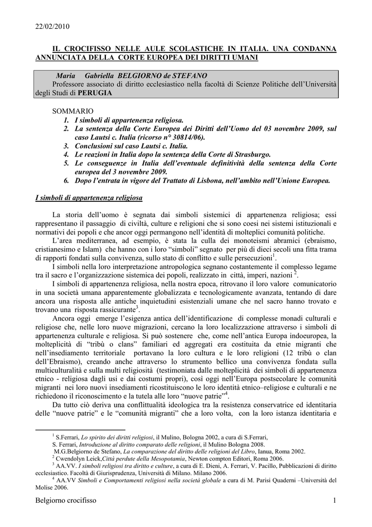 22/02/2010 IL CROCIFISSO NELLE AULE SCOLASTICHE IN ITALIA. UNA CONDANNA ANNUNCIATA DELLA CORTE EUROPEA DEI DIRITTI UMANI Maria Gabriella BELGIORNO de STEFANO Professore associato di diritto ecclesiastico nella facoltà di Scienze Politiche dell’Università degli Studi di PERUGIA SOMMARIO 1. I simboli di appartenenza religiosa. 2. La sentenza della Corte Europea dei Diritti dell’Uomo del 03 novembre 2009, sul caso Lautsi c. Italia (ricorso n° 30814/06). 3. Conclusioni sul caso Lautsi c. Italia. 4. Le reazioni in Italia dopo la sentenza della Corte di Strasburgo. 5. Le conseguenze in Italia dell’eventuale definitività della sentenza della Corte europea del 3 novembre 2009. 6. Dopo l’entrata in vigore del Trattato di Lisbona, nell’ambito nell’Unione Europea. I simboli di appartenenza religiosa La storia dell’uomo è segnata dai simboli sistemici di appartenenza religiosa; essi rappresentano il passaggio di civiltà, culture e religioni che si sono coesi nei sistemi istituzionali e normativi dei popoli e che ancor oggi permangono nell’identità di molteplici comunità politiche. L’area mediterranea, ad esempio, è stata la culla dei monoteismi abramici (ebraismo, cristianesimo e Islam) che hanno con i loro “simboli” segnato per più di dieci secoli una fitta trama di rapporti fondati sulla convivenza, sullo stato di conflitto e sulle persecuzioni1. I simboli nella loro interpretazione antropologica segnano costantemente il complesso legame tra il sacro e l’organizzazione sistemica dei popoli, realizzato in città, imperi, nazioni 2. I simboli di appartenenza religiosa, nella nostra epoca, ritrovano il loro valore comunicatorio in una società umana apparentemente globalizzata e tecnologicamente avanzata, tentando di dare ancora una risposta alle antiche inquietudini esistenziali umane che nel sacro hanno trovato e trovano una risposta rassicurante3. Ancora oggi emerge l’esigenza antica dell’identificazione di complesse monadi culturali e religiose che, nelle loro nuove migrazioni, cercano la loro localizzazione attraverso i simboli di appartenenza culturale e religiosa. Si può sostenere che, come nell’antica Europa indoeuropea, la molteplicità di “tribù o clans” familiari ed aggregati era costituita da etnie migranti che nell’insediamento territoriale portavano la loro cultura e le loro religioni (12 tribù o clan dell’Ebraismo), creando anche attraverso lo strumento bellico una convivenza fondata sulla multiculturalità e sulla multi religiosità (testimoniata dalle molteplicità dei simboli di appartenenza etnico - religiosa dagli usi e dai costumi propri), così oggi nell’Europa postsecolare le comunità migranti nei loro nuovi insediamenti ricostituiscono le loro identità etnico–religiose e culturali e ne richiedono il riconoscimento e la tutela alle loro “nuove patrie”4. Da tutto ciò deriva una conflittualità ideologica tra la resistenza conservatrice ed identitaria delle “nuove patrie” e le “comunità migranti” che a loro volta, con la loro istanza identitaria e 1 S.Ferrari, Lo spirito dei diritti religiosi, il Mulino, Bologna 2002, a cura di S.Ferrari, S. Ferrari, Introduzione al diritto comparato delle religioni, il Mulino Bologna 2008. M.G.Belgiorno de Stefano, La comparazione del diritto delle religioni del Libro, Ianua, Roma 2002. 2 Cwendolyn Leick,Città perdute della Mesopotamia, Newton compton Editori, Roma 2006. 3 AA.VV. I simboli religiosi tra diritto e culture, a cura di E. Dieni, A. Ferrari, V. Pacillo, Pubblicazioni di diritto ecclesiastico. Facoltà di Giurisprudenza, Università di Milano. Milano 2006. 4 AA.VV Simboli e Comportamenti religiosi nella società globale a cura di M. Parisi Quaderni –Università del Molise 2006. Belgiorno crocifisso 1 22/02/2010 religiosa, entrano in conflitto sistemico sia con le “nuove patrie”, sia con le altre “comunità migranti”. A questo conflitto ha tentato di dare una soluzione l’Europa dei diritti umani nata dal Consiglio d’Europa nel 1949 ed ancora oggi l’Europa dei diritti fondamentali dell’Unione Europea (dopo l’entrata in vigore del Trattato di Lisbona, il 1° dicembre 2009), con i suoi postulati fondanti, tra cui la laicità, la tolleranza, la democrazia, l’integrazione e la cooperazione soprattutto nei confronti delle minoranze. Si ricorda che il problema della garanzia della multiculturalità e multi religiosità in Europa è stato da tempo segnalato dal Consiglio d’Europa che il 4 ottobre del 2005 nella sua Assemblea Parlamentare nel rapporto “educazione e religione” (André Schneider) segnalava il ruolo fondamentale dell’educazione nella costruzione di una cittadinanza attiva in modo che il cittadino fosse in grado di vivere in una società democratica multiculturale e plurireligiosa. Tale educazione deve prevedere anche l’integrazione della propria cultura con le religioni degli altri, al fine di favorire il rispetto della dignità della persona non in quanto credente, ma in quanto persona (pluralismo, tolleranza, giustizia solidarietà e non discriminazione). Le istanze conservatrici emergenti nei diversi contesti nazionali europei dimenticano, nel loro programma di autodifesa, l’obbligo di garantire nelle proprie comunità politiche i diritti fondamentali della persona e la tutela della sua dignità derivante dal dettato della Convenzione Europea dei Diritti dell’Uomo (del 4 novembre 1950) e vedono nel crescente fenomeno migratorio e nell’emersione di tante e diverse identità culturali e religiose la perdita della loro identità storicoreligiosa; non ricordando, però, che il fenomeno migratorio europeo è iniziato con la fine del colonialismo allorché ai cittadini delle colonie è stata riconosciuta la cittadinanza da buona parte dei paesi colonizzatori europei. In seguito l’Europa, per ragioni di ricostruzione postbellica ha richiesto forze-lavoro dai paesi ex-coloniali e molte persone alla ricerca di un potenziale be