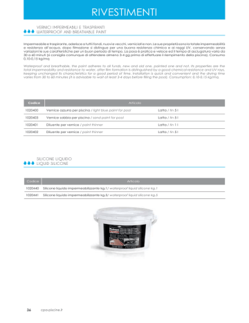 RIVESTIMENTI VERNICI IMPERMEABILI E TRASPIRANTI WATERPROOF AND BREATHABLE PAINT Impermeabile e traspirante, aderisce a tutti i fondi, nuovi e vecchi, verniciati e non. Le sue proprietà sono la totale impermeabilità H UHVLVWHQ]D DOO·DFTXD GRSR ÀOPD]LRQH VL GLVWLQJXH SHU XQD EXRQD UHVLVWHQ]D FKLPLFD e ai raggi UV, conservando senza variazioni le sue caratteristiche per un buon periodo di tempo. La posa è pratica e veloce ed il tempo di asciugatura varia da 30 a 60 minuti (si consiglia comunque di attendere almeno 3-4 gg prima di effettuare il riempimento della piscina). Consumo 0,10-0,15 kg/mq Waterproof and breathable, the paint adheres to all funds, new and old one, painted one and not. Its properties are the total iPperPeabilit\ and resistanFe to water, after ÀlP forPation is distinJuished b\ a Jood FhePiFal resistanFe and 89 ra\s, keeping unchanged its characteristics for a good period of time. Installation is quick and convenient and the drying time varies from to minutes it is advisable to wait at least days before Àlling the pool. &onsumption ,, kgmq. Codice Articolo 1020400 Vernice azzurra per piscina / light blue paint for pool Latta / tin 5 l 1020403 Vernice sabbia per piscina / sand paint for pool Latta / tin 5 l 1020401 Diluente per vernice / paint thinner Latta / tin 1 l 1020402 Diluente per vernice / paint thinner Latta / tin 5 l SILICONE LIQUIDO LIQUID SILICONE Codice Articolo 1020440 Silicone liquido impermeabilizzante kg.1/ waterproof liquid silicone kg.1 1020441 Silicone liquido impermeabilizzante kg.5/ waterproof liquid silicone kg.5 36 cpa-piscine.it RIVESTIMENTI IMPERMEABILIZZAZIONE DELLA PISCINA WATERPROOFING SWIMMINGPOOL Un rivestimento unico /HPHPEUDQHGLULYHVWLPHQWRVRQRO·DOWHUQDWLYDLQWHOOLJHQWHDOOHÀQLWXUHWUDGL]LRQDOLTXDOLSLDVWUHOOHRYHUQLFH La loro lacca esclusiva offre una protezione eccellente contro l’usura quotidiana e il passare del tempo. Sono facili e rapide da installare, si adattano a qualsiasi forma e design e sono facili da mantenere. Il sistema a membrana rinforzata ha molti vantaggi: Migliore soluzione tecnica e decorativa per la costruzione di piscine. Impermeabilità garantita. Finitura ottimale per nuove piscine e le ristrutturazioni di quelli esistenti. Veloce e facile installazione. Si adatta a tutti i tipi di forme e disegni. 0HQRFRVWRVRGLÀQLWXUHWUDGL]LRQDOL A unique membrane 5einforced membranes are the intelligent alternative to traditional Ànishes, such as tiles or paint. Their exclusive lacquer affords outstanding protection against everyday wear and tear and the passage of time. They are easy and quick to install, adapt to any shape and design and are effortless to maintain. The reinforced membrane system has many advantages: The best technical and decorative solution for the construction of swimming pools. Guaranteed watertightness. The optimum Ànish for new pools and the renovation of existing ones. Fast and easy installation. Adapts to all kinds of shapes and designs. /ess expensive than traditional pool Ànishes. PERFETTA TENUTA DELL’ACQUA Watertightness Le proprietà esclusive forniscono il più alto livello di sicurezza e protezione per le piscine,oltre a proteggere dal degrado estetico, agenti atmosferici e usura. Facile da installare, semplice da mantenere e adattabile a qualsiasi disegno. The exclusive properties provide the very highest level of security and protection for swimming pools,as well as protecting it from aesthetic deterioration, atmospheric agents and wear and tear. Easy to install, simple to maintain and adaptable to any design. PROTEZIONE Protection Salvaguarda e protegge la vostra piscina - proprio come la propria pelle. Non solo fornisce la migliore protezione contro L UDJJL 89 PDFFKLH JUDIÀ H biodegradazione, ma resistono contro l’usura quotidiana, e l’uso a lungo termine. It safeguards and protects your swimming pool - just like your own skin.They not only provide the best protection against UV rays, stains, scratches and biodegradation, but endure against everyday wear and tear and long-term use. RINNOVAMENTO Renovation Le membrane di rivestimento garantiscono un rivestimento protettivo per la vostra piscina, a prescindere dalla sua forma o dimensione. Viene ampiamente usato nella costruzione e ristrutturazione sia delle piscine pubbliche sia delle private, in quanto può essere installato su WXWWLLWLSLGLVXSHUÀFLHVLVWHQWLWUD cui piastrelle, mosaico, cemento e poliestere. Guarantee a protective liner for your pool, regardless of its form, shape or size. Is widely used in the construction ,public and private, as it can be installed over all manner of existing surfaces, including tile, mosaic, cement and polyester. VASTA SCELTA Selection Si offre una vastissima gamma di PHPEUDQH H OLQHU GLYHUVLÀFDWD in piacevoli soluzioni per l’impermeabilizzazione della piscina. Colori, texture e design innovativi sono stati concepiti per dare alla piscina un look molto contemporaneo. It offers a wide range of choice membranes reinforced, offering a diverse range of pleasant solutions for waterprooÀng your pool. Colors, textures and innovative designs are designed to give the pool a very contemporary look. cpa-piscine.it 37 RIVESTIMENTI - LINER AQUALINER 75/100 E LINER IN PVC TINTA UNITA O STAMPATI PVC LINER IN SOLID COLORS OR PRINTED celeste light blue sabbia sand Persia azzurro-azzurro 2,5x2,5 Persia light blue-light blue 2,5x2,5 azzurro blue bianco white Persia azzurro-grigio 2,5x2,5 Persia light blue-grey 2,5x2,5 verde green grigio gray Mosaico 2x2 Mosaic 2x2 Marmorizzato su fondo bianco Marble on white background NOVITÀ-2016 GARANZIA 5 ANNI AQUALINER 75/100/E Mosaico Marino Marin Mosaic Ardesia Ardesia Codice Articolo TAB1* Aqualiner 75/100 - piscine rettangolari,tutti i tipi di fondo - al m2 TAB2* Aqualiner 75/100 - tutte le altre forme - al m2 6SHFLÀFDUHLQIDVHGLRUGLQHLQFRGDDOFRGLFHLOWLSRGLDJJDQFLRKXQJRYHUODSKDUSRQ TAB 1 Codice 1050580 1050581 1050582 1050583 1050584 1050585 1050586 1050587 1050588 