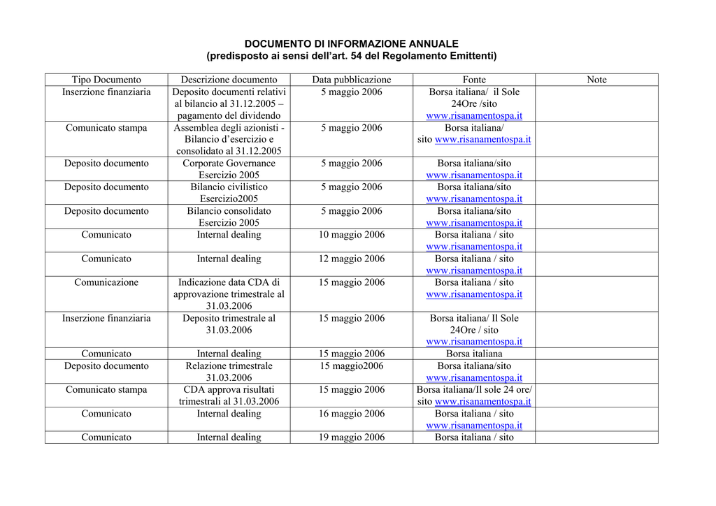 DOCUMENTO DI INFORMAZIONE ANNUALE (predisposto ai sensi dell’art. 54 del Regolamento Emittenti) Tipo Documento Inserzione finanziaria Data pubblicazione 5 maggio 2006 Comunicato Descrizione documento Deposito documenti relativi al bilancio al 31.12.2005 – pagamento del dividendo Assemblea degli azionisti Bilancio d’esercizio e consolidato al 31.12.2005 Corporate Governance Esercizio 2005 Bilancio civilistico Esercizio2005 Bilancio consolidato Esercizio 2005 Internal dealing Comunicato Internal dealing 12 maggio 2006 Comunicazione Indicazione data CDA di approvazione trimestrale al 31.03.2006 Deposito trimestrale al 31.03.2006 15 maggio 2006 15 maggio 2006 15 maggio2006 Comunicato Internal dealing Relazione trimestrale 31.03.2006 CDA approva risultati trimestrali al 31.03.2006 Internal dealing Comunicato Internal dealing 19 maggio 2006 Comunicato stampa Deposito documento Deposito documento Deposito documento Inserzione finanziaria Comunicato Deposito documento Comunicato stampa 5 maggio 2006 5 maggio 2006 5 maggio 2006 5 maggio 2006 10 maggio 2006 15 maggio 2006 15 maggio 2006 16 maggio 2006 Fonte Borsa italiana/ il Sole 24Ore /sito www.risanamentospa.it Borsa italiana/ sito www.risanamentospa.it Borsa italiana/sito www.risanamentospa.it Borsa italiana/sito www.risanamentospa.it Borsa italiana/sito www.risanamentospa.it Borsa italiana / sito www.risanamentospa.it Borsa italiana / sito www.risanamentospa.it Borsa italiana / sito www.risanamentospa.it Borsa italiana/ Il Sole 24Ore / sito www.risanamentospa.it Borsa italiana Borsa italiana/sito www.risanamentospa.it Borsa italiana/Il sole 24 ore/ sito www.risanamentospa.it Borsa italiana / sito www.risanamentospa.it Borsa italiana / sito Note Deposito documento Comunicato 23 maggio 2006 Comunicato Internal dealing 24 maggio 2006 Deposito documento Documento di informazione annuale (ex art. 54 Regolamento Emittenti) Luigi Zunino, e l’Architetto Renzo Piano hanno illustrato il Progetto di riqualificazione dell’ex area Falck Area ex Falck: Il Progetto 25 maggio 2006 26 maggio 2006 26 maggio 2006 Borsa italiana/sito www.risanamentospa.it Comunicato Discorso Luigi Zunino: Presentazione del Progetto di riqualificazione dell’ex area Falck Intervento Renzo Piano: Presentazione del Progetto di riqualificazione dell’ex area Falck Internal dealing 29 maggio 2006 Comunicato Internal dealing 5 giugno 2006 Comunicato Internal dealing 6 giugno 2006 Comunicato Internal dealing 13 giugno 2006 Borsa italiana / sito www.risanamentospa.it Borsa italiana / sito www.risanamentospa.it Borsa italiana / sito www.risanamentospa.it Borsa italiana / sito Comunicato stampa Comunicato stampa Comunicato stampa Comunicato Stampa 19 maggio 2006 www.risanamentospa.it Borsa Italiana/ sito www.risanamentospa.it Verbale di assemblea del 5 maggio 2006 approvazione del bilancio al 31.12.2005 Internal dealing Borsa italiana / sito www.risanamentospa.it Borsa italiana / sito www.risanamentospa.it Borsa italiana/sito www.risanamentospa.it 26 maggio 2006 Borsa italiana/sito www.risanamentospa.it 26 maggio 2006 Borsa italiana/sito www.risanamentospa.it Borsa italiana/sito www.risanamentospa.it Comunicato Internal dealing 16 giugno 2006 Comunicato stampa 22 giugno 2006 Analyst presentation Conferimento l'incarico di determinare il valore di mercato delle proprietà e delle iniziative immobiliari in essere al 31/03/2006 Acquistato da Fiat Partecipazioni S.p.A. n. 4.078.500 azioni ordinarie IPI S.p.A. Presentazione analisti 23 giugno 2006 Comunicato Internal dealing 30 giugno 2006 Comunicato Internal dealing 7 luglio 2006 Comunicato Internal dealing 12 luglio 2006 Comunicato Internal dealing 18 luglio 2006 Comunicato Internal dealing 25 luglio 2006 Comunicato Internal dealing 30 agosto 2006 Comunicato stampa Inaugurazione del “Padiglione Milano” alla 10. Mostra Internazionale di Architettura della Biennale di Venezia Presentazione dei progetti alla 10. Mostra Internazionale di 6 settembre 2006 Comunicato stampa Comunicato stampa 22 giugno 2006 6 settembre 2006 www.risanamentospa.it Borsa italiana / sito www.risanamentospa.it Borsa Italiana/ sito www.risanamentospa.it Borsa Italiana/ sito www.risanamentospa.it Borsa Italiana/ sito www.risanamentospa.it Borsa italiana / sito www.risanamentospa.it Borsa italiana / sito www.risanamentospa.it Borsa italiana / sito www.risanamentospa.it Borsa italiana / sito www.risanamentospa.it Borsa italiana / sito www.risanamentospa.it Borsa italiana / sito www.risanamentospa.it sito www.risanamentospa.it Trasmissione mediante due invii sito www.risanamentospa.it Trasmissione mediante due invii Architettura della Biennale di Venezia Comunicazione ex art. 2.6.2 Informazione data CDA approvazione semestrale 30.06.2006 Inserzione finanziaria Relazione semestrale al 30.06.2006 Comunicato Stampa Deposito Documento Comunicato stampa Comunicato Comunicato Stampa Deposito documento Analyst presentation Comunicato stampa Comunicato stampa 8 settembre 2006 Borsa italiana/sito www.risanamentospa.it 12 settembre 2006 Borsa italiana / Il Sole 24 Ore / sito www.risanamentospa.it Borsa italiana/sito www.risanamentospa.it Approvazione relazione semestrale al 30 giugno 2006 Relazione semestrale 30.06.2006 Il Gruppo Risanamento sostiene l’attività della Triennale di Milano Internal dealing 13 settembre 2006 Risanamento ha venduto a Finpaco Properties S.p.A. n. 4.030.991 azioni ordinarie IPI S.p.A Relazione della società di revisione alla semestrale al 30.06.2006 Presentazione analisti 20 ottobre 2006 Risanamento rafforza la sua presenza nel cuore di Parigi: acquisisce l’immobile degli Champs Elysées Risanamento SpA acquisisce il 33% del capitale azionario della 26 ottobre 2006 13 settembre 2006 27 settembre 2006 16 ottobre 2006 Borsa italiana/sito www.risanamentospa.it Borsa italiana/sito www.risanamentospa.it Borsa italiana/sito www.risanamentospa.it 24 ottobre 2006 Borsa italiana/sito www.risanamentospa.it 26 ottobre 2006 Borsa Italiana/ sito www
