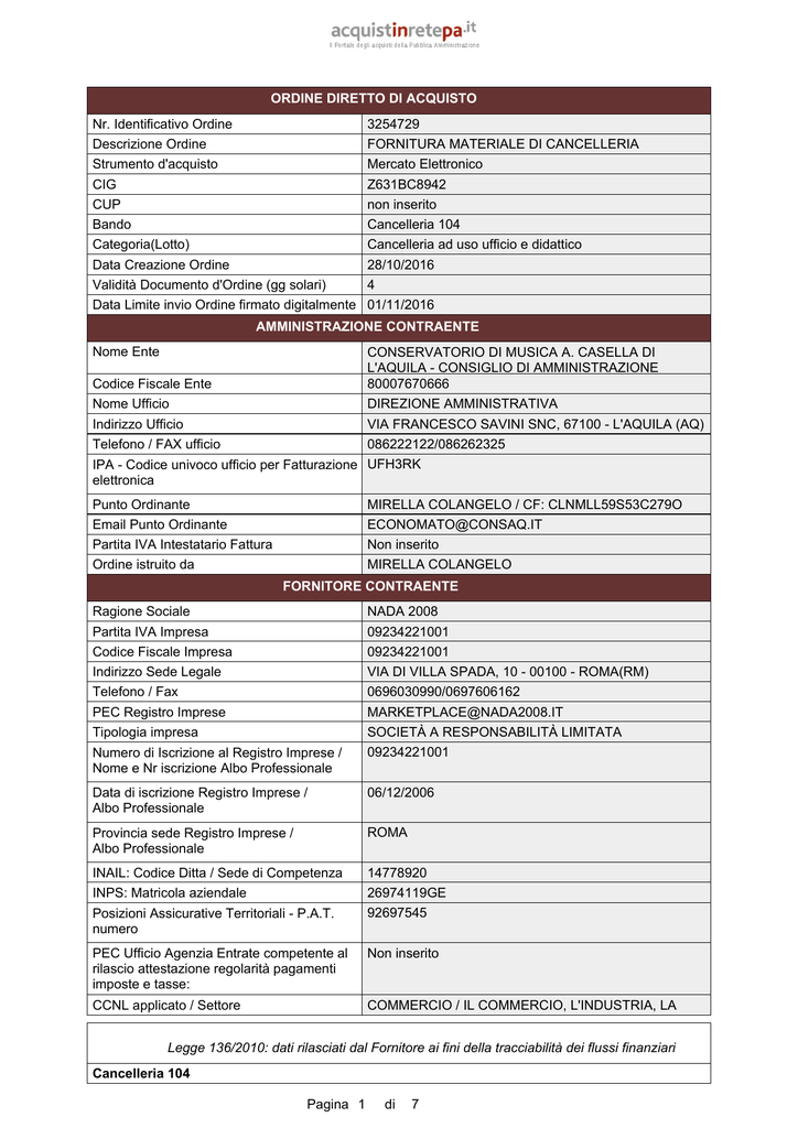 ORDINE DIRETTO DI ACQUISTO Nr. Identificativo Ordine Descrizione Ordine Strumento d'acquisto CIG CUP Bando Categoria(Lotto) Data Creazione Ordine Validità Documento d'Ordine (gg solari) Data Limite invio Ordine firmato digitalmente 3254729 FORNITURA MATERIALE DI CANCELLERIA Mercato Elettronico Z631BC8942 non inserito Cancelleria 104 Cancelleria ad uso ufficio e didattico 28/10/2016 4 01/11/2016 AMMINISTRAZIONE CONTRAENTE Nome Ente CONSERVATORIO DI MUSICA A. CASELLA DI L'AQUILA - CONSIGLIO DI AMMINISTRAZIONE 80007670666 DIREZIONE AMMINISTRATIVA VIA FRANCESCO SAVINI SNC, 67100 - L'AQUILA (AQ) Codice Fiscale Ente Nome Ufficio Indirizzo Ufficio Telefono / FAX ufficio 086222122/086262325 IPA - Codice univoco ufficio per Fatturazione UFH3RK elettronica Punto Ordinante Email Punto Ordinante Partita IVA Intestatario Fattura Ordine istruito da MIRELLA COLANGELO / CF: CLNMLL59S53C279O [email protected] Non inserito MIRELLA COLANGELO FORNITORE CONTRAENTE Ragione Sociale Partita IVA Impresa Codice Fiscale Impresa Indirizzo Sede Legale Telefono / Fax PEC Registro Imprese Tipologia impresa Numero di Iscrizione al Registro Imprese / Nome e Nr iscrizione Albo Professionale NADA 2008 09234221001 09234221001 VIA DI VILLA SPADA, 10 - 00100 - ROMA(RM) 0696030990/0697606162 [email protected] SOCIETÀ A RESPONSABILITÀ LIMITATA 09234221001 Data di iscrizione Registro Imprese / Albo Professionale 06/12/2006 Provincia sede Registro Imprese / Albo Professionale ROMA INAIL: Codice Ditta / Sede di Competenza INPS: Matricola aziendale 14778920 26974119GE 92697545 Posizioni Assicurative Territoriali - P.A.T. numero PEC Ufficio Agenzia Entrate competente al rilascio attestazione regolarità pagamenti imposte e tasse: Non inserito CCNL applicato / Settore COMMERCIO / IL COMMERCIO, L'INDUSTRIA, LA Legge 136/2010: dati rilasciati dal Fornitore ai fini della tracciabilità dei flussi finanziari Cancelleria 104 Pagina 1 di 7 Nessun dato rilasciato Oggetto dell'ordine ( 1 di 16 ) - Metaprodotto: Cartelline in cartone Acquisti verdi: N.A. - Area di consegna: ITALIA - Codice articolo fornitore: 241703/N - Codice articolo produttore: 241703 - Colore: assortito - Condizioni di pagamento: 30 GG DFFM - Descrizione tecnica: Cartelle colorate con finestra 120 gr assortito 5 Star - Disponibilità minima garantita: 3000 - Formato esterno [cm]: 22x31cm - Lotto minimo per unità di misura: 1 - Marca: 5 Star - Materiale: cartoncino - Nome commerciale: Cartelle colorate con finestra 5 Star - assortito - 241703 (conf.20) - Note: in confezione da 20 pezzi - Prezzo: 2,03 - Quantità vendibile per unità di misura: 20 - Spessore [micron] / peso [g/m²]: 120 g/mq - Tempo di consegna [giorni lavorativi]: 7 - Tipo contratto: Acquisto - Tipologia: con finestra - Unità di misura: Confezione - Url immagine: http://immagini.aramislab.com/image-66014-hiRes.png Oggetto dell'ordine ( 2 di 16 ) - Metaprodotto: Penna monouso Area di consegna: ITALIA - Chiusura: cappuccio - Clip: SI - Codice articolo fornitore: 534772/N - Codice articolo produttore: 889984 - Colore inchiostro: nero - Condizioni di pagamento: 60 GG DF - Descrizione tecnica: Penna a sfera con grip per una presa più confortevole. Fusto esagonale trasparente per il controllo dell’inchiostro. - Disponibilità minima garantita: 10000 - Lotto minimo per unità di misura: 1 - Marca: Bic - Nome commerciale della penna monouso: Penna a 534772 sfera Cristal Grip Bic - nero - 1 mm - 802800 (conf.20) - Note: In confezione da 20 pezzi - Prezzo: 5,062 - Quantità vendibile per unità di misura: 20 - Tempo di consegna [giorni lavorativi]: 7 - Tipo contratto: Acquisto - Tipologia inchiostro: grasso - Tipologia punta: sfera - Tratto [mm]: 1 Unità di misura: Confezione - Url immagine: http://immagini.aramislab.com/image-20521-hiRes.png Oggetto dell'ordine ( 3 di 16 ) - Metaprodotto: Penna monouso Area di consegna: ITALIA - Chiusura: cappuccio - Clip: SI - Codice articolo fornitore: 534780/N - Codice articolo produttore: 889985 - Colore inchiostro: blu - Condizioni di pagamento: 60 GG DF - Descrizione tecnica: Penna a sfera con grip per una presa più confortevole. Fusto esagonale trasparente per il controllo dell’inchiostro. - Disponibilità minima garantita: 10000 - Lotto minimo per unità di misura: 1 - Marca: Bic - Nome commerciale della penna monouso: Penna a 534780 sfera Cristal Grip Bic - blu - 1 mm - 889985 (conf.20) - Note: In confezione da 20 pezzi - Prezzo: 5,062 - Quantità vendibile per unità di misura: 20 - Tempo di consegna [giorni lavorativi]: 7 - Tipo contratto: Acquisto - Tipologia inchiostro: grasso - Tipologia punta: sfera - Tratto [mm]: 1 Unità di misura: Confezione - Url immagine: http://immagini.aramislab.com/image-20521-hiRes.png Oggetto dell'ordine ( 4 di 16 ) - Metaprodotto: Matite di grafite in legno Area di consegna: ITALIA - Codice articolo fornitore: 694740/N - Codice articolo produttore: 117000 Condizioni di pagamento: 60 GG DF - Descrizione tecnica: Matita ergonomica con fusto triangolare laccato e impugnatura antiscivolo in gomma. Mina in grafite fissata al fusto con sis….(CONTINUA IN CAMPO NOTE) Disponibilità minima garantita: 6000 - Forma sezione fusto: triangolare - Gradazione: HB - Lotto minimo per unità di misura: 1 - Marca: Faber Castell - Nome commerciale: Matita Grip 694740 2001 Faber Castell - Normale - HB - 117000 - Note: Matita ergonomica con fusto triangolare laccato e impugnatura antiscivolo in gomma. Mina in grafite fissata al fusto con sistema brevettato SV che ne - Prezzo: 0,567 - Quantità vendibile per unità di misura: 1 - Tempo di consegna [giorni lavorativi]: 7 - Tipo assistenza: Assistestenza generali - Tipo contratto: Acquisto - Tipologia: senza gomma - Unità di misura: Pezzo - Url immagine: http://immagini.aramislab.com/image-21115-hiRes.png Oggetto dell'ordine ( 5 di 16 ) - Metaprodotto: Libri (Cartelle) firma Acquisti verdi: N.A. - Area di consegna: ITALIA - Codice articolo fornitore: 910040/N - Codice articolo produttore: 40045-01 -