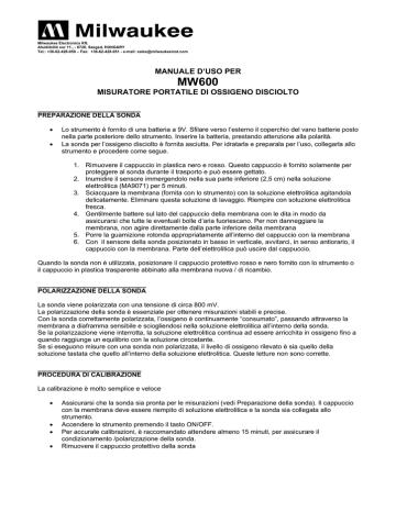 Milwaukee Electronics Kft. Alsókikötő sor 11., - 6726, Szeged, HUNGARY Tel.: +36-62-428-050 – Fax: +36-62-428-051 - e-mail: [email protected] MANUALE D’USO PER MW600 MISURATORE PORTATILE DI OSSIGENO DISCIOLTO PREPARAZIONE DELLA SONDA • • Lo strumento è fornito di una batteria a 9V. Sfilare verso l’esterno il coperchio del vano batterie posto nella parte posteriore dello strumento. Inserire la batteria, prestando attenzione alla polarità. La sonda per l’ossigeno disciolto è fornita asciutta. Per idratarla e preparala per l’uso, collegarla allo strumento e procedere come segue. 1. Rimuovere il cappuccio in plastica nero e rosso. Questo cappuccio è fornito solamente per proteggere al sonda durante il trasporto e può essere gettato. 2. Inumidire il sensore immergendolo nella sua parte inferiore (2,5 cm) nella soluzione elettrolitica (MA9071) per 5 minuti. 3. Sciacquare la membrana (fornita con lo strumento) con la soluzione elettrolitica agitandola delicatamente. Eliminare questa soluzione di lavaggio. Riempire con soluzione elettrolitica fresca. 4. Gentilmente battere sul lato del cappuccio della membrana con le dita in modo da assicurarsi che tutte le eventuali bolle d’aria fuoriescano. Per non danneggiare la membrana, non agire direttamente dalla parte inferiore della membrana 5. Porre la guarnizione rotonda appropriatamente all’interno del cappuccio con la membrana 6. Con il sensore della sonda posizionato in basso in verticale, avvitarci, in senso antiorario, il cappuccio con la membrana. Parte dell’elettrolitica può uscire dal cappuccio. Quando la sonda non è utilizzata, posizionare il cappuccio protettivo rosso e nero fornito con lo strumento o il cappuccio in plastica trasparente abbinato alla membrana nuova / di ricambio. POLARIZZAZIONE DELLA SONDA La sonda viene polarizzata con una tensione di circa 800 mV. La polarizzazione della sonda è essenziale per ottenere misurazioni stabili e precise. Con la sonda correttamente polarizzata, l’ossigeno è continuamente “consumato”, passando attraverso la membrana a diaframma sensibile e sciogliendosi nella soluzione elettrolitica all’interno della sonda. Se la polarizzazione viene interrotta, la soluzione elettrolitica continua ad essere arricchita in ossigeno fino a quando raggiunge un equilibrio con la soluzione circostante. Se si eseguono misure con una sonda non polarizzata, il livello di ossigeno rilevato è sia quello della soluzione tastata che quello all’interno della soluzione elettrolitica. Queste letture non sono corrette. PROCEDURA DI CALIBRAZIONE La calibrazione è molto semplice e veloce • • • • Assicurarsi che la sonda sia pronta per le misurazioni (vedi Preparazione della sonda). Il cappuccio con la membrana deve essere riempito di soluzione elettrolitica e la sonda sia collegata allo strumento. Accendere lo strumento premendo il tasto ON/OFF. Per accurate calibrazioni, è raccomandato attendere almeno 15 minuti, per assicurare il condizionamento /polarizzazione della sonda. Rimuovere il cappuccio protettivo della sonda Milwaukee Electronics Kft. Alsókikötő sor 11., - 6726, Szeged, HUNGARY Tel.: +36-62-428-050 – Fax: +36-62-428-051 - e-mail: [email protected] Calibrazione dello zero: • • • Immergere la sonda nella soluzione zero ossigeno (MA9070) e agitare leggermente per 2 – 3 minuti. Permettere una stabilizzazione della lettura sul display. Regolare il trimmer della calibrazione zero D.O. (vite di regolazione posta sulla parete posteriore dello strumento) affinché il display legga “0.0”. Calibrazione Slope: E’ consigliato effettuare questa calibrazione in aria satura. • • • • • Sciacquare la sonda con una grande quantità di acqua pulita per rimuovere ogni residuo della soluzione di calibrazione zero. Asciugare la sonda e permettere che il display di lettura si stabilizzi. Premere e mantenere premuto il tasto CAL. Regolare il trimmer dello Slope posto sul pannello frontale dello strumento (indicato con 100% CAL) fino a leggere il valore 100 sul display (sempre mantenendo premuto il tasto CAL) Rilasciare il tasto CAL ed il display leggerà il valore in ppm (mg/L) di ossigeno. La “calibrazione zero” dell’MW600 è molto stabile. Questa procedura dovrebbe essere effettuata solo qualora la sonda venga sostituita. La “calibrazione Slope” è più critica, per cui è consigliato effettuarla ogni settimana e quando la membra viene sostituita. OPERAZIONI DI MISURA Assicurarsi che lo strumento sia stato calibrato e che il cappuccio protettivo sia stato rimosso. Immergere la punta della sonda nella soluzione da misurare, assicurandosi che sia immerso anche il sensore di temperatura. Per misure precise di ossigeno disciolto è necessario un movimento dell’acqua di almeno 0.3 m/sec. Questo assicura che la superficie della membrana permeabile all’ossigeno sia costantemente reintegrata. Una corrente in movimento fornirà una circolazione adeguata. Per controllare rapidamente se la velocità dell’acqua è sufficiente, attendere che la lettura si stabilizzi e quindi muovere la sonda. Se la lettura rimane stabile, le condizioni di misura sono corrette; se invece il valore misurato aumenta, il movimento dell’acqua non è adeguato. In caso di misure sul campo, queste condizioni possono essere create agitando manualmente la sonda. Infatti non è possibile ottenere misure accurate se il liquido è statico. In caso di misure in laboratorio, si consiglia di utilizzare un agitatore magnetico per assicurare una certa velocità di movimento della soluzione. In questo modo gli errori dovuti alla diffusione nel liquido dell’ossigeno atmosferico vengono ridotti al minimo. In ogni caso, attendere il tempo necessario per raggiungere l’equilibrio termico tra sonda e campione (alcuni minuti per una differenza di temperatura di pochi gradi). COMPENSAZONE PER L’ALTITUDINE E LA SALINITA’ Se il campione contiene sali o se la misurazione viene fatta ad una alt