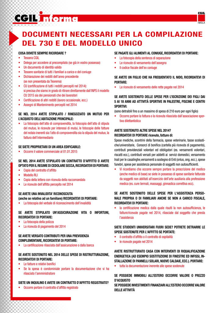 DOCUMENTI NECESSARI PER LA COMPILAZIONE DEL 730 E DEL MODELLO UNICO COSA DOVETE SEMPRE RICORDARE ? • Tessera CGIL • Delega per accedere al precompilato (se già in vostro possesso) • Un documento di identità valido • Tessere sanitarie di tutti i familiari a carico e del coniuge • Dichiarazione dei redditi dell’anno precedente (se non presentata da Teorema) • CU (certificazione di tutti i redditi percepiti nel 2014): si precisa che siamo in grado di ritirare direttamente dall’INPS il modello CU 2015 sia dei pensionati che dei lavoratori • Certificazione di altri redditi (lavoro occasionale, ecc.) • Assegni di Mantenimento percepiti nel 2014 SE NEL 2014 AVETE STIPULATO / RINEGOZIATO UN MUTUO PER L’ACQUISTO DELL’ABITAZIONE PRINCIPALE: • La fotocopia dell’atto di compravendita, la fotocopia dell’atto di stipula del mutuo, le ricevute per interessi di mutui, le fotocopie delle fatture del notaio inerenti sia l’atto di compravendita sia la stipula del mutuo, la fattura dell’intermediario SE SIETE PROPRIETARI DI UN AREA EDIFICABILE: • Occorre il valore commerciale al 01.01.2015 SE NEL 2014 AVETE STIPULATO UN CONTRATTO D’AFFITTO O AVETE OPTATO PER IL REGIME DI CEDOLARE SECCA, RICORDATEVI DI PORTARE: • Copia del contratto d’affitto • Modello RLI • Copia della lettera con ricevuta della raccomandata • Le ricevute dell’affitto percepito nel 2014 SE AVETE UNA INVALIDITA’ RICONOSCIUTA (anche se relativa ad un familiare) RICORDATEVI DI PORTARE: • La fotocopia del verbale di riconoscimento dell’invalidità SE AVETE STIPULATO UN’ASSICURAZIONE VITA O INFORTUNI, RICORDATEVI DI PORTARE: • La fotocopia della polizza • La ricevuta di pagamento del 2014 SE AVETE VERSATO CONTRIBUTI PER UNA PREVIDENZA COMPLEMENTARE, RICORDATEVI DI PORTARE: • La certificazione rilasciata dall’assicurazione o dalla banca SE AVETE SOSTENUTO NEL 2014 DELLE SPESE DI RISTRUTTURAZIONE, RICORDATEVI DI PORTARE: • Le fatture e relativi bonifici • Se la spesa è condominiale portare la documentazione che vi ha rilasciato l’amministratore SIETE UN INQUILINO E AVETE UN CONTRATTO D’AFFITTO REGISTRATO? • Occorre portare il contratto d’affitto registrato SE PAGATE GLI ALIMENTI AL CONIUGE, RICORDATEVI DI PORTARE: • La fotocopia della sentenza di separazione • Le ricevute di versamento dell’assegno • Il codice fiscale dell’ex coniuge SE AVETE UN FIGLIO CHE HA FREQUENTATO IL NIDO, RICORDATEVI DI PORTARE: • Le ricevute di versamento delle rette pagate nel 2014 SE AVETE SOSTENUTO DELLE SPESE PER L’ISCRIZIONE DEI FIGLI DAI 5 AI 18 ANNI AD ATTIVITÀ SPORTIVE IN PALESTRE, PISCINE E CENTRI SPORTIVI: (sono detraibili fino a un massimo di spesa di 210 euro per ogni figlio) • Occorre portare la fattura o la ricevuta rilasciata dall’associazione spor tiva dilettantistica AVETE SOSTENUTO ALTRE SPESE NEL 2014? RICORDATEVI DI PORTARE ricevute, fatture di: Spese mediche, scontrini della farmacia, spese veterinarie, tasse scolasti che/universitarie, Consorzi di bonifica (cartella più ricevuta di pagamento), contributi previdenziali volontari ed obbligatori (es. versamenti volontari, riscatti ecc.), contributi versati per addetti ai servizi domestici, versamento Inail per le casalinghe,versamenti a sostegno di Enti (onlus, ong, ecc.), spese funebri, spese per assistenza personale di soggetti non autosufficienti. • Vi ricordiamo che occorre sempre portare la prescrizione del medico (anche medico di base) se siete in possesso di spese sanitarie fatturate da soggetti non abilitati all’esercizio dell’arte ausiliaria alla professione medica (es. cure termali, massaggi, ginnastica correttiva ecc). SE AVETE SOSTENUTO DELLE SPESE PER L'ASSISTENZA PERSO NALE PROPRIA O DI FAMILIARI ANCHE SE NON A CARICO FISCALE, RICORDATEVI DI PORTARE: • la certificazione medica dalla quale risulti la non autosufficienza, le fatture/ricevute pagate nel 2014, rilasciate dal soggetto che presta l'assistenza SIETE STUDENTI UNIVERSITARI FUORI SEDE? POTRETE DETRARRE LE SPESE SOSTENUTE PER L'AFFITTO SE PORTATE: • il contratto d'affitto o il contratto di ospitalità • le ricevute pagate nel 2014 AVETE RISTRUTTURATO CASA CON INTERVENTI DI RIQUALIFICAZIONE ENERGETICA (AD ESEMPIO SOSTITUZIONE DI FINESTRE ED INFISSI, IN STALLAZIONE DI PANNELLI SOLARI, NUOVE CALDAIE, ECC.). PORTARE: • tutta la documentazione inerente alle spese sostenute se possiede immobili all’estero occorre valore o prezzo d’acquisto se possiede investimenti finanziari all’estero occorre valore delle attività