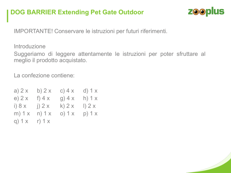 DOG BARRIER Extending Pet Gate Outdoor IMPORTANTE! Conservare le istruzioni per futuri riferimenti. Introduzione Suggeriamo di leggere attentamente le istruzioni per poter sfruttare al meglio il prodotto acquistato. La confezione contiene: a) 2 x e) 2 x i) 8 x m) 1 x q) 1 x b) 2 x f) 4 x j) 2 x n) 1 x r) 1 x c) 4 x g) 4 x k) 2 x o) 1 x d) 1 x h) 1 x l) 2 x p) 1 x DOG BARRIER Extending Pet Gate Outdoor DOG BARRIER Extending Pet Gate Outdoor Se nella confezione mancano alcuni dei componenti rappresentati nelle figure 1A e 1B, non è possibile utilizzare Dog Barrier Outdoor. Gli elementi di ricambio possono essere reperiti esclusivamente presso i rivenditori o il produttore. DOG BARRIER Extending Pet Gate Outdoor INSTALLAZIONE SU SCALA Attenzione: la posizione di Dog Barrier Outdoor rispetto alle scale è molto importante per la sicurezza del cane. Posizionare Dog Barrier Outdoor già sul pianerottolo antistante le scale, per prevenire completamente l’accesso alle stesse. Se è necessario posizionare il cancelletto in cima alle scale per evitare che il cane le scenda, Dog Barrier Outdoor deve essere collocato sullo scalino più alto. Per scendere le scale, aprire il cancelletto verso di sé (in senso opposto alle scale) Se si desidera collocare il cancelletto in fondo alle scale, allora Dog Barrier Outdoor deve essere posizionato sullo scalino più basso, di fronte alle scale, lontano dal secondo scalino. (2) DOG BARRIER Extending Pet Gate Outdoor PER INIZIARE Controllare la larghezza dell’apertura che si desidera chiudere con il cancello Dog Barrier Outdoor, tenendo presente che l’ampiezza minima misura 84 cm e la massima 152 cm. Importante: non cercare di utilizzare Dog Barrier Outdoor per aperture la cui ampiezza supera i 152 cm. Per prima cosa è necessario determinare l’esatta larghezza. A tal fine, allargare il cancello Dog Barrier Outdoor quanto più possibile all’interno dell’apertura che si desidera mettere in sicurezza. (3) DOG BARRIER Extending Pet Gate Outdoor DOG BARRIER Extending Pet Gate Outdoor Dopo aver stabilito la misura corretta, assemblare le due sezioni principali del cancello con i 4 bulloni e le 4 viti di connessione (F+G). (4) FISSARE IL SUPPORTO IN PLASTICA Utilizzare i modelli (B1 per la parte A+B, B2 per la parte C+D, vedere fig. 13) per segnare la posizione in cui procedere a trapanare (per un montaggio perfettamente verticale, utilizzare una livella). (5) Parte A: 6, 7, 8 + 9 Assemblare insieme tutti i supporti in plastica utilizzando le viti autoforanti, in corrispondenza dei fori segnati. (parte A: 6, 7, 8 + 9), (parte B: 10), (parte C & D: 11 + 12) DOG BARRIER Extending Pet Gate Outdoor Parte B: 10 Parte C & D: 11 DOG BARRIER Extending Pet Gate Outdoor FISSAGGIO SU LEGNO Effettuare dei fori di 2 mm di diametro e utilizzare le viti da legno presenti nella confezione per fissare il cancelletto direttamente al legno. FISSAGGIO SU PARETI IN GESSO Effettuare dei fori di 6 mm di diametro e inserire i fischer presenti nella confezione prima di utilizzare le viti. DOG BARRIER Extending Pet Gate Outdoor FISSAGGIO SU PANNELLI IN CARTONGESSO Questo genere di pareti necessita di un fissaggio speciale, per il quale occorre acquistare dei tasselli ad espansione. Questi ultimi non sono forniti nella confezione, ma sono reperibili in tutti i comuni negozi di bricolage. Dopo il montaggio, assicurarsi che la barra inferiore mantenga dal pavimento una distanza compresa tra i 4,5 cm e i 6,5 cm. DOG BARRIER Extending Pet Gate Outdoor Parte C & D: 12 DOG BARRIER Extending Pet Gate Outdoor CONSIGLI DI SICUREZZA •anche dopo il montaggio di Dog Barrier Outdoor, continuare a sorvegliare l’animale e non lasciare solo quest’ultimo finché non avrà preso confidenza con il cancelletto protettivo; •si consiglia di controllare giornalmente Dog Barrier Outdoor, per verificare che resti sempre correttamente fissato; •accertarsi che Dog Barrier Outdoor si chiuda sempre bene; •se il cancello oscilla può essere pericoloso e la mano piccola, ad esempio di un bambino, può accidentalmente restarvi intrappolata; •Dog Barrier Outdoor deve essere utilizzato esclusivamente per i cani e non per i bambini; •non gettare le istruzioni, potrebbero essere utili a un futuro utilizzatore; •conservare le istruzioni per un eventuale futuro riposizionamento del cancello Dog Barrier Outdoor. DOG BARRIER Extending Pet Gate Outdoor Attenzione: un posizionamento scorretto di Dog Barrier Outdoor può essere pericoloso! Attenzione: non usare Dog Barrier Outdoor se vi sono componenti mancanti o danneggiati! Attenzione: Dog Barrier Outdoor non può essere montato su finestre! PULIZIA Pulire con un panno umido. Savic non è responsabile per eventuali danni occorsi durante il montaggio del prodotto.