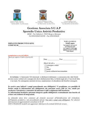 Comune di Borgo a Mozzano Umberto I - Borgo a Mozzano Tel.0583/820452 – Fax 0583/820428 Comune di Fabbriche di Vallico Loc. Campaccio – Fabbriche di Vallico Tel .0583/761944 – Fax 0583/761762 Comune di Bagni di Lucca Via Umberto I, 100- Bagni di Lucca Tel. 0583/809911 Fax 0583/809937 Gestione Associata S.U.A.P Sportello Unico Attività Produttive SEDE - Via Umberto I, 55023 Borgo a Mozzano Tel.0583/820452/65/69 – Fax 0583/820428 MARCA DA BOLLO IMPIANTO PRODUTTIVO SITO COMUNE DI____________________________ 14.62 euro Non apporre nel caso di procedimenti tutti non soggetti a bollo (non apporre marche da bollo negli allegati (compilazione a cura dell’ufficio) Spazio per apporre il timbro di protocollo Data: _____________ Prot. ________________ PRAT.SUAP n. ________________________ [ ] consegna a mano [ ] fax [ ] email [ ] posta ordinaria/raccomandata Avvertenza: L’interessato/ Gli interessati si dichiara/si dichiarano a conoscenza che i dati forniti devono essere veritieri ed è consapevole che le dichiarazioni false, la falsità negli atti e l’uso di atti falsi è un reato. Ne conseguono sanzioni (revoca, sospensione) e la decadenza dai benefici conseguiti. In corsivo sono indicati i campi generalmente non obbligatori. Vi preghiamo, ove possibile di fornire anche le informazioni non obbligatorie che potranno essere utili (es. fax, email) per accelerare l’istruttoria e consentirci di informarvi sullo svolgimento dell’istruttoria. Le informazioni facoltative potranno integrare quelle obbligatorie eventualmente non inserite ed evitare così richieste di integrazioni. La domanda unica deve contenere gli elementi necessari all'identificazione del richiedente, dell'impianto produttivo e dei procedimenti attivati. Non tutti i campi sono obbligatori. Per ulteriori informazioni ed aggiornamenti consultata lo SUAP NON UTILIZZATE modelli non aggiornati. Informarsi di eventuali diritti da versare. 2 Il sottoscritto quale: [ ] proprietario/avente titolo [ ] esercente attività nell’immobile Vi chiediamo di compilare accuratamente la presente domanda unica che deve essere sottoscritta dal richiedente. In taluni casi può essere il proprietario stesso, in altri casi l’istanza può essere presentata dall’esercente l’attività produttiva nell’immobile (con contratto di locazione o altro titolo). SOGGETTO CHE ESERCITA ATTIVITA’ NEGLI IMMOBILI: Cognome ________________________________________ Nome __________________________ Data di nascita ____/____/____ Luogo di nascita _____________________________ (Prov. ____ ) Cittadinanza italiana ovvero ________________________________________________________ Codice Fiscale Residenza: Comune di _________________________________ CAP __________ (Prov. ______ ) Via/P.zza __________________________________________ n. _______ Tel. ________________ cell. _________________________ Fax ___________________________ E-mail ___________________@_____________________ [ ] barrare se email con firma digitale [ ] Titolare della impresa individuale [ ] ___________________________ C.Fisc [ ] Legale rappresentante della Società P.IVA Denominazione o Ragione Sociale _______________________________________________ con sede legale ovvero [ ] amministrativa nel Comune di _______________________________ (Prov. ______ ) Via/P.zza __________________________________________ n. _______ CAP __________ Tel. ________________________ Fax ___________________________ E-mail ___________________@_____________________ [ ] barrare se email con firma digitale Iscritta al Registro Imprese della C.C.I.A.A. di _____________________ al n. ___________ Iscrizione al Tribunale di ______________________________ al n. ___________ (se previsto) PROPRIETARIO DEGLI IMMOBILI/TERRENI: Cognome ________________________________________ Nome __________________________ Data di nascita ____/____/____ Luogo di nascita _____________________________ (Prov. ____ ) Cittadinanza italiana ovvero ________________________________________________________ Codice Fiscale Residenza: Comune di _________________________________ CAP __________ (Prov. ______ ) Via/P.zza __________________________________________ n. _______ Sede Ufficio: Comune di _________________________________ CAP __________ (Prov. ______ ) Via/P.zza __________________________________________ n. _______ Tel. ________________ cell. _________________________ Fax ___________________________ E-mail ____________________@_______________________________ [ ] barrare se certificata [ ] Titolare della impresa individuale [ ] ___________________________ [ ] Legale rappresentante della Società 3 C.Fisc P.IVA Denominazione o Ragione Sociale _______________________________________________ con sede legale ovvero [ ] amministrativa nel Comune di _______________________________ (Prov. ______ ) Via/P.zza __________________________________________ n. _______ CAP __________ Tel. ________________________ Fax ___________________________ E-mail ___________________@_____________________ [ ] barrare se email con firma digitale Iscritta al Registro Imprese della C.C.I.A.A. di _____________________ al n. ___________ Iscrizione al Tribunale di ______________________________ al n. ___________ (se previsto) DATI DEGLI ALTRI AVENTI TITOLO SUGLI IMMOBILI/TERRENI Comproprietaro [ ] Locatario [ ] altro titolo [ ] Cognome ________________________________________ Nome __________________________ Data di nascita ____/____/____ Luogo di nascita _____________________________ (Prov. ____ ) Residenza: Comune di _________________________________ CAP __________ (Prov. ______ ) Via/P.zza __________________________________________ n. _______ ______________________________________________________________ Comproprietaro [ ] Locatario [ ] altro titolo [ ] Cognome ________________________________________ Nome __________________________ Data di nascita ____/____/____ Luogo di nascita _____________________________ (Prov. ____ ) Residenza: Comune di _________________________________ CAP ________