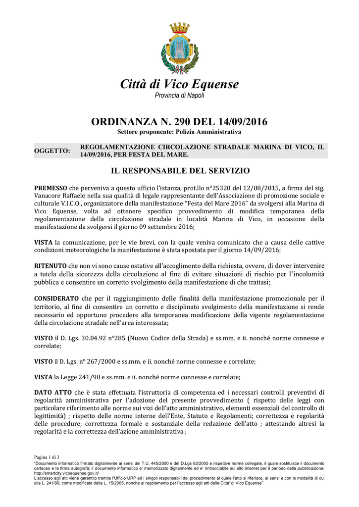 Città di Vico Equense Provincia di Napoli ORDINANZA N. 290 DEL 14/09/2016 Settore proponente: Polizia Amministrativa OGGETTO: REGOLAMENTAZIONE CIRCOLAZIONE STRADALE MARINA DI VICO, IL 14/09/2016, PER FESTA DEL MARE. IL RESPONSABILE DEL SERVIZIO PREMESSO che perveniva a questo ufficio l’istanza, prot.llo n°25320 del 12/08/2015, a firma del sig. Vanacore Raffaele nella sua qualità di legale rappresentante dell’Associazione di promozione sociale e culturale V.I.C.O., organizzatore della manifestazione “Festa del Mare 2016” da svolgersi alla Marina di Vico Equense, volta ad ottenere specifico provvedimento di modifica temporanea della regolamentazione della circolazione stradale in località Marina di Vico, in occasione della manifestazione da svolgersi il giorno 09 settembre 2016; VISTA la comunicazione, per le vie brevi, con la quale veniva comunicato che a causa delle cattive condizioni meteorologiche la manifestazione è stata spostata per il giorno 14/09/2016; RITENUTO che non vi sono cause ostative all’accoglimento della richiesta, ovvero, di dover intervenire a tutela della sicurezza della circolazione al fine di evitare situazioni di rischio per l’incolumità pubblica e consentire un corretto svolgimento della manifestazione di che trattasi; CONSIDERATO che per il raggiungimento delle finalità della manifestazione promozionale per il territorio, al fine di consentire un corretto e disciplinato svolgimento della manifestazione si rende necessario ed opportuno procedere alla temporanea modificazione della vigente regolamentazione della circolazione stradale nell’area interessata; VISTO il D. Lgs. 30.04.92 n°285 (Nuovo Codice della Strada) e ss.mm. e ii. nonché norme connesse e correlate; VISTO il D. Lgs. n° 267/2000 e ss.mm. e ii. nonché norme connesse e correlate; VISTA la Legge 241/90 e ss.mm. e ii. nonché norme connesse e correlate; DATO ATTO che è stata effettuata l’istruttoria di competenza ed i necessari controlli preventivi di regolarità amministrativa per l’adozione del presente provvedimento ( rispetto delle leggi con particolare riferimento alle norme sui vizi dell’atto amministrativo, elementi essenziali del controllo di legittimità) ; rispetto delle norme interne dell’Ente, Statuto e Regolamenti; correttezza e regolarità delle procedure; correttezza formale e sostanziale della redazione dell’atto ; attestando altresì la regolarità e la correttezza dell’azione amministrativa ; Pagina 1 di 3 “Documento informatico firmato digitalmente ai sensi del T.U. 445/2000 e del D.Lgs 82/2005 e rispettive norme collegate, il quale sostituisce il documento cartaceo e la firma autografa; il documento informatico e’ memorizzato digitalmente ed e’ rintracciabile sul sito internet per il periodo della pubblicazione: http://smartcity.vicoequense.gov.it/ L’accesso agli atti viene garantito tramite l’Ufficio URP ed i singoli responsabili del procedimento al quale l’atto si riferisce, ai sensi e con le modalità di cui alla L. 241/90, come modificata dalla L. 15/2005, nonché al regolamento per l’accesso agli atti della Citta' di Vico Equense” Città di Vico Equense Provincia di Napoli VISTO il Decreto Sindacale n°01/2016 con il quale è stato nominato il Responsabile della Polizia Locale, nonché il Decreto Sindacale n. 131/2016 del 05.08.2016, di proroga dell’incarico fino al 30.09.2016; Per i motivi di cui in premessa, nonché a garanzia della sicurezza della circolazione stradale, ORDINA Il giorno 14 settembre 2016, dalle ore 18:00 alle ore 24:00: il divieto di transito veicolare in piazzetta marina di Vico ed in via Cristoforo Colombo, tratto compreso tra l’ingresso del parcheggio Hotel Oriente e la stessa piazzetta Marina di Vico, ad eccezione dei veicoli dei residenti, diretti alle zone di sosta private; DEROGHE sarà consentito il transito dei veicoli in servizio di emergenza a tutela della pubblica e privata incolumità; ulteriori variazioni della circolazione stradale nell’area interessata e/o deroghe alla presente saranno valutate ed attuate dal personale della Polizia Municipale secondo esigenze; DISPONE che la presente ordinanza sia resa nota mediante pubblicazione all’Albo Pretorio comunale; la trasmissione di copia della presente al Servizio Territorio dell’Ente, per l’istallazione della prescritta segnaletica nel rispetto di quanto disposto dal C.d.S., al Commissariato della Polizia di Stato di Sorrento, al Comando Stazione Carabinieri di Vico Equense, ai Servizi alle Imprese – Turismo e Territorio, ciascuno per quanto di rispettiva competenza; AVVERTE - che a norma dell’art. 3, comma 4, della legge n. 241/90, avverso la presente ordinanza, in applicazione della legge 6 dicembre 1971 n. 1034, chiunque vi abbia interesse potrà ricorrere per incompetenza, per eccesso di potere o per violazione di legge, entro 60 giorni dalla pubblicazione e notificazione al Tribunale Amministrativo Regionale ed entro 120 giorni al Presidente della Repubblica; - che in relazione al disposto dell’art. 37, comma 3 del D. Lgs. 285/92, sempre nel termine di 60 giorni, può essere proposto ricorso da chi abbia interesse all’apposizione della segnaletica, in relazione alla natura dei segnali apposti, al Ministero delle Infrastrutture e dei Trasporti, con procedura di cui all’art. 74 del Regolamento approvato con D.P.R. n. 495/92. La Polizia Municipale e gli altri Agenti ai quali spetta l’espletamento dei Servizi di Polizia Stradale indicati nell’art. 12 del C.d.S. sono incaricati di vigilare sulla osservanza delle disposizioni contenute nella presente ordinanza. Il Responsabile del Servizio DE MARTINO FERDINANDO / ArubaPEC S.p.A. Documento firmato digitalmente (artt. 20-21-24 D.Lgs 7/3/2005 n. 82 e s.m.i.) Pagina 2 di 3 “Documento informatico firmato digitalmente ai sensi del T.U. 445/2000 e del D.Lgs 82/2005 e rispettive norme collegate, il quale sostituisce il documento cartaceo e la firma autografa; il documento infor