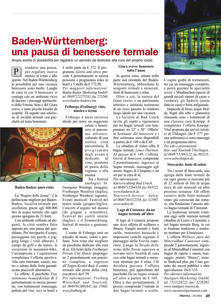 Baden-Württemberg: una pausa di benessere termale Ampia scelta di possibilità per regalarsi un periodo da dedicare alla cura del proprio corpo rendersi una pausa, per regalare nuovo slancio al corpo e allo spirito. Nel Baden-Württemberg le possibilità per una vacanza benessere sono molte. Luoghi di cura in cui il benessere si coniuga con un ambiente ricco di fascino: i paesaggi spettacolari della Foresta Nera e del Giura svevo, e tante piccole località da scoprire. Di seguito una selezione di località termali con pacchetti sul tema benessere. P Baden-Baden: puro relax La “Regina delle terme”: è la definizione migliore per BadenBaden, località termale per eccellenza, grazie agli 800.000 litri di acqua termale che ogni giorno sgorgano da 23 fonti. Con ambienti raffinati ed eleganti, la città sembra fatta apposta per una pausa dal quotidiano. Per rinvigorire il corpo, passeggiate nei parchi e jogging lungo i viali alberati. I campi da golf e da tennis, le escursioni in mountain-bike, l’arrampicata e l’equitazione completano l’offerta sportiva. Alla sera ristoranti, casinò, teatro e salone delle feste garantiscono piacevoli alternative. Le offerte. Il pacchetto Fine settimana beauty&relax di 2 pernottamenti in mezza pensione, con trattamenti (massaggi, pulizia del viso, ecc) in hotel a 4 stelle parte da € 372. Il programma Giorni anti-stress prevede 4 pernottamenti in mezza pensione e programma relax in hotel a 5 stelle da € 772,50. Per maggiori informazioni: Baden-Baden Marketing GmbH, tel. 00497221275241, fax 275260, www.baden-baden.com Friburgo (Freiburg): vino, musica e terme Friburgo è meta turistica ideale per unire un soggiorno salute e benessere al panorama artisticoculturale di una storica città universitaria. Il programma degli eventi è dedicato al vino, prodotto di punta della regione, e alla musica. Tra i festival enologici: St. Georgener Weintage (maggio), Freiburger Weinfest (luglio), Freiburger Weinkost (agosto). Eventi musicali: Festival del teatro tenda (giugno-luglio), Concerti d’organo nel duomo (da giugno a settembre), Festival dei cortili interni (luglio), e il Sommerklang, festival di musica e gastronomia. L’estate di Friburgo sarà un tripudio di suoni, colori e profumi. Non resta che scegliere un pacchetto dedicato alla cura di sé. Gli hotel della Freiburger Private City Hotels propongono 2 pernottamenti con pensione completa, e ingresso all’Eugen-Keidel-Bad, il centro termale alle porte della città, con prezzi da € 59. Per informazioni: Freiburg Wirtschaft und Touristik, tel. 00497613881842, fax 37003, www.freiburg.de. Giura svevo: benessere tutto l’anno In questa zona, situata nella parte sud orientale del BadenWürttemberg, abbondano le sorgenti termali e minerali, fonti di benessere e relax. Oltre a ciò, la natura del Giura svevo, e un patrimonio artistico e culturale testimone di un ricco passato lo rendono luogo ideale per una vacanza. La località di Bad Urach invita gli ospiti a rigenerarsi nei tre bagni termali con temperature tra 32° e 38°. Offerte: le Settimane del benessere e i fine settimana sono disponibili a partire da € 149 e da € 69. La cittadina di Aalen offre il bagno termale Limes-Thermen. Al prezzo di € 149, l’offerta Giorni di benessere comprende 2 pernottamenti, ingresso al bagno termale, massaggio agli aromi, bagno di Cleopatra e un set per la cura di sé. Per informazioni: Kurverwaltung Bad Urach, tel 0049712594320, fax 943222, www.badurach.de. Touristick-Service Aalen, tel 00497361522358, fax 521907, www.aalen.de Lago di Costanza: da un bagno termale all’altro Il lago di Costanza propone una ricca offerta di wellness e fitness. Fanghi termali e fonti calde, monasteri barocchi e imponenti castelli segnano il paesaggio della Svevia superiore. Lungo la Strada delle terme della Svevia superiore si trovano nove località di cura con sette bagni termali e numerose strutture per il relax. Chi desidera provare l’offerta benessere, può approfittare del pacchetto Da un bagno termale all’altro a partire da € 169. Oltre a due pernottamenti, il prezzo comprende l’entrata in due bagni termali a scelta. L’ospite godrà di trattamenti, tra cui un massaggio completo, e potrà gustare le specialità sveve: i Maultaschen (specie di grandi ravioli ripieni di carne o verdure), gli Spätzle (pasta fatta in casa) e birra artigianale. Impacchi di fieno, acque fredde, bagni alle erbe e ginnastica rilassante sono i trattamenti di una classica cura Kneipp. A completare l’offerta KneippVital proposta dai servizi turistici di Üblingen (da € 577 per una settimana) ci sono massaggi e un programma attivo. Per info e prenotazioni: Kur- und Touristik Überlingen, tel 00497551991122, fax 991135, www.ueberlingen.de. Stoccarda: fonte di salute Tra i tesori di Stoccarda, uno sgorga dalle fonti termali da cui ogni giorno si ricavano più di 22 milioni di litri di acqua ricca di sali minerali ed altre preziose sostanze. Gli effetti curativi delle fonti minerali erano già conosciuti dai romani, che fondarono l’ancora attivo bagno termale di Cannstatt. La tradizione termale continua oggi nelle stazioni termali cittadine di Leuze e Cannstatt, e nel bagno termale Berg, in cui si fondono tradizione e moderne strutture per il benessere. L’offerta Wellness puro del MineralBad Cannstatt comprende 2 pernottamenti, ingresso al MineralBad Cannstatt con bagno di vapore e sauna, massaggio, pranzo “fitness”, tessera Stuttcard plus per l’uso gratuito dei mezzi pubblici e altre agevolazioni. Da € 135. Per ulteriori informazioni: Stuttgart-Marketing GmbH, tel. 7112228222, fax: 2228205, www.stuttgart-tourist.de. www.vacanzeingermania.com PRISMA - 80/2004 49