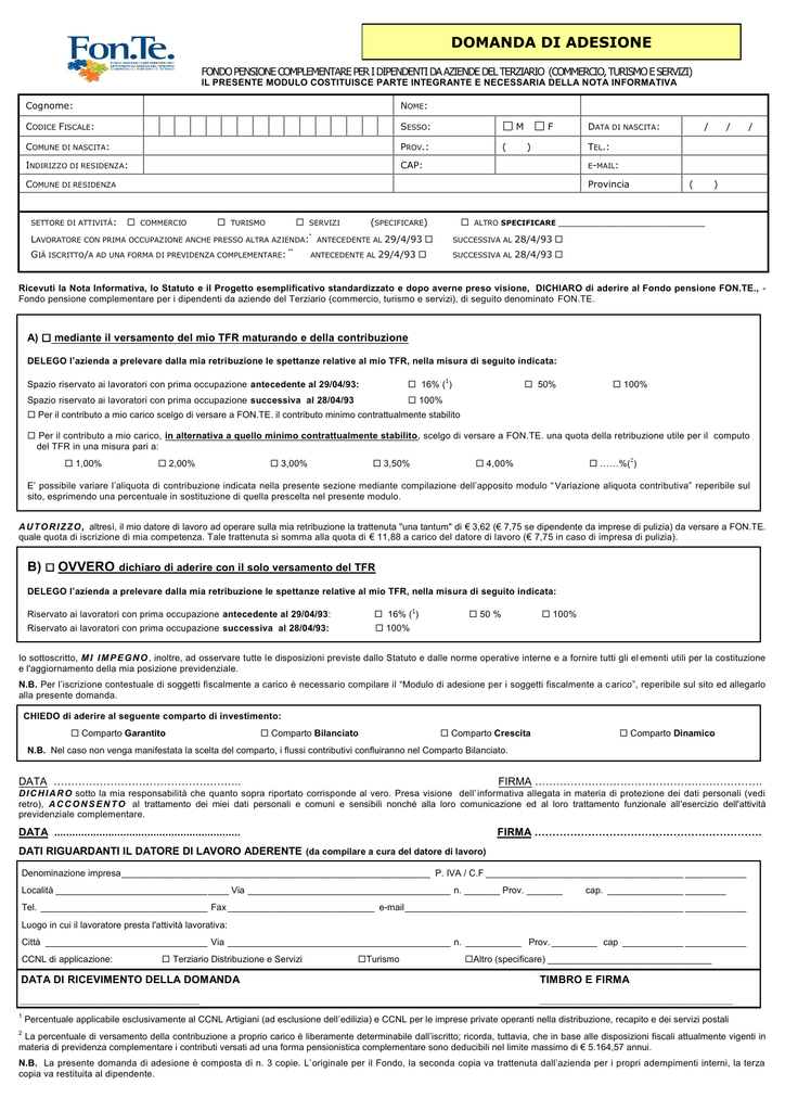 DOMANDA DI ADESIONE FONDO PENSIONE COMPLEMENTARE PER I DIPENDENTI DA AZIENDE DEL TERZIARIO (COMMERCIO, TURISMO E SERVIZI) IL PRESENTE MODULO COSTITUISCE PARTE INTEGRANTE E NECESSARIA DELLA NOTA INFORMATIVA Cognome: NOME: CODICE FISCALE: SESSO: COMUNE DI NASCITA: PROV.: INDIRIZZO DI RESIDENZA: CAP: M ( F DATA DI NASCITA: ) COMMERCIO TURISMO LAVORATORE CON PRIMA OCCUPAZIONE ANCHE PRESSO ALTRA AZIENDA: * GIÀ ISCRITTO/A AD UNA FORMA DI PREVIDENZA COMPLEMENTARE: ** (SPECIFICARE) SERVIZI ANTECEDENTE AL ANTECEDENTE AL / E-MAIL: Provincia / TEL.: COMUNE DI RESIDENZA SETTORE DI ATTIVITÀ: / 29/4/93 29/4/93 ALTRO SPECIFICARE ( ) _________________________ SUCCESSIVA AL 28/4/93 SUCCESSIVA AL 28/4/93 Ricevuti la Nota Informativa, lo Statuto e il Progetto esemplificativo standardizzato e dopo averne preso visione, DICHIARO di aderire al Fondo pensione FON.TE., Fondo pensione complementare per i dipendenti da aziende del Terziario (commercio, turismo e servizi), di seguito denominato FON.TE. A) mediante il versamento del mio TFR maturando e della contribuzione DELEGO l’azienda a prelevare dalla mia retribuzione le spettanze relative al mio TFR, nella misura di seguito indicata: Spazio riservato ai lavoratori con prima occupazione antecedente al 29/04/93: 16% (1) Spazio riservato ai lavoratori con prima occupazione successiva al 28/04/93 100% 50% 100% Per il contributo a mio carico scelgo di versare a FON.TE. il contributo minimo contrattualmente stabilito Per il contributo a mio carico, in alternativa a quello minimo contrattualmente stabilito, scelgo di versare a FON.TE. una quota della retribuzione utile per il computo del TFR in una misura pari a: 1,00% 2,00% 3,00% 3,50% ……%(2) 4,00% E’ possibile variare l’aliquota di contribuzione indicata nella presente sezione mediante compilazione dell’apposito modulo “ Variazione aliquota contributiva” reperibile sul sito, esprimendo una percentuale in sostituzione di quella prescelta nel presente modulo. A U T O R I Z Z O , altresì, il mio datore di lavoro ad operare sulla mia retribuzione la trattenuta "una tantum" di € 3,62 (€ 7,75 se dipendente da imprese di pulizia) da versare a FON.TE. quale quota di iscrizione di mia competenza. Tale trattenuta si somma alla quota di € 11,88 a carico del datore di lavoro (€ 7,75 in caso di impresa di pulizia). B) OVVERO dichiaro di aderire con il solo versamento del TFR DELEGO l’azienda a prelevare dalla mia retribuzione le spettanze relative al mio TFR, nella misura di seguito indicata: Riservato ai lavoratori con prima occupazione antecedente al 29/04/93: 16% (1) Riservato ai lavoratori con prima occupazione successiva al 28/04/93: 100% 50 % 100% Nel caso di versamento del solo TFR sono cosciente che non mi è dovuto il contributo da parte del datore di lavoro ed autoriz zo FON.TE. a prelevare lo 0,10% dalla mia posizione quale quota associativa annua Io sottoscritto, M I I M P E G N O , inoltre, ad osservare tutte le disposizioni previste dallo Statuto e dalle norme operative interne e a fornire tutti gli el ementi utili per la costituzione e l'aggiornamento della mia posizione previdenziale. N.B. Per l’iscrizione contestuale di soggetti fiscalmente a carico è necessario compilare il “Modulo di adesione per i soggetti fiscalmente a c arico”, reperibile sul sito ed allegarlo alla presente domanda. C CHIEDO di aderire al seguente comparto di investimento: Comparto Garantito Comparto Bilanciato Comparto Crescita Comparto Dinamico N.B. Nel caso non venga manifestata la scelta del comparto, i flussi contributivi confluiranno nel Comparto Bilanciato. DATA …………………………………………….. FIRMA ………………………………………………………. D I C H I A R O sotto la mia responsabilità che quanto sopra riportato corrisponde al vero. Presa visione dell’ informativa allegata in materia di protezione dei dati personali (vedi retro), A C C O N S E N T O al trattamento dei miei dati personali e comuni e sensibili nonché alla loro comunicazione ed al loro trattamento funzionale all'esercizio dell'attività previdenziale complementare. FIRMA ………………………………………………………. DATA .............................................................. DATI RIGUARDANTI IL DATORE DI LAVORO ADERENTE (da compilare a cura del datore di lavoro) Denominazione impresa _____________________________________________________________ P. IVA / C.F _______________________________________ ____________ Località ______________________________ ____ Via ________________________________________ n. _______ Prov. _______ cap. _______________ ________ Tel. _________________________________ Fax _____________________________ e-mail _______________________________________________________ ____________ Luogo in cui il lavoratore presta l'attività lavorativa: Città ________________________________ Via ____________________________________________ n. ___________ Prov. _________ cap ____________ ____________ CCNL di applicazione: Terziario Distribuzione e Servizi Turismo Altro (specificare) ________________________________ DATA DI RICEVIMENTO DELLA DOMANDA TIMBRO E FIRMA _______________________________________ __________________________________________ 1 Percentuale applicabile esclusivamente al CCNL Artigiani (ad esclusione dell’edilizia) e CCNL per le imprese private operanti nella distribuzione, recapito e dei servizi postali 2 La percentuale di versamento della contribuzione a proprio carico è liberamente determinabile dall’iscritto; ricorda, tuttavia, che in base alle disposizioni fiscali attualmente vigenti in materia di previdenza complementare i contributi versati ad una forma pensionistica complementare sono deducibili nel limite massimo di € 5.164,57 annui. N.B. La presente domanda di adesione è composta di n. 3 copie. L’originale per il Fondo, la seconda copia va trattenuta dall’azienda per i propri adempimenti interni, la terza copia va resti