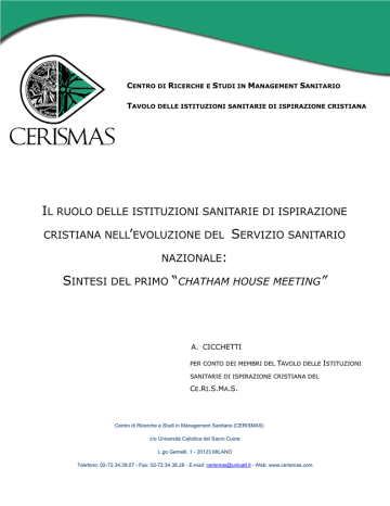 CENTRO DI RICERCHE E STUDI IN MANAGEMENT SANITARIO TAVOLO DELLE ISTITUZIONI SANITARIE DI ISPIRAZIONE CRISTIANA IL RUOLO DELLE ISTITUZIONI SANITARIE DI ISPIRAZIONE CRISTIANA NELL’EVOLUZIONE DEL SERVIZIO SANITARIO NAZIONALE: SINTESI DEL PRIMO “CHATHAM HOUSE MEETING” A. CICCHETTI PER CONTO DEI MEMBRI DEL TAVOLO DELLE ISTITUZIONI SANITARIE DI ISPIRAZIONE CRISTIANA DEL CE.RI.S.MA.S. Centro di Ricerche e Studi in Management Sanitario (CERISMAS) c/o Università Cattolica del Sacro Cuore L.go Gemelli, 1 - 20123 MILANO Telefono: 02-72.34.39.07 - Fax: 02-72.34.38.28 - E-mail: [email protected] - Web: www.cerismas.com La struttura del tavolo e i suoi obiettivi Il Ce.Ri.S.Ma.S. ha invitato le istituzioni sanitarie di ispirazione cristiana associate nel Centro a cooperare sulla base di un programma condiviso che prevede attività di ricerca e formazione, progetti sul campo ed eventi mirati alle esigenze di tali istituzioni. Tra le iniziative concordate rientrano una serie di incontri che si realizzano a porte chiuse che intendono favorire una discussione aperta e genuina sui temi strategici della presenza delle istituzioni sanitarie di ispirazione cristiana nel sistema sanitario italiano. Nella prima edizione, oltre ai ricercatori Ce.Ri.S.Ma.S., sono stati presenti rappresentanti delle seguenti istituzioni: • • • • • • • • Casa di Cura Columbus Casa Sollievo della Sofferenza, San Giovanni Rotondo Fondazione Don Carlo Gnocchi Fondazione Maddalena Grassi Fondazione Poliambulanza Fondazione San Camillo Ordine Ospedaliero S. Giovanni di Dio Fatebenefratelli, Provincia Lombardo-Veneta Policlinico universitario “A. Gemelli” Nel primo incontro sono stati invitati a partecipare Mons. Carmine Arice, Direttore dell’Ufficio Nazionale per la Pastorale della Salute della Conferenza Episcopale Italiana, un rappresentante dell’Agenzia Nazionale per i Servizi Sanitari Regionali (Age.Na.S.) e un membro del Consiglio Regionale del Lazio. La denominazione scelta per l’incontro, Chatham House Meeting, si ispira al luogo dove si svolgono gli incontri del Royal Institute of International Affairs di Londra. Le regole di ingaggio: metodologia L’incontro del 4 ottobre 2013, presso l’Isola Tiberina, Ospedale Fatebenefratelli, si è svolto secondo la Chatham House Rule. La Chatham House Rule è un principio che governa la confidenzialità della fonte dell’informazione ricevuta durante un meeting. La regola si origina nel giugno 1927 nel Royal Institute of International Affairs inglese, think tank dedicato alle relazioni e alle politiche internazionali. La “regola”, dopo la sua revision ultima del 2002, stauisce che quando un meeting si svolge sotto la Chatham House Rule, i partecipanti sono liberi di usare l’informazione ricevuta ma né l’identità né l’affilizazione dello speaker o di altro partecipante al meeting potrà essere rivelata. Nel caso del tavolo delle istituzioni di ispirazione cristiana, l’adozione di questa regola permette ad ogni membro di esprimere opinioni che hanno carattere personale pur derivante dalla propria esperienza e prospettiva. Le sue opinioni non potranno essere considerate come posizioni ufficiali dell’istituzione a cui appartiene. Tutte le informazioni relative alle risultanze delle discussioni che avvengono nell’assemblea potranno essere liberamente utilizzate dagli altri membri ma mai correlate a chi le ha espresse. Si è concordato che i risultati della discussione potranno essere resi pubblici solo in presenza di un accordo unanime tra i partecipanti e secondo le forme concordate (es. articolo scientifico, documento di posizione, linee guida, etc.). I temi in discussione Il primo “Chatam House Meeting” è stato dedicato all’analisi dell’evoluzione recente del Servizio sanitario nazionale negli attuali scenari del welfare e al ruolo che le istituzioni sanitarie di ispirazione cristiana giocano e potranno giocare in un contesto in piena evoluzione. In particolare le domande proposte agli interlocutori del tavolo e agli invitati hanno riguardato: la sostenibilità dell’attuale modello “universalistico” e le implicazioni sull’equità del sistema sanitario; la presenza o meno di spazi di miglioramento e razionalizzazione in termini di efficacia, appropriatezza ed efficienza; lo scenario dei rapporti tra sistema pubblico e istituzioni non for profit e quelle di ispirazione cristiana, in particolare. L’analisi dello scenario nella prospettiva pubblica Anche grazie alla presenza di rappresentanti del sistema pubblico, è stato possibile ricostruire i trend caratterizzanti il Servizio Sanitario Nazionale (Ssn). Il Ssn è oggi alle prese con una crisi che lo mette in difficoltà sotto il profilo economico-finanziario minando la possibilità di confermare il modello universalistico che ne ha caratterizzato i primi 35 anni di vita. L’attuale sistema dei LEA garantisce ai cittadini delle Regioni italiane l’accesso ad un pacchetto di servizi molto ampio con l’esclusione di alcune prestazioni elencate nelle tabelle allegate al DPCM del 2001 che li definisce. L’aggiornamento al DEF (Documento di Economia e Finanza), per la prima volta, parla di svolta verso un modello universalistico di tipo “selettivo” come risposta alle nuove condizioni di finanza pubblica. Lo stesso DEF ridefinisce lo scenario delle risorse disponibili (Tabb. 1 e 2). Tabella 1. Spesa sanitaria (2009-2012) Valori in Migliaia di Euro. Fonte: DEF 2013 Tabella 2. Previsione della spesa sanitaria (2013-2017 Valori in Migliaia di Euro. Fonte: DEF 2013 Le tabelle mostrano che le risorse per l’Ssn tra il 2011 e il 2012 si sono ridotte per la prima volta dopo 20 anni di crescita della spesa sanitaria a tassi medi del 4,5%/anno. Per gli anni a venire la crescita si assesterà sotto il 2%/anno con risorse su PIL in decrescita (dal 7,1% al 6,7%). La transizione verso un sistema universalistico di tipo “selettivo” non implica però necessariamente un “raziona