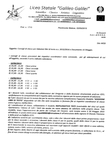 L,ic:tzo Sfa ta le "Go lileo Go lilei,, @ iîcientifico - cÍassico - Artistico - Linguktico Tel. 082,3t / 7 H Via Aldo Moro,4 - 81076 hIEDIMONTE MATESE (Caserta) 87 657 4- Fax 082 3/7 8462 7 sÍto w"b, ,e-tnail: cepso4ùOD?(àistruziane.it - ù6: Prot. n. 1'715 W W Piedimonte Matese, OA0S/201 s Ai Docenti e p.c. alD.S.G.A. sede Sito WEB oggetto: cc'nsig1; di clossc: pc,r Adozioni libri ditesto a.s. 201s/20t6 e Documento 15 Maggio. I consigli di classe presiedut:i dai all'oggetto, secondo - 72105 il sotta rispettivi coordinatori sono convocoti, per gti adempi,menti indicato calendario: di cui 1'15 7) 74,30 - 7!;3A 2) 75,30 - 76,30 3) 16,30 - 7)t,30 4) 17,30 - 18,30 Classi p,rinte' Clossiseconde Classiterzet C/ossi quorte - 73t05t^nls 1) 74,30 2) 75,30 3) 76,30 - 75i,30 - 76;3A - 77130 4) 77,30 - i.8|30 e, V CS V AS e: V GiS V e BS e' lt tlC V'DS V'llA V'ES a) I docenti tutti, coetrdinat,i tlai collaboratori del Dirigente e dalla funzione strumentale prof.ssa tZZo, verificheronno la compotibititt,ù ed il rispetto della normativa vigente per le nuove proposte di adozione. b) Tutti i docenti sia per la nurova che per lo vecchio adozione compileronno l'apposito Modello ,,ADoztoNE LIBRI Dl rEsro" dispctnibil'e sul sito che sarù recapitato in formato fite ai rispettivi coordinatori di classe entro il giorno 14/05/:?015. c) I coordinatori di closs€, ut:ilizzeranno il rnodello RtEPtLoGATtvo rEsrt (scaricabile dat sito) sul quale riporteranno !'elenco di t'tttti ri testi (sia vecchie che nuove adozioni) do odottare nella propria classe. Tale modello, dapo l'apprttva;:ionr? da parte det cottegio dei Docenti, sarà inviato entro it 2o M,aggio 20rS oll'indirizza aii posta elettronic:ar: ceps040003@ìstruzione.it oll'attenzione della signoro Di Muntlo Filomena e della prof.ssa Raffett,z \Z.ZO" d) L'adozionc: avverrù per scc'rrimento classi" vale a dire che i docenti delle clossi prime proporranno j testi per le classi seconde ct vicevr?r:so; i docenti delle classi per tlt le quorte; queili delle clossi tv per le quinte classi; mentre i docenti delle clcrssiV proporranna le adozioni per le classi ttt. e) si raccarnsnda !a ntassimtT nel ripartare sugli appositi modelli i doti riferiti a cqsa editrice, 'dttenzione autore, codice ISBN, vctluntÈ e/s tomo, prezzq ecc, f) Nel rispetta delta tibertù dí ttgni docente nel!'esercizio detto propria funzione, si sollecitono le ss.LL., ol fine di non creare disagi econovnhi alle famiglie, di adottare gli stessi testi per classi parollele. g) ll docent:e che propone lu nuova adozione deve consegnare in presidenzo una relazione sullle motivazioni didottiche della propostc ch,e sarà letta nel collegio dei Docenti. h) I docenti sona tenuti al ri:;petto del tetto massimo di spesa, stabilito dalla recentissima nota M1)R n. 3690 del 219/04/2015; pert:o'nto i singoti consigli dí classr in partícolare e il rispettìvo coordinatore, dovronno porre massimar at'tenzione ad eventuoli sforamentì. Per agevolare il lovoro di turtt'i i docenti, nel rispetto det D.M. 43/il, det D.M. 43/12, det6 c.Mt. 2sg1/14 è stoto stiloto il nrospe'tto segy,ellgs che stabilisce iltetto massimo: t anno 347,5 sctenze 288 273,6 246,6 347,5 ll anna 773,7 200,7 787,2 764,7 773,7 lll onno 343,9 288 288 232,2 279 lV anno 279 255,6 255,6 773,7 279 V onno 320 305 305 203 320 i) Si ribadist:e la delicotezz'a ,sleile su indicate operazioni e !'invito al rispetto delle norme vigentti. l) Le adozioni dei testi s'aro'ntno valutote e deiiberate nel Collegio dei Docenti che si terròr L)JNED:, Maggio. lg