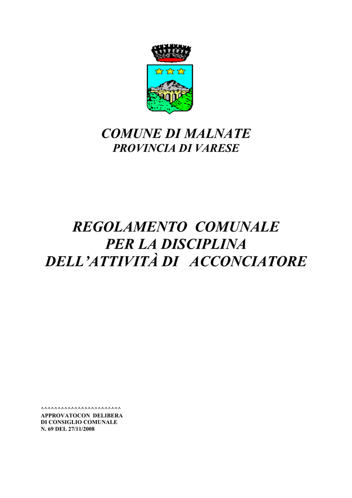 COMUNE DI MALNATE PROVINCIA DI VARESE REGOLAMENTO COMUNALE PER LA DISCIPLINA DELL’ATTIVITÀ DI ACCONCIATORE ^^^^^^^^^^^^^^^^^^^^^^^^ APPROVATOCON DELIBERA DI CONSIGLIO COMUNALE N. 69 DEL 27/11/2008 Indice Art.1 Art.2 Art.3 Art.4 Art.5 Art.6 Art.7 Art.8 Art.9 Art.10 Art.11 Art.12 Art.13 Art.14 Art.15 Art.16 Art.17 Art.18 Art.19 Art.20 Art.21 Art.22 1 Tipi di attività Luogo di svolgimento dell’attività Comunicazione di inizio attività Commissione Consultiva Comunale Qualificazione professionale Requisiti igienico-sanitari degli addetti Requisiti igienico-sanitari dei locali e delle attività connesse Servizi igienici Modalità per l’adeguamento die locali Attività miste Trasferimento di sede Sospensione o revoca del diritto ad esercitare Subingresso o modifiche Giorni ed orari di esercizio dell’attività Esercizio dell’attività all’interno di circoli privati, strutture ricettive, luoghi di cura, fitness e simili Obblighi nell’esercizio dell’attività Rifiuti Vigilanza ed ispezioni Sanzioni Sanzioni accessorie Rinvio a norme vigenti – Entrata in vigore Pubblicità del Regolamento Pag.2 Pag.2 Pag.3 Pag.3 Pag.4 Pag.4 Pag.4 Pag.4 Pag.5 Pag.5 Pag.5 Pag.6 Pag.6 Pag.7 Pag.7 Pag.7 Pag.8 Pag.8 Pag.8 Pag.8 Pag.9 Pag.9 Art. 1 - Tipi di attività L’attività di acconciatore, esercitata unificatamente su tutto il territorio comunale a favore sia di uomini che donne, in luogo pubblico o privato, anche a titolo gratuito, è disciplinata: dalla legge 17 agosto 2005 n.174; dall’art. 10 del Decreto Legge n.7/2007 coordinato e modificato dalla Legge di conversione n.40/2007; dalla DGR. n.6919 del 02/04/2008; dalla DGR n.7813 del 16/07/2008; dalle disposizioni regionali vigenti; dalle disposizioni contenute nel vigente Regolamento Locale d’Igiene; dalle disposizioni del decreto legislativo n. 267/2000; dalle disposizioni del presente Regolamento. Le disposizioni di cui alla Legge n.161 del 14/02/1963, modificata dalla Legge n. 1142, ed integrata dalla Legge n.735 del 29/10/1984, restano vigenti nelle sole parti compatibili con la Legge 17/08/2005, n.174. La suddetta attività, svolta nel rispetto dei principi della libera iniziativa economica, può essere esercitate in forma di impresa ai sensi delle vigenti norme relative alle attività imprenditoriali. L’attività di acconciatore comprende tutti i trattamenti ed i servizi svolti a modificare, migliorare, mantenere e proteggere l’aspetto estetico dei capelli, ivi compresi i trattamenti tricologici complementari, che non implichino prestazioni di carattere medico, curativo o sanitario, nonché il taglio ed il trattamento estetico della barba ed ogni altro servizio inerente e complementare. Inoltre possono essere svolti prestazioni semplici di manicure e pedicure estetico. I trattamenti ed i servizi di cui al precedente comma possono essere svolti anche con l’applicazione dei prodotti cosmetici così come definiti dalle disposizioni specifiche vigenti. Nel presente Regolamento per ragioni di semplicità si utilizzerà la seguente terminologia: Ufficio: lo Sportello Unico Attività Produttive (S.U.A.P.) Responsabile del procedimento: il responsabile dello S.U.A.P. Attività: l’attività di acconciatore Locali: gli spazi ove viene svolta l’attività di acconciatore comprensivi degli ingressi, locali accessori e servizi igienici in uso alla clientela ed al personale Posto di lavoro: si intende una postazione con presenza di specchio D.i.a.p.: dichiarazione di inizio attività produttiva da presentarsi ai sensi delle leggi regionali n.1/2007 e 8/2007 e della DGR n.6919/2008. Art. 2 – Luogo di svolgimento dell’attività L’attività di acconciatore deve essere svolta in locali rispondenti alle vigenti norme urbanistico-edilizie e igienico-sanitarie. Non è consentito lo svolgimento delle attività di acconciatore in forma ambulante o con l’utilizzo di posteggio su area aperta al pubblico. Le imprese autorizzate ad operare in sede fissa, ovunque esse aventi la sede legale ed i locali di esercizio, possono esercitare l’attività di acconciatore sul territorio comunale a favore di persone impegnate in attività inerenti la moda o lo spettacolo, persone ammalate od immobilizzate od incapaci a deambulare. 2 L’esercizio dell’attività all’interno di luoghi di cura, riabilitazione, caserme, luoghi di detenzione o altro, può avvenire solamente a seguito di stipulazione di apposite convenzioni con i relativi soggetti pubblici. L’attività può essere esercitata anche presso il domicilio dell’esercente, a condizione che i locali adibiti all’esercizio della professione abbiano i requisiti di cui al successivo art. 7. Art. 3 – Comunicazione di inizio attività Chiunque intenda esercitare nell’ambito del territorio comunale l’attività di acconciatore deve presentare apposita D.i.a.p. La presentazione della D.i.a.p.. ha efficacia immediata per l’inizio dell’attività. La D.i.a.p. deve essere presentata al Comune e deve contenere i seguenti requisiti essenziali: cognome e nome, luogo e data di nascita, residenza e codice fiscale del richiedente; denominazione della ditta con i relativi dati anagrafici e fiscali; precisa ubicazione dei locali ove viene esercitata l’attività e la sua superficie; dichiarazione relativa al possesso dei requisiti morali; dichiarazione relativa al possesso della abilitazione professionale degli addetti; dichiarazione relative al rispetto della normativa urbanistico-edilizia; dichiarazione relativa al rispetto delle disposizioni igienico-sanitarie; il numero degli addetti e dei posti lavoro. Alla D.I.A.P.. dovranno essere allegati i seguenti documenti: planimetria in scala 1:100 oppure 1:200 dei locali da utilizzarsi per l’attività, con indicato la destinazione d’uso dei singoli spazi, la dislocazione dei posti di lavoro, la rete fognaria interna, gli ingressi, sottoscritta dal richiedente; scheda finalizzata alla notifica ASL territorialmente competente ai sensi dell’art.