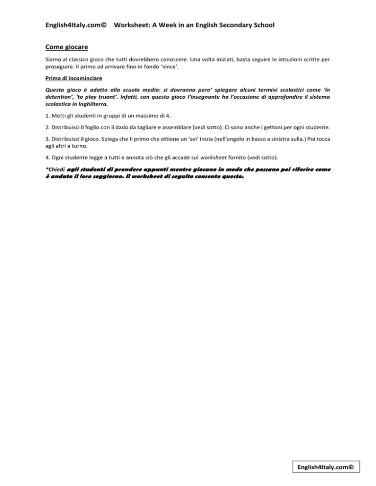 English4Italy.com© Worksheet: A Week in an English Secondary School Come giocare Siamo al classico gioco che tutti dovrebbero conoscere. Una volta iniziati, basta seguire le istruzioni scritte per proseguire. Il primo ad arrivare fino in fondo ‘vince’. Prima di incominciare Questo gioco è adatto alla scuola media: si dovranno pero’ spiegare alcuni termini scolastici come ‘in detention’, ‘to play truant’. Infatti, con questo gioco l’insegnante ha l’occasione di approfondire il sistema scolastica in Inghilterra. 1. Metti gli studenti in gruppi di un massimo di 4. 2. Distribuisci il foglio con il dado da tagliare e assemblare (vedi sotto). Ci sono anche i gettoni per ogni studente. 3. Distribuisci il gioco. Spiega che Il primo che ottiene un ‘sei’ inizia (nell'angolo in basso a sinistra sulla.) Poi tocca agli altri a turno. 4. Ogni studente legge a tutti e annota ciò che gli accade sul worksheet fornito (vedi sotto). *Chiedi agli studenti di prendere appunti mentre giocano in modo che possano poi riferire come è andato il loro soggiorno. Il worksheet di seguito consente questo. English4Italy.com© English4Italy.com© Worksheet: A Week in an English Secondary School English4Italy.com© English4Italy.com© Worksheet: A Week in an English Secondary School Date………………… A Week in an English School Almeno cominci alle 9… Name (of victim): …………………………………. My Notes Torna quando vuoi: ti aspetto… Non aver paura! English4Italy.com©