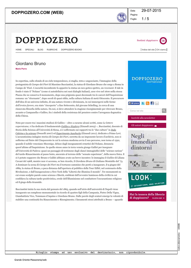 DOPPIOZERO.COM (WEB) 29-07-2015 Data Pagina 1 / 5 Foglio Sostieni doppiozero HOME SPECIALI BLOG RUBRICHE DOPPIOZERO BOOKS Indice del sito Chi siamo Giordano Bruno Mario Porro In copertina, sullo sfondo di un cielo temporalesco, si staglia, tetra e angosciante, l’immagine della protagonista di Campo dei Fiori di Massimo Bucciantini, la statua di Giordano Bruno che sorge a Roma in Campo de’ Fiori. L’oscurità incombente fa apparire la statua un neo-gotico spettro, un revenant. E tale in fondo è stato il “Nolano” (come si autodefiniva nei suoi dialoghi italiani), arso vivo nel 1600 nella stessa Piazza che ne conserva il monumento, dopo una prigionia quasi decennale tra le carceri dell’Inquisizione romana: un “ritornante”, dopo secoli di quasi oblio, nella cultura italiana di metà Ottocento. Il precursore dell’idea di un universo infinito, di una natura vivente e divinizzata, in cui immergersi nelle forme Mi piace dell’eroico furore, era stato “riscoperto” a fine Settecento, dal giovane Schelling, in cerca di una rinnovata filosofia della natura. Da noi, si deve attendere la stagione risorgimentale per ritrovare Bruno, accanto a Campanella e Galileo, fra i simboli della resistenza del pensiero contro l’arroganza dogmatica della Chiesa. Cerca nel sito Iscriviti alla newsletter Noto per essere tra i massimi studiosi di Galileo – oltre a curarne alcuni scritti, come Le lettere copernicane, vi ha dedicato il fondamentale Galileo e Keplero (Einaudi 2003) –, Bucciantini, docente di Gli autori doppiozero Storia della Scienza all’Università di Siena, si è soffermato sui rapporti tra le “due culture” in Italo Calvino e la scienza (Donzelli 2007) ed Esperimento Auschwitz (Einaudi 2011), dedicato a Primo Levi. L’accuratissima indagine storica di Campo dei Fiori, sorretta da un imponente lavoro d’archivio, non si sofferma sul finire del Cinquecento in cui la scienza moderna avvia il suo percorso, non torna al 1592, quando il nobile veneziano Mocenigo, deluso dagli insegnamenti ermetici del Nolano, denuncia quest’ultimo all’Inquisizione. In quello stesso anno in terra veneta giunge Galilei per insegnare all’Università di Padova: quasi un passaggio di testimone dagli slanci immaginifici delle “scienze curiose” del tardo-Rinascimento al passo lento, ancorato al terreno delle “sensate esperienze”, della nuova fisica. E si è potuto supporre che Bruno e Galilei abbiano avuto un breve incontro: lo immagina il Galileo di Liliana Cavani del 1968, mentre non vi accenna, se ben ricordo, il Giordano Bruno di Giuliano Montaldo del ’73. A dominare la scena di Campo dei Fiori sta il tortuoso cammino che portò a inaugurare, il 9 giugno del 1889, la statua di Bruno, a poca distanza dall’apertura al pubblico della Tour Eiffel, nel centenario della Rivoluzione, e dall’inaugurazione a New York della “Libertà che illumina il mondo”. Tre monumenti su cui erano scolpite parole come scienza e libertà, emblemi dell’avvenire luminoso della civiltà in cui confidava la cultura tardo-positivistica, erede dell’Illuminismo nel combattere l’oscurantismo religioso ed il giogo della tirannide. Bucciantini inizia la sua storia dal gennaio del 1865, quando nell’atrio dell’università di Napoli viene inaugurato un complesso monumentale in ricordo di quattro figli della Campania, Pietro Della Vigna, Giambattista Vico, Tommaso d’Aquino e Giordano Bruno. Dalle parole degli oratori emerge la volontà di Codice abbonamento: 105085 stabilire una continuità fra Rinascimento e Risorgimento; i lineamenti stessi attribuiti a Bruno – sguardo Grande Oriente-Massoneria/web DOPPIOZERO.COM (WEB) 29-07-2015 Data Pagina 2 / 5 Foglio fiero mentre impugna il verdetto della condanna ed esclama: “Forse voi giudici pronunciate la sentenza contro di me con più paura di quanta io ne abbia nell’ascoltarla” – sembrano volerne fare un patriota delle guerre d’Indipendenza. Ai piedi della statua di Bruno un gruppo di studenti si ritroverà per dar fuoco al Sillabo dove papa Pio IX condannava le “pestilenti” concezioni laiciste della modernità, dal liberalismo al naturalismo. LIBRI Luoghi comuni: Padani Alberto Volpi “Quel pidocchio lì, che tra l'altro poi ho pensato non era neanche un pidocchio non era, che infatti mia sorella m'ha detto sarà mica una bacca che... DOPPIOZERO BOOKS È nel 1876, l’anno dell’avvento al governo della Sinistra storica, che alcuni studenti universitari promuovono un Comitato allo scopo di edificare un monumento a Bruno. Sono figure che oggi più nessuno ricorda, Adriano Colocci, Alfredo Comandini, liberali radicali, avversi al clima di conciliazione con la Chiesa che dominava le aule della Sapienza. Ma l’idea che il monumento dovesse sorgere proprio in Campo de' Fiori fu di Armand Lévy, ebreo e socialista libertario, rifugiato a Roma dopo la Comune parigina. La sottoscrizione promossa dal Comitato trova scarsa accoglienza fra professori e politici; anche #abbiculturadite il nuovo governo della Sinistra non mostra alcun desiderio di “dar ombra” all’autorità papale. E questo benché Bruno non fosse più in Italia quel signor Nullanus (l’epiteto gli era stato affibbiato dal contemporaneo Tycho Brahe, il grande astronomo danese); l’interesse crescente degli studiosi induceva l’allora ministro dell’Istruzione, Francesco De Sanctis, a pubblicare a spese dello Stato le opere latine di Bruno. Il problema più grave è la mancata adesione della giunta comunale di Roma, guidata dai clericomoderati, perché ad essa spettava la concessione del terreno per il monumento. Tavoli Si trattò di una falsa partenza, e solo tredici anni dopo il progetto, ammorbidito nei toni, troverà attuazione. Nel Comitato d’onore figurano Victor Hugo ed Ernest Renan, Spencer e Swinburne, Haeckel a cura di Marco Belpoliti e Giovanna Silva ed Ibsen, fra gli italiani Carducci e Ardigò, Lombroso e Villari, oltre a politici di varia provenienza, 