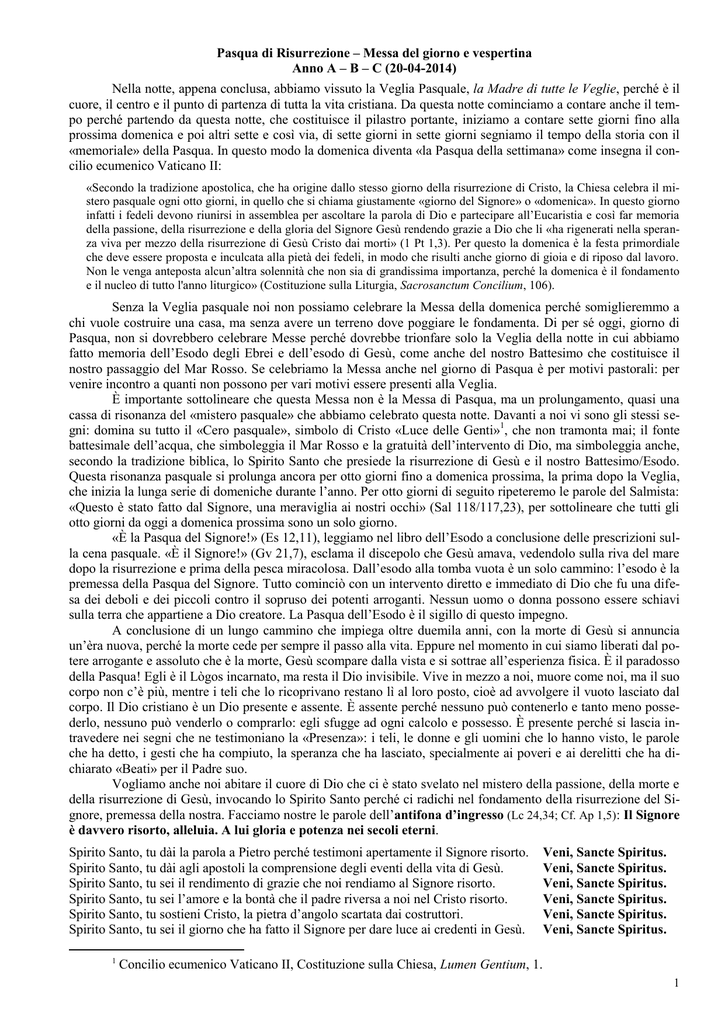 Pasqua di Risurrezione – Messa del giorno e vespertina Anno A – B – C (20-04-2014) Nella notte, appena conclusa, abbiamo vissuto la Veglia Pasquale, la Madre di tutte le Veglie, perché è il cuore, il centro e il punto di partenza di tutta la vita cristiana. Da questa notte cominciamo a contare anche il tempo perché partendo da questa notte, che costituisce il pilastro portante, iniziamo a contare sette giorni fino alla prossima domenica e poi altri sette e così via, di sette giorni in sette giorni segniamo il tempo della storia con il «memoriale» della Pasqua. In questo modo la domenica diventa «la Pasqua della settimana» come insegna il concilio ecumenico Vaticano II: «Secondo la tradizione apostolica, che ha origine dallo stesso giorno della risurrezione di Cristo, la Chiesa celebra il mistero pasquale ogni otto giorni, in quello che si chiama giustamente «giorno del Signore» o «domenica». In questo giorno infatti i fedeli devono riunirsi in assemblea per ascoltare la parola di Dio e partecipare all’Eucaristia e così far memoria della passione, della risurrezione e della gloria del Signore Gesù rendendo grazie a Dio che li «ha rigenerati nella speranza viva per mezzo della risurrezione di Gesù Cristo dai morti» (1 Pt 1,3). Per questo la domenica è la festa primordiale che deve essere proposta e inculcata alla pietà dei fedeli, in modo che risulti anche giorno di gioia e di riposo dal lavoro. Non le venga anteposta alcun’altra solennità che non sia di grandissima importanza, perché la domenica è il fondamento e il nucleo di tutto l'anno liturgico» (Costituzione sulla Liturgia, Sacrosanctum Concilium, 106). Senza la Veglia pasquale noi non possiamo celebrare la Messa della domenica perché somiglieremmo a chi vuole costruire una casa, ma senza avere un terreno dove poggiare le fondamenta. Di per sé oggi, giorno di Pasqua, non si dovrebbero celebrare Messe perché dovrebbe trionfare solo la Veglia della notte in cui abbiamo fatto memoria dell’Esodo degli Ebrei e dell’esodo di Gesù, come anche del nostro Battesimo che costituisce il nostro passaggio del Mar Rosso. Se celebriamo la Messa anche nel giorno di Pasqua è per motivi pastorali: per venire incontro a quanti non possono per vari motivi essere presenti alla Veglia. È importante sottolineare che questa Messa non è la Messa di Pasqua, ma un prolungamento, quasi una cassa di risonanza del «mistero pasquale» che abbiamo celebrato questa notte. Davanti a noi vi sono gli stessi segni: domina su tutto il «Cero pasquale», simbolo di Cristo «Luce delle Genti»1, che non tramonta mai; il fonte battesimale dell’acqua, che simboleggia il Mar Rosso e la gratuità dell’intervento di Dio, ma simboleggia anche, secondo la tradizione biblica, lo Spirito Santo che presiede la risurrezione di Gesù e il nostro Battesimo/Esodo. Questa risonanza pasquale si prolunga ancora per otto giorni fino a domenica prossima, la prima dopo la Veglia, che inizia la lunga serie di domeniche durante l’anno. Per otto giorni di seguito ripeteremo le parole del Salmista: «Questo è stato fatto dal Signore, una meraviglia ai nostri occhi» (Sal 118/117,23), per sottolineare che tutti gli otto giorni da oggi a domenica prossima sono un solo giorno. «È la Pasqua del Signore!» (Es 12,11), leggiamo nel libro dell’Esodo a conclusione delle prescrizioni sulla cena pasquale. «È il Signore!» (Gv 21,7), esclama il discepolo che Gesù amava, vedendolo sulla riva del mare dopo la risurrezione e prima della pesca miracolosa. Dall’esodo alla tomba vuota è un solo cammino: l’esodo è la premessa della Pasqua del Signore. Tutto cominciò con un intervento diretto e immediato di Dio che fu una difesa dei deboli e dei piccoli contro il sopruso dei potenti arroganti. Nessun uomo o donna possono essere schiavi sulla terra che appartiene a Dio creatore. La Pasqua dell’Esodo è il sigillo di questo impegno. A conclusione di un lungo cammino che impiega oltre duemila anni, con la morte di Gesù si annuncia un’èra nuova, perché la morte cede per sempre il passo alla vita. Eppure nel momento in cui siamo liberati dal potere arrogante e assoluto che è la morte, Gesù scompare dalla vista e si sottrae all’esperienza fisica. È il paradosso della Pasqua! Egli è il Lògos incarnato, ma resta il Dio invisibile. Vive in mezzo a noi, muore come noi, ma il suo corpo non c’è più, mentre i teli che lo ricoprivano restano lì al loro posto, cioè ad avvolgere il vuoto lasciato dal corpo. Il Dio cristiano è un Dio presente e assente. È assente perché nessuno può contenerlo e tanto meno possederlo, nessuno può venderlo o comprarlo: egli sfugge ad ogni calcolo e possesso. È presente perché si lascia intravedere nei segni che ne testimoniano la «Presenza»: i teli, le donne e gli uomini che lo hanno visto, le parole che ha detto, i gesti che ha compiuto, la speranza che ha lasciato, specialmente ai poveri e ai derelitti che ha dichiarato «Beati» per il Padre suo. Vogliamo anche noi abitare il cuore di Dio che ci è stato svelato nel mistero della passione, della morte e della risurrezione di Gesù, invocando lo Spirito Santo perché ci radichi nel fondamento della risurrezione del Signore, premessa della nostra. Facciamo nostre le parole dell’antifona d’ingresso (Lc 24,34; Cf. Ap 1,5): Il Signore è davvero risorto, alleluia. A lui gloria e potenza nei secoli eterni. Spirito Santo, tu dài la parola a Pietro perché testimoni apertamente il Signore risorto. Spirito Santo, tu dài agli apostoli la comprensione degli eventi della vita di Gesù. Spirito Santo, tu sei il rendimento di grazie che noi rendiamo al Signore risorto. Spirito Santo, tu sei l’amore e la bontà che il padre riversa a noi nel Cristo risorto. Spirito Santo, tu sostieni Cristo, la pietra d’angolo scartata dai costruttori. Spirito Santo, tu sei il giorno che ha fatto il Signore per dare luce ai credenti in Gesù. 1 Veni, Sancte Spiritus. Veni, Sa