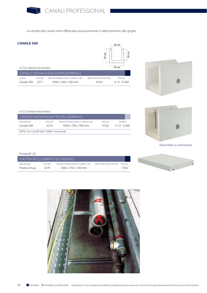 canali professional La vendita dei canali viene effettuata esclusivamente in abbinamento alle griglie. Canale 500 70 cm 55 cm 49 cm 70 cm In CLS vibrato ed armato Canale 500 magnum-drain normale classe Cod. Art. Misure esterne lungh. x largh. x alt. Area di raccolta cm2/ml peso kg 3271 1000 x 700 x 700 mm 410,0 A 15 - E 600 Canale 500 In CLS vibrato ed armato Canale 500 magnum-tecnic normale descrizione Canale 500 Cod. Art. Misure esterne lungh. x largh. x alt. peso kg portata 3270 1000 x 700 x 700 mm 410,0 A 15 - E 600 Note: con 4 profili tipo ”halfen” incorporati. disponibile su ordinazione Portata B 125 Piastra in CLS vibrato ed armato descrizione Piastra chiusa 96 Disponibile Cod. Art. Misure esterne lungh. x largh. x alt. Area di raccolta cm2/ml peso kg 3279 1000 x 750 x 100 mm - 170,0 Disponibile su ordinazione Il produttore si riserva di apportare modifiche ai prodotti senza alcun preavviso. Gli schemi e le quote dimensionali sono forniti a puro titolo indicativo. In CLS a derivazione da 2 a 4 vie pozzetto 500 magnum descrizione Tipo ”normale” Tipo ”antiusura” Cod. Art. Misure esterne lungh. x largh. x alt. peso kg portata 3272 3273 700 x 700 x 700 mm 700 x 700 x 700 mm 265,0 265,0 A 15 - E 600 A 15 - E 600 Note: maglia 30 x 20. Portata B 125 Piastra in CLS vibrato ed armato descrizione Piastra in CLS Cod. Art. Misure esterne lungh. x largh. x alt. Area di raccolta cm2/ml peso kg 3280 720 x 720 x 75 mm - 86,0 Note: per pozzetto magnum tipo normale. coperchio zincato bugnato classe Cod. Art. Misure esterne lungh. x largh. x alt. Area di raccolta cm2/ml peso kg C 250 3277 565 x 565 x 50 mm - 21,0 Note: per pozzetto magnum tipo normale ed antiusura. coperchio zincato bugnato pesante classe Cod. Art. Misure esterne lungh. x largh. x alt. Area di raccolta cm2/ml peso kg E 600 3291 565 x 565 x 100 mm - 52,0 Note: per pozzetto magnum tipo normale ed antiusura. griglia zincata tipo pesante classe Cod. Art. Misure esterne lungh. x largh. x alt. Area di raccolta cm2/ml peso kg E 600 3278 560 x 560 x 50 mm 3689 25,0 Note: per pozzetto magnum tipo normale ed antiusura. Maglia 30 x 20. 99 Canali in CLS canale 500