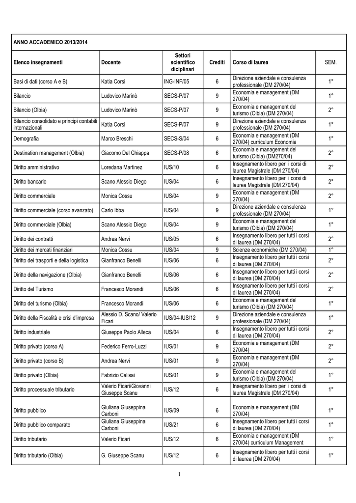 ANNO ACCADEMICO 2013/2014 Settori scientifico diciplinari Elenco insegnamenti Docente Basi di dati (corso A e B) Katia Corsi ING-INF/05 6 Bilancio Ludovico Marinò SECS-P/07 9 Bilancio (Olbia) Ludovico Marinò SECS-P/07 9 Bilancio consolidato e principi contabili Katia Corsi internazionali SECS-P/07 9 Demografia Marco Breschi SECS-S/04 6 Destination management (Olbia) Giacomo Del Chiappa SECS-P/08 6 Diritto amministrativo Loredana Martinez IUS/10 6 Diritto bancario Scano Alessio Diego IUS/04 6 Diritto commerciale Monica Cossu IUS/04 9 Diritto commerciale (corso avanzato) Carlo Ibba IUS/04 9 Diritto commerciale (Olbia) Scano Alessio Diego IUS/04 9 Diritto dei contratti Andrea Nervi IUS/05 6 Diritto dei mercati finanziari Monica Cossu IUS/04 9 Diritto dei trasporti e della logistica Gianfranco Benelli IUS/06 6 Diritto della navigazione (Olbia) Gianfranco Benelli IUS/06 6 Diritto del Turismo Francesco Morandi IUS/06 6 Diritto del turismo (Olbia) Francesco Morandi IUS/06 6 Diritto della Fiscalità e crisi d'impresa Alessio D. Scano/ Valerio Ficari IUS/04-IUS/12 9 Diritto industriale Giuseppe Paolo Alleca IUS/04 6 Diritto privato (corso A) Federico Ferro-Luzzi IUS/01 9 Diritto privato (corso B) Andrea Nervi IUS/01 9 Diritto privato (Olbia) Fabrizio Calisai IUS/01 9 Diritto processuale tributario Valerio Ficari/Giovanni Giuseppe Scanu IUS/12 6 IUS/09 6 IUS/21 6 Diritto pubblico Diritto pubblico comparato Giuliana Giuseppina Carboni Giuliana Giuseppina Carboni Crediti Diritto tributario Valerio Ficari IUS/12 6 Diritto tributario (Olbia) G. Giuseppe Scanu IUS/12 6 1 Corso di laurea Direzione aziendale e consulenza professionale (DM 270/04) Economia e management (DM 270/04) Economia e management del turismo (Olbia) (DM 270/04) Direzione aziendale e consulenza professionale (DM 270/04) Economia e management (DM 270/04) curriculum Economia Economia e management del turismo (Olbia) (DM270/04) Insegnamento libero per i corsi di laurea Magistrale (DM 270/04) Insegnamento libero per i corsi di laurea Magistrale (DM 270/04) Economia e management (DM 270/04) Direzione aziendale e consulenza professionale (DM 270/04) Economia e management del turismo (Olbia) (DM 270/04) Insegnamento libero per tutti i corsi di laurea (DM 270/04) Scienze economiche (DM 270/04) Insegnamento libero per tutti i corsi di laurea (DM 270/04) Insegnamento libero per tutti i corsi di laurea (DM 270/04) Insegnamento libero per tutti i corsi di laurea (DM 270/04) Economia e management del turismo (Olbia) (DM 270/04) Direzione aziendale e consulenza professionale (DM 270/04) Insegnamento libero per tutti i corsi di laurea (DM 270/04) Economia e management (DM 270/04) Economia e management (DM 270/04) Economia e management del turismo (Olbia) (DM 270/04) Insegnamento libero per i corsi di laurea Magistrale (DM 270/04) Economia e management (DM 270/04) Insegnamento libero per tutti i corsi di laurea (DM 270/04) Economia e management (DM 270/04) curriculum Management Insegnamento libero per tutti i corsi di laurea (DM 270/04) SEM. 1° 1° 2° 1° 1° 2° 2° 2° 2° 1° 1° 2° 1° 2° 2° 2° 1° 1° 2° 2° 2° 1° 1° 1° 1° 1° 1° Econometria Juan de Dios Tena Horillo SECS-P/05 12 Economia aziendale (corso A e B) Francesco Manca SECS-P/07 12 Economia aziendale (Olbia) Lucia Giovanelli SECS-P/07 12 Economia degli intermediari finanziari Ornella Moro SECS-P/11 6 Economia degli intermediari finanziari Ornella Moro SECS-P/11 9 Economia dei trasporti e dell’ambiente Gerardo Marletto (Olbia) SECS-P/06 9 Economia del turismo (Olbia) Claudio Detotto SECS-P/01 9 Economia delle amministrazioni pubbliche Lucia Giovanelli SECS-P/07 6 Economia e finanza Luca Deidda SECS-P/01 9 Economia e gestione delle imprese Daniele Porcheddu SECS-P/08 9 Economia e organizzazione industriale Oliviero Carboni SECS-P/01 12 Economia e popolazione Lucia Pozzi SECS-S/04 6 Economia industriale Gianfranco Atzeni SECS-P/01 6 Economia internazionale Gianfranco Atzeni SECS-P/01 9 Economia monetaria internazionale Marco Vannini SECS-P/01 6 Etica economica Mariella Pinna M-FIL/03 6 Finanza aziendale- corso avanzato Andrea Carosi SECS-P/09 9 Finanza aziendale Roberto Mazzei SECS-P/09 9 Finanza aziendale (Olbia) Giovanni Pinna Parpaglia SECS-P/09 6 ING-INF/05 6 M-GRR/02 6 Carlo Donato M-GRR/02 6 Silvia Battino M-GRR/02 6 Giacomo Del Chiappa SECS-P/08 9 Laboratorio di economia e finanza Martino Unali ING-INF/05 6 Laboratorio di economia territoriale Brunella Brundu M-GRR/02 6 Laboratorio giuridico di finanza strutturata Monica Cossu IUS/04 6 Lingua inglese II Amorelli M.I. L-LIN/12 6 L-LIN/12 6 L-LIN/12 3 Fondamenti di informatica (corso A, B, Danilo Delpini C, D) Geoeconomia e commercio Carlo Donato internazionale Geografia economica Geografia economica e del turismo (Olbia) Gestione delle imprese e marketing del turismo (Olbia) Lingua inglese per il turismo (Olbia) Lingua inglese per l’economia CLA CLA 2 Scienze economiche (DM 270/04) Economia e management (DM 270/04) Economia e management del turismo (Olbia) (DM 270/04) Scienze economiche (DM 270/04) Direzione aziendale e consulenza professionale (DM 270/04) Economia e management del turismo (Olbia) (DM 270/04) Economia e management del turismo (Olbia) (DM 270/04) Insegnamento libero per i corsi di laurea Magistrale (DM 270/04) Scienze economiche (DM 270/04) Economia e management (DM 270/04) Direzione aziendale e consulenza professionale (DM 270/04) Insegnamento libero per tutti i corsi di laurea (DM 270/04) Insegnamento libero per tutti i corsi di laurea (DM 270/04) Economia e management (DM 270/04) curriculum Economia Scienze economiche (DM 270/04) Insegnamento libero per tutti i corsi di laurea (DM 270/04) Direzione aziendale e consulenza professionale (DM 270/04) Economia e management (DM 270/04) curriculum Management Economia e management del turismo (Olbia) (DM 270/04) Economia e management Insegnamento libero per tutti i corsi di laurea (DM 270/04) Economia e management (DM 270/04) curriculum Economia Economi