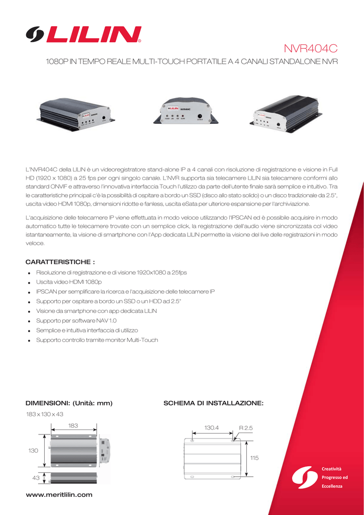 NVR404C 1080P IN TEMPO REALE MULTI-TOUCH PORTATILE A 4 CANALI STANDALONE NVR L’NVR404C della LILIN è un videoregistratore stand-alone IP a 4 canali con risoluzione di registrazione e visione in Full HD (1920 x 1080) a 25 fps per ogni singolo canale. L'NVR supporta sia telecamere LILIN sia telecamere conformi allo standard ONVIF e attraverso l’innovativa interfaccia Touch l'utilizzo da parte dell'utente finale sarà semplice e intuitivo. Tra le caratteristiche principali c'è la possibilità di ospitare a bordo un SSD (disco allo stato solido) o un disco tradizionale da 2.5", uscita video HDMI 1080p, dimensioni ridotte e fanless, uscita eSata per ulteriore espansione per l'archiviazione. L'acquisizione delle telecamere IP viene effettuata in modo veloce utilizzando l'IPSCAN ed è possibile acquisire in modo automatico tutte le telecamere trovate con un semplice click, la registrazione dell'audio viene sincronizzata col video istantaneamente, la visione di smartphone con l'App dedicata LILIN permette la visione del live delle registrazioni in modo veloce. CARATTERISTICHE : • Risoluzione di registrazione e di visione 1920x1080 a 25fps • Uscita video HDMI 1080p • IPSCAN per semplificare la ricerca e l'acquisizione delle telecamere IP • Supporto per ospitare a bordo un SSD o un HDD ad 2.5" • Visione da smartphone con app dedicata LILIN • Supporto per software NAV 1.0 • Semplice e intuitiva interfaccia di utilizzo • Supporto controllo tramite monitor Multi-Touch DIMENSIONI: (Unità: mm) SCHEMA DI INSTALLAZIONE: 183 x 130 x 43 183 130.4 R 2.5 130 115 Creatività 43 Progresso ed Eccellenza www.meritlilin.com SPECIFICHE: Nome Modello Supporto telecamere Ingresso video IP Max banda HDD Registrazione Modalità di registrazione Risoluzione Registrazione video Calendario Backup Backup DVD/RW Riproduzione Risoluzione Riproduzione video Velocità Uscita video Uscita HDMI Risparmio retroilluminazione Multi-touch Multiplexer Multiplexer Suddivisione schermo Zoom digitale Gestione Log Autenticazione Giorni di registrazione Allarme/Eventi Allarme/Eventi Ril. movimento Eventi Email Accessori Accessori Protocollo PTZ Tastiera Ricevitore IR RS-485/RS-232 Mouse Uscita audio Telecomando Rete Porta di rete Accesso di rete Protocolli Web NVR stato IPScan Software Gestione backup Smartphone Altro WDT DST Lingua CPU/OS Dati Tecnici Alimentazione Temperatura utilizzo Dimensioni Peso 1080P in tempo reale multi-touch portatile a 4 canali Stand-alone NVR NVR404C Disco rigido HDD o SSD SATA da 2,5" Speed dome IP, Fish Eye IP, micro camera IP, Zoom camera IP, IVS camera e video server 4 canali (1920x1080) 24 Mbps 1x SATA Continua (H24), calendario (programmabile) e manuale 1080P/ 720P/ D1/ VGA 1080P/ 720P/ D1/ VGA Calendario orario su 7 giorni e 24 ore, modalità di registrazione configurabile Drive USB 2.0 / HTTP file download External USB DVD/RW 1080P/ 720P/ D1/ VGA 1080P/ 720P/ D1/ VGA FR: X2, X4, X8, X16, X32, X64 FF: X2, X4, X8, X16, X32, X64 1920 x 1080 Modalità di risparmio retroilluminazione LCD Supporto USB per controllo monitor multi-touch Fermo immagine 1, 4 In live e riproduzione fino a X64 Ril. di allarme, configurazione, accesso ed esportazione via HTTP o USB Funzione autentificazione utente configurabile Stima giorni di registrazione DI (input) x2 e DO (output) x2 (NA/NC) Griglia 20×12 per ogni telecamera e regolazione sensibilità fino a 8 Allarme esterno, perdita segnale video (video loss), riavvio anomalo del sistema, allarme di movimento, formattazione HDD Notifica di allarme con allegato JPEG Telecomando infrarosso per controllo remoto Via rete LILIN HTTP/ Conforme allo standard ONVIF Tastiera PIH-931D Sì Connettore ingresso tastiera RS-485 x1 USB, mouse-click, mouse scroll, mouse drag RCA, 1 Uscita Sì Gigabit LAN, RJ45 x1 Accesso diretto ad internet tramite browser / Accesso utenti multiplo ARP / TCP/IP / UDP / HTTP / SMTP / FTP / DDNS Live / Evento log & ricerca eventi riproduzione / AVI HTML NVR stato Software IPSCAN per ricerca e acquisizione immediata delle telecamere IP Download e riproduzione multicanali dei file FTP Multipli del NVR Supporto iPhone, iPad, Black Berry e Android Hardware watchdog timer DST (ora legale e ora solare) Inglese, cinese, francese, tedesco, ungherese, polacco, italiano, portoghese, arabo, russo, turco, spagnolo, cinese semplificato ARM cortex A9 processor 600 MHz, linux 2.6 kernel DC 12V, 4.2A / 48W Temp: 0°C − +45°C / Umidità: 0% − 80% 183 x 130 x 43 mm 0.5 Kg (senza HDD) Design e specifiche tecniche sono soggette a modifica senza preavviso.