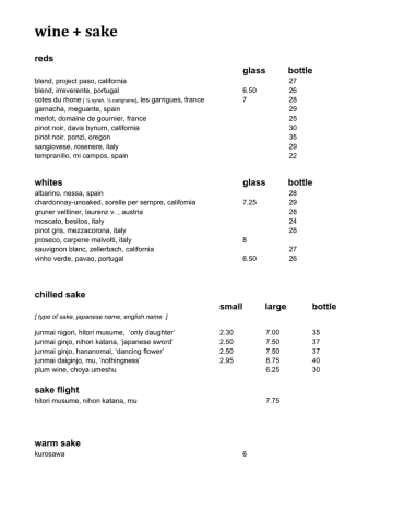 wine + sake reds glass blend, project paso, california blend, irreverente, portugal cotes du rhone [ ½ syrah, ½ carignane], les garrigues, france garnacha, meguante, spain merlot, domaine de gournier, france pinot noir, davis bynum, california pinot noir, ponzi, oregon sangiovese, rosenere, italy tempranillo, mi campos, spain bottle 27 26 28 29 25 30 35 29 22 6.50 7 whites glass albarino, nessa, spain chardonnay-unoaked, sorelle per sempre, california gruner veltliner, laurenz v. , austria moscato, besitos, italy pinot gris, mezzacorona, italy proseco, carpene malvolti, italy sauvignon blanc, zellerbach, california vinho verde, pavao, portugal bottle 28 29 28 24 28 7.25 8 27 26 6.50 chilled sake small large bottle 2.30 2.50 2.50 2.95 7.00 7.50 7.50 8.75 6.25 35 37 37 40 30 [ type of sake, japanese name, english name ] junmai nigori, hitori musume, ‘only daughter’ junmai ginjo, nihon katana, ‘japanese sword’ junmai ginjo, hananomai, ‘dancing flower’ junmai daiginjo, mu, ‘nothingness’ plum wine, choya umeshu sake flight hitori musume, nihon katana, mu 7.75 warm sake kurosawa 6 bottled sake, 300 ml tokubetsu junmai, housui, ‘fragrant water’ 10 beer draft beer pint summit oktoberfest 4 summit pilsener 4 bottled beer beck’s non-alcoholic grain belt premium saison dupont belgian farmhouse ale 3.95 3.25 6.25 japanese beer asahi super dry asahi black hitachino classic ale hitachino nest red rice ale hitachino real ginger brew hitachino nest white ale hitachino nest extra high - XH kirin ichiban sapporo 3.95 4.75 6.50 6.50 6.50 6.50 6.75 3.95 3.95 large asahi super dry kirin ichiban sapporo ‘can’ sapporo reserve 7.50 7.50 7.50 7.50