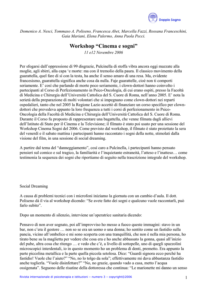 Domenico A. Nesci, Tommaso A. Poliseno, Francesca Abet, Marcella Fazzi, Rossana Franceschini, Gaia Mariani, Elena Palermo, Anna Paola Pecci. Workshop “Cinema e sogni” 11 e12 Novembre 2006 Per sfogarsi dall’oppressione di 99 disgrazie, Pulcinella di stoffa vibra ancora oggi mazzate alla moglie, agli sbirri, alla capa ‘e morte: ma con il tremolio della paura. Il classico movimento della guarattella, quel fare di sì con la testa, ha anche il senso amaro di una resa. Ma, evidente francesismo, guarattella significa anche cosa da nulla. Faje guarattelle, cioè non ti comporti seriamente. E’ così che parlando di morte poco seriamente, i clown-dottori hanno coinvolto i partecipanti al Corso di Perfezionamento in Psico-Oncologia, di cui erano ospiti, presso la Facoltà di Medicina e Chirurgia dell’Università Cattolica del S. Cuore di Roma, nell’anno 2005. E’ nota la serietà della preparazione di molti volontari che si impegnano come clown-dottori nei reparti ospedalieri, tanto che nel 2005 la Regione Lazio accettò di finanziare un corso specifico per clowndottori che prevedeva appunto la loro frequenza a tutti i corsi di perfezionamento in PsicoOncologia della Facoltà di Medicina e Chirurgia dell’Università Cattolica del S. Cuore di Roma. Durante il Corso fu proposto di rappresentare una bagattella, che venne filmata dagli allievi dell’Istituto di Stato per il Cinema e la Televisione; il filmato è stato poi usato per una sessione del Workshop Cinema Sogni del 2006. Come previsto dal workshop, il filmato è stato proiettato la sera del venerdì e il sabato mattina i partecipanti hanno raccontato i sogni della notte, stimolati dalla visione del film, in una sessione di social dreaming. A partire dal tema del “danneggiamento”, così caro a Pulcinella, i partecipanti hanno pensato pensieri sul comico e sul tragico, la familiarità e l’inquietante estraneità, l’atteso e l’inatteso… come testimonia la sequenza dei sogni che riportiamo di seguito nella trascrizione integrale del workshop. Social Dreaming A causa di problemi tecnici con i microfoni iniziamo la giornata con un cambio d’aula. Il dott. Poliseno dà il via al workshop dicendo: “Se avete fatto dei sogni e qualcuno vuole raccontarli, può farlo subito”. Dopo un momento di silenzio, interviene un’operatrice sanitaria dicendo: Pensavo di non aver sognato, poi all’improvviso ho messo a fuoco queste immagini: stavo in un bar, non c’era il gestore … non so se era un uomo o una donna; ho sentito come un fastidio sulla pancia, vicino all’ombelico e mi sono scoperta con una tranquillità, che non è nella mia persona, ho tirato bene su la maglietta per vedere che cosa era e ho anche abbassato la gonna, quasi all’inizio del pube, altra cosa che ritengo … e vedo che c’è, a livello di sottopelle, uno di quegli spazzolini microscopici interdentali, io in questo momento ho un problema di denti, premetto. Era appunto la parte piccolina metallica e la parte quella piccola setolosa. Dice: “Guardi signora ecco perché ha fastidio! Vuole che l’aiuto?” “No, no lo tolgo da sola”; effettivamente mi dava abbastanza fastidio anche toglierla. “Vuole disinfettare?” “No, no grazie, quando vado a casa, metto l’acqua ossigenata”. Seguono delle risatine della dottoressa che continua: “Le marionette mi danno un senso Rivista internazionale di psicoterapia e istituzioni – numero 3 – copyright©2006 1 di distacco, di fisso; quel battere della marionetta quasi m’innervosiva, all’inizio. Non ne ho mai avuto una grossa attrazione, d'altronde, la comicità sicuramente è qualcosa che deve trovare la tua vena, tanto è vero che alcuni attori comici piacciono tantissimo, altri invece no; per esempio a me Totò non mi attira per niente, e lui è un po’ sulla linea. Di nuovo delle risatine a chiudere. Dopo un po’ di silenzio la psicologa R. F. racconta: Il sogno che ho fatto è questo: mi viene recapitata una lettera dall’Ospedale, dove mi si dice che sono in pensione; in realtà mancano ancora dieci anni perché io arrivi a quella data e penso che sia stato un errore da parte dell’Amministrazione, se nonché, parlando con una collega, mi dice: “Guarda vai a sentire perché è strano”, allora dico “Sì, vado a sentire!” mi dirigo verso lo studio del Direttore Generale e trovo che è in riunione, quindi, non posso parlare direttamente con lui di questa cosa. Mi ripropongo di aspettare, fintantoché lui non abbia terminato, e mentre sono lì in attesa, arriva il Direttore Sanitario di Presidio, col quale io tra l’altro ho avuto più volte anche degli scontri per motivi organizzativi, il quale molto falsamente mi si avvicina e mi dice: “Ah, complimenti, è arrivata la pensione!”. Io lo guardo e dico: “Veramente no, dottore, non è certo ancora il momento che io vada in pensione”, al che lui dice: “Ma no, la lettera che le abbiamo mandato lo dice chiaramente”. Io gli sottolineo: “Guardi, se volete licenziarmi, adoperate un’altra forma che sia meno ipocrita, perché dirmi che è arrivato il momento di andare in pensione non è proprio il caso, io ho ancora dieci anni d’attività lavorativa da fare”, e lui, dietro questa mia affermazione si arrabbia tantissimo, quasi un esaltato; io lo guardo e ho la conferma che questa strategia messa in atto della pensione è proprio perché vogliono buttarmi fuori e che non sono benvoluta all’interno della struttura istituzionale. Nel frattempo arriva il Direttore Generale che, con un fare abbastanza paterno mi si avvicina, mi prende la mano (tra l’altro il Direttore Generale è un uomo che nella realtà mi stima molto) come per dire: “Porta pazienza che la cosa si risolve”. Un sogno estremamente spiacevole, collegato in modo molto forte con quello che abbiamo detto ieri sera. Al di là delle apparenze dell’ambiente lavorativo, la conclusione del sogno è che io torno a ripetere al Direttore Sanitario che le cose