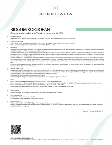 BIOGUM KORDOFAN Gomma arabica d'acacia Verek in soluzione al 30% COMPOSIZIONE Gomma arabica (E414) 30%, anidride solforosa (E220) 1%, acqua demineralizzata q.b. a 100%. CARATTERISTICHE Si presenta sotto forma di soluzione leggermente torbida di colore giallo paglierino - beige. Viene prodotta seguendo le specifiche FAO/WHO (JECFA) ed OIV. IMPIEGHI La gomma arabica Biogum Kordofan è un polisaccaride ad elevato peso molecolare, con spiccato potere stabilizzante nei confronti delle precipitazioni colloidali, utilizzato nell'industria dolciaria ed alimentare. Si ottiene da materie prime selezionate provenienti da Acacia verek, in grado di produrre un essudato avente potere rotatorio levogiro della luce polarizzata. Questa tipologia di gomma arabica contiene una particolare frazione proteica combinata ai polisaccaridi, che contribuisce ad incrementare la complessità e la morbidezza dei vini. Biogum Kordofan è utilizzata come colloide protettore per prevenire le precipitazioni colloidali dei vini, le alterazioni causate da "casse" ferrica e rameosa, svolge un’importante azione protettiva nei confronti delle sostanze coloranti, limitandone la precipitazione. Contribuisce inoltre alla stabilità tartarica di vini bianchi e rosati; l’utilizzo come coadiuvante per la stabilità tartarica deve essere preventivamente confermata dal test a freddo (metodo OIV). L'anidride solforosa contenuta in Biogum Kordofan contribuisce a prevenire le ossidazioni ed a mantenere sterile la soluzione (è quindi possibile l’utilizzo in linea dopo la microfiltrazione). MODALITÀ D'USO L'aggiunta di Biogum Kordofan deve avvenire preferibilmente sui vini limpidi, poco prima dell'imbottigliamento; aggiungere direttamente alla massa omogeneizzando, oppre utilizzare un’apposita apparecchiatura per il dosaggio in linea. Si consiglia di effettuare l’aggiunta dopo la filtrazione finale (microfiltrazione), al fine di evitare la colmatazione e l’intasamento dei filtri. Impiegare il prodotto solo su vini proteicamente stabili. Per l'impiego di Biogum Kordofan attenersi alle norme di legge vigenti in materia. DOSI Per la stabilizzazione della materia colorante su vini rossi: da 30 a 60 g/hl. Per la prevenzione delle precipitazioni tartariche su vini bianchi e rosati: da 30 a 60 g/hl. Verificare con appositi test in laboratorio. Per la stabilizzazione aromatica di tutte le tipologie di vino: da 50 a 200 g/hl. Attenzione: 100 g/hL di Biogum Kordofan apportano al vino 10 mg/L di anidride solforosa. CONFEZIONI Flaconi da 1 kg, taniche da 5, 10 e 25 kg e contenitori pallettizzati da 1.100 kg. CONSERVAZIONE Conservare in luogo fresco, asciutto. Richiudere accuratamente le confezioni aperte. PERICOLOSITÀ Questo prodotto deve essere immagazzinato, manipolato ed usato in accordo con idonee pratiche di igiene industriale ed in conformi tà alla legislazione vigente. Scheda Tecnica del 09/07/12 OENOITALIA BIOTECNOLOGIE s.r.l. Via dell’Industria, 51 - 25030 Erbusco (BS) - Tel. 030 7731224 - Fax 030 7704670 - E-mail [email protected] - www.oenoitalia.it - C.F. e P. IVA 03313480986