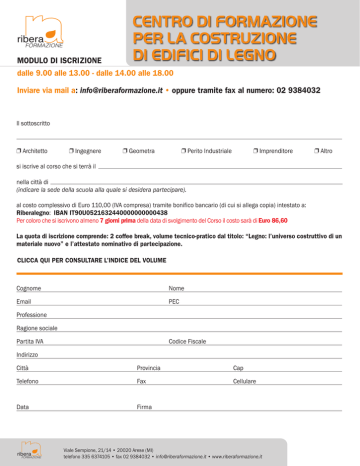 CENTRO DI FORMAZIONE PER LA COSTRUZIONE DI EDIFICI DI LEGNO ribera FORMAZIONE MODULO DI ISCRIZIONE dalle 9.00 alle 13.00 - dalle 14.00 alle 18.00 Inviare via mail a: [email protected] • oppure tramite fax al numero: 02 9384032 Il sottoscritto ❐ Architetto ❐ Ingegnere ❐ Geometra ❐ Perito Industriale ❐ Imprenditore ❐ Altro si iscrive al corso che si terrà il nella città di (indicare la sede della scuola alla quale si desidera partecipare). al costo complessivo di Euro 110,00 (IVA compresa) tramite bonifico bancario (di cui si allega copia) intestato a: Riberalegno: IBAN IT90U0521632440000000000438 Per coloro che si iscrivono almeno 7 giorni prima della data di svolgimento del Corso il costo sarà di Euro 86,60 La quota di iscrizione comprende: 2 coffee break, volume tecnico-pratico dal titolo: “Legno: l’universo costruttivo di un materiale nuovo” e l’attestato nominativo di partecipazione. CLICCA QUI PER CONSULTARE L’INDICE DEL VOLUME Cognome Nome Email PEC Professione Ragione sociale Partita IVA Codice Fiscale Indirizzo Città Provincia Cap Telefono Fax Cellulare Data Firma ribera FORMAZIONE Viale Sempione, 21/14 • 20020 Arese (MI) telefono 335 6374105 • fax 02 9384032 • [email protected] • www.riberaformazione.it