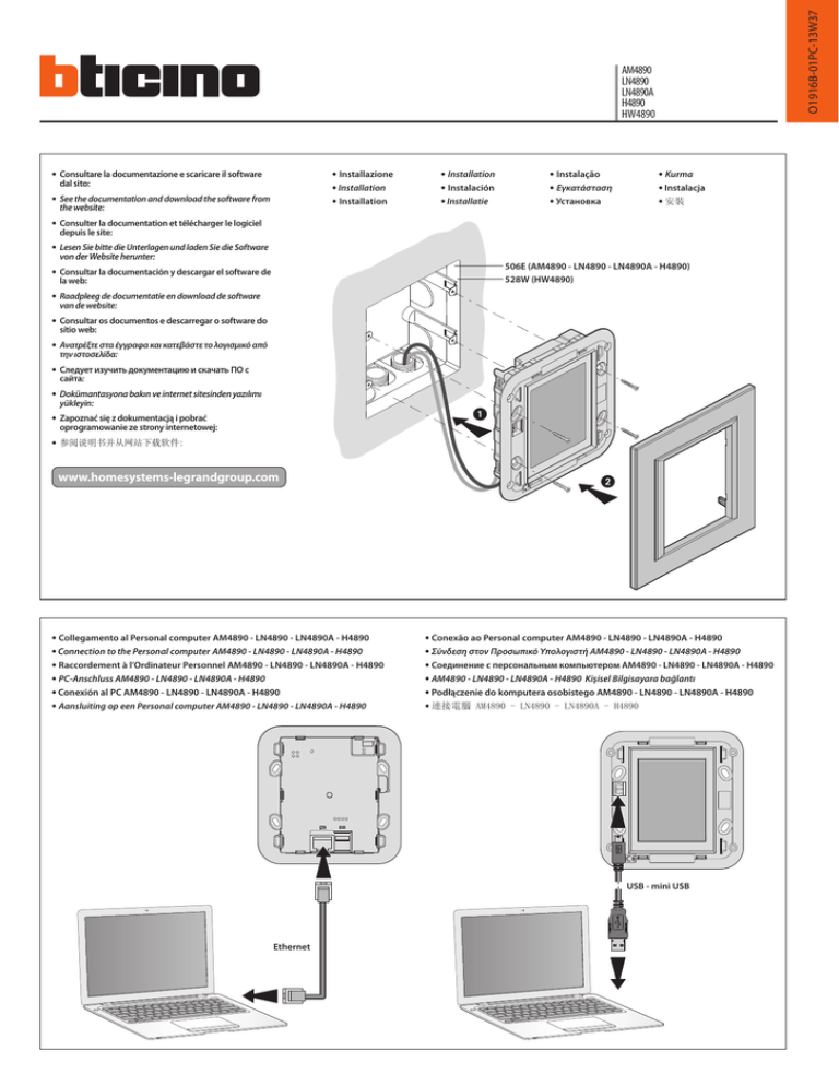 O1916B-01PC-13W37 AM4890 LN4890 LN4890A H4890 HW4890 • Consultare la documentazione e scaricare il software • Installazione • Installation • Installation dal sito: • See the documentation and download the software from the website: • Installation • Instalación • Installatie • Instalação • Εγκατάσταση • Установка • Kurma • Instalacja • 安裝 • Consulter la documentation et télécharger le logiciel depuis le site: • Lesen Sie bitte die Unterlagen und laden Sie die Software von der Website herunter: 506E (AM4890 - LN4890 - LN4890A - H4890) 528W (HW4890) • Consultar la documentación y descargar el software de la web: • Raadpleeg de documentatie en download de software van de website: • Consultar os documentos e descarregar o software do sítio web: • Aνατρέξτε στα έγγραφα και κατεβάστε το λογισμικό από την ιστοσελίδα: • Следует изучить документацию и скачать ПО с сайта: • Dokümantasyona bakın ve internet sitesinden yazılımı yükleyin: 1 • Zapoznać się z dokumentacją i pobrać oprogramowanie ze strony internetowej: • 参阅说明书并从网站下载软件: www.homesystems-legrandgroup.com • Collegamento al Personal computer AM4890 - LN4890 - LN4890A - H4890 • Connection to the Personal computer AM4890 - LN4890 - LN4890A - H4890 • Raccordement à l’Ordinateur Personnel AM4890 - LN4890 - LN4890A - H4890 • PC-Anschluss AM4890 - LN4890 - LN4890A - H4890 • Conexión al PC AM4890 - LN4890 - LN4890A - H4890 • Aansluiting op een Personal computer AM4890 - LN4890 - LN4890A - H4890 2 • Conexão ao Personal computer AM4890 - LN4890 - LN4890A - H4890 • Σύνδεση στον Προσωπικό Υπολογιστή AM4890 - LN4890 - LN4890A - H4890 • Соединение с персональным компьютером AM4890 - LN4890 - LN4890A - H4890 • AM4890 - LN4890 - LN4890A - H4890 Kişisel Bilgisayara bağlantı • Podłączenie do komputera osobistego AM4890 - LN4890 - LN4890A - H4890 • 連接電腦 AM4890 - LN4890 - LN4890A - H4890 USB - mini USB Ethernet • Collegamento al Personal computer HW4890 • Connection to the Personal computer HW4890 • Raccordement à l’Ordinateur Personnel HW4890 • PC-Anschluss HW4890 • Conexión al PC HW4890 • Aansluiting op een Personal computer HW4890 • Conexão ao Personal computer HW4890 • Σύνδεση στον Προσωπικό Υπολογιστή HW4890 • Соединение с персональным компьютером HW4890 • HW4890 Kişisel Bilgisayara bağlantı • Podłączenie do komputera osobistego HW4890 • 連接電腦 HW4890 2 1 USB - mini USB Dati tecnici • Alimentazione: da BUS • Assorbimento: 80 mA (max) • Temperatura di funzionamento: 0°C - 40°C Avvertenze • Rimuovere dal display la superficie protettiva prima dell’uso • Per pulire non utilizzare solventi, materiale abrasivi o corrosivi Τεχνικά στοιχεία • Τροφοδοσία από BUS • Απορρόφηση: 80 mA (μέγ.) • Θερμοκρασία λειτουργίας: 0°C - 40°C Προειδοποιήσεις • Αφαιρείτε την προστατευτική επιφάνεια από το display πριν τη χρήση • Για να καθαρίσετε μην χρησιμοποιείτε διαλυτικά, λειαντικά ή διαβρωτικά υλικά Technical data • Power supply: from BUS • Absorption: 80 mA (max.) • Operating temperature: 0°C - 40°C Warnings • Remove the protective surface from the display before use • Do not use solvents or abrasive or corrosive materials to clean Технические характеристики • Питание: от шины • Потребление: 80 мА (макс.) • Рабочая температура: 0°C - 40°C Предупреждения • Перед началом эксплуатации удалить с дисплея защитную поверхность • Не использовать для очистки растворители, абразивные или коррозионные материалы Caractéristiques techniques • Alimentation: sur BUS • Absorption: 80 mA (max.) • Température d’exercice: 0°C - 40°C Avertissements • Retirer de l’afficheur la pellicule protectrice avant l’utilisation • Pour nettoyer, n’utiliser ni solvants, ni produits abrasifs ou corrosifs Teknik Veriler • Besleme: BUS’dan • Emme: 80 mA (max) • Çalışma Sıcaklığı:0°C - 40°C Uyarılar • Kullanımdan önce koruyucu yüzeyi ekrandan çıkarınız • Temizlik için solvent, aşındırıcı veya korozif materyal kullanmayınız. Technische Daten • Speisung: über BUS • Stromabsorption: 80 mA (max.) • Betriebstemperatur: 0°C - 40°C Hinweis • Vor dem Gebrauch die Schutzfolie vom Display abziehen • Nicht mit Lösungsmitteln, Scheuermitteln oder ätzenden Flüssigkeiten reinigen Dane techniczne • Zasilanie: z magistrali • Pobór mocy: 80 mA (maks.) • Temperatura pracy: 0°C - 40°C Ostrzeżenia • Przed użyciem usunąć z wyświetlacza folię ochronną • Nie używać do czyszczenia rozpuszczalników, materiałów ściernych lub agresywnych. Datos técnicos • Alimentación: desde el BUS • Consumo: 80 mA (máx) • Temperatura de funcionamiento: 0°C - 40°C Advertencias • Extraiga de la pantalla la película protectora antes de utilizar. • Para limpiar la pantalla, no utilice disolventes, materiales abrasivos o corrosivos 技術資料 •電源:自匯流排 •吸收電流:80 mA (最大) •工作溫度:0°C - 40°C 注意 •在使用前去掉螢幕的保護膜 •清潔時不要使用溶劑、磨蝕或腐蝕材料 Technische eigenschappen • Voeding: door BUS • Stroomopname: 80 mA (max.) • Bedrijfstemperatuur: 0°C - 40°C Waarschuwingen • Voor het gebruik de