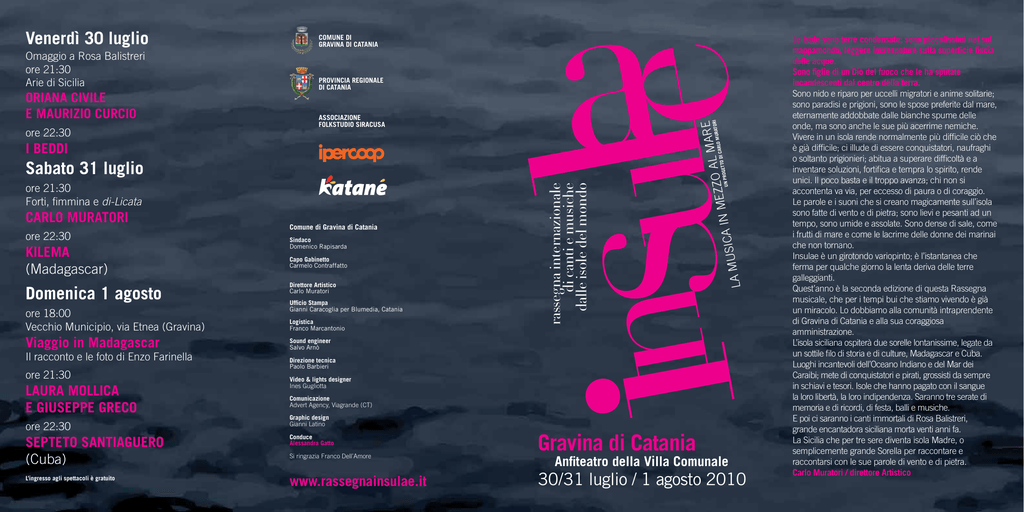 Venerdì 30 luglio COMUNE DI GRAVINA DI CATANIA Omaggio a Rosa Balistreri ore 21:30 Arie di Sicilia PROVINCIA REGIONALE DI CATANIA ORI MURAT ARE ARLO TO DI C I BEDDI ore 22:30 KILEMA (Madagascar) Domenica 1 agosto ore 18:00 Vecchio Municipio, via Etnea (Gravina) Viaggio in Madagascar Il racconto e le foto di Enzo Farinella ore 21:30 LAURA MOLLICA E GIUSEPPE GRECO ore 22:30 Comune di Gravina di Catania Sindaco Domenico Rapisarda Capo Gabinetto Carmelo Contraffatto Direttore Artistico Carlo Muratori Ufficio Stampa Gianni Caracoglia per Blumedia, Catania Logistica Franco Marcantonio ICA CARLO MURATORI S LA MU ore 21:30 Forti, fimmina e di-Licata rassegna internazionale di canti e musiche dalle isole del mondo GET Sabato 31 luglio UN PRO ore 22:30 ASSOCIAZIONE FOLKSTUDIO SIRACUSA M ZO AL IN MEZ ORIANA CIVILE E MAURIZIO CURCIO Sound engineer Salvo Arnò Direzione tecnica Paolo Barbieri Video & lights designer Ines Gugliotta Comunicazione Advert Agency, Viagrande (CT) Graphic design Gianni Latino SEPTETO SANTIAGUERO (Cuba) Conduce Alessandra Gatto L’ingresso agli spettacoli è gratuito www.rassegnainsulae.it Si ringrazia Franco Dell’Amore Gravina di Catania Anfiteatro della Villa Comunale 30/31 luglio / 1 agosto 2010 Le isole sono terre condensate; sono piccolissimi nei sul mappamondo, leggere increspature sulla superficie liscia delle acque. Sono figlie di un Dio del fuoco che le ha sputate incandescenti dal centro della terra. Sono nido e riparo per uccelli migratori e anime solitarie; sono paradisi e prigioni, sono le spose preferite dal mare, eternamente addobbate dalle bianche spume delle onde, ma sono anche le sue più acerrime nemiche. Vivere in un isola rende normalmente più difficile ciò che è già difficile; ci illude di essere conquistatori, naufraghi o soltanto prigionieri; abitua a superare difficoltà e a inventare soluzioni, fortifica e tempra lo spirito, rende unici. Il poco basta e il troppo avanza; chi non si accontenta va via, per eccesso di paura o di coraggio. Le parole e i suoni che si creano magicamente sull’isola sono fatte di vento e di pietra; sono lievi e pesanti ad un tempo, sono umide e assolate. Sono dense di sale, come i frutti di mare e come le lacrime delle donne dei marinai che non tornano. Insulae è un girotondo variopinto; è l’istantanea che ferma per qualche giorno la lenta deriva delle terre galleggianti. Quest’anno è la seconda edizione di questa Rassegna musicale, che per i tempi bui che stiamo vivendo è già un miracolo. Lo dobbiamo alla comunità intraprendente di Gravina di Catania e alla sua coraggiosa amministrazione. L’isola siciliana ospiterà due sorelle lontanissime, legate da un sottile filo di storia e di culture, Madagascar e Cuba. Luoghi incantevoli dell’Oceano Indiano e del Mar dei Caraibi; mete di conquistatori e pirati, grossisti da sempre in schiavi e tesori. Isole che hanno pagato con il sangue la loro libertà, la loro indipendenza. Saranno tre serate di memoria e di ricordi, di festa, balli e musiche. E poi ci saranno i canti immortali di Rosa Balistreri, grande encantadora siciliana morta venti anni fa. La Sicilia che per tre sere diventa isola Madre, o semplicemente grande Sorella per raccontare e raccontarsi con le sue parole di vento e di pietra. Carlo Muratori / direttore Artistico Per il secondo anno consecutivo Gravina promuove la rassegna internazionale per gli appassionati di musica insulare “INSULAE LA MUSICA IN MEZZO AL MARE”. Per chi vuole conoscere ciò che succede al di là del nostro mare, e sulle isole del mondo, e fare un raffronto con la nostra ISOLA, l’appuntamento è diventato un riferimento fisso per chi ama la musica popolare d’autore. La rassegna, oltre ad essere un evento musicale, è anche un modo per monitorare l’insularità nel mondo, la sua lingua parlata, la musica, dove i modi della gente sono sempre particolari rispetto a chi vive in un territorio continentale. Quest’anno INSULAE ospiterà rappresentanti provenienti da isole a noi geograficamente lontane, Cuba e Madagascar, ma molto vicini a noi per il file-rouge che ci collega con quelle meravigliose terre. Ascolteremo le sonorità di queste lontane isole e siamo certi che saranno protagoniste assieme a quelle che la Sicilia ci farà ascoltare con i suoi rappresentanti. Un ideale viaggio che ci aiuterà a capire meglio la nostra Sicilia, crocevia di cultura, e che servirà a creare le premesse per la realizzazione di una rete di interscambi culturali con le realtà delle isole ospitate. Domenico Rapisarda / Sindaco di Gravina di Catania OMAGGIO A ROSA BALISTRERI Io ho incontrato Rosa Balistreri a Firenze, circa 22 anni fa, in casa di un pittore mio amico. Quella sera Rosa cantò il lamento della morte di Turiddu Carnivali che è un mio poemetto. Io quella sera non la dimenticherò mai. La voce di Rosa, il suo canto strozzato, drammatico, angosciato, pareva che venissero dalla terra arsa della Sicilia. Ho avuto l’impressione di averla conosciuta sempre, di averla vista nascere e sentita per tutta la vita: bambina, scalza, povera, donna, madre, perchè Rosa Balistreri è un personaggio favoloso, direi un dramma, un romanzo, un film senza volto. Rosa Balistreri è un personaggio che cammina sopra un filo che ha un cuore per tutti, che ama tutti; un cuore giovane per la Sicilia di Vittorini e di Quasimodo, un cuore giovane per la Sicilia di Guttuso e di Leonardo Sciascia. (Ignazio Buttitta) ORIANA CIVILE MAURIZIO CURCIO Non è solo un concerto. Gli arrangiamenti vengono realizzati in modo minimale, senza alcuna volontà di contaminazione di genere, per dare alle melodie il giusto risalto artistico-culturale. Sul palco, gli strumenti utilizzati, oltre al pianoforte, sono un Chapman Stick a 10 corde, una chitarra acustica, un set di percussioni e un laptop. Un percorso sonoro attraverso melodie raccolte sul campo dai molteplici ricercatoriche, nei secoli passati e ancora oggi, operano nel settore dell’etnomusicologia e la 