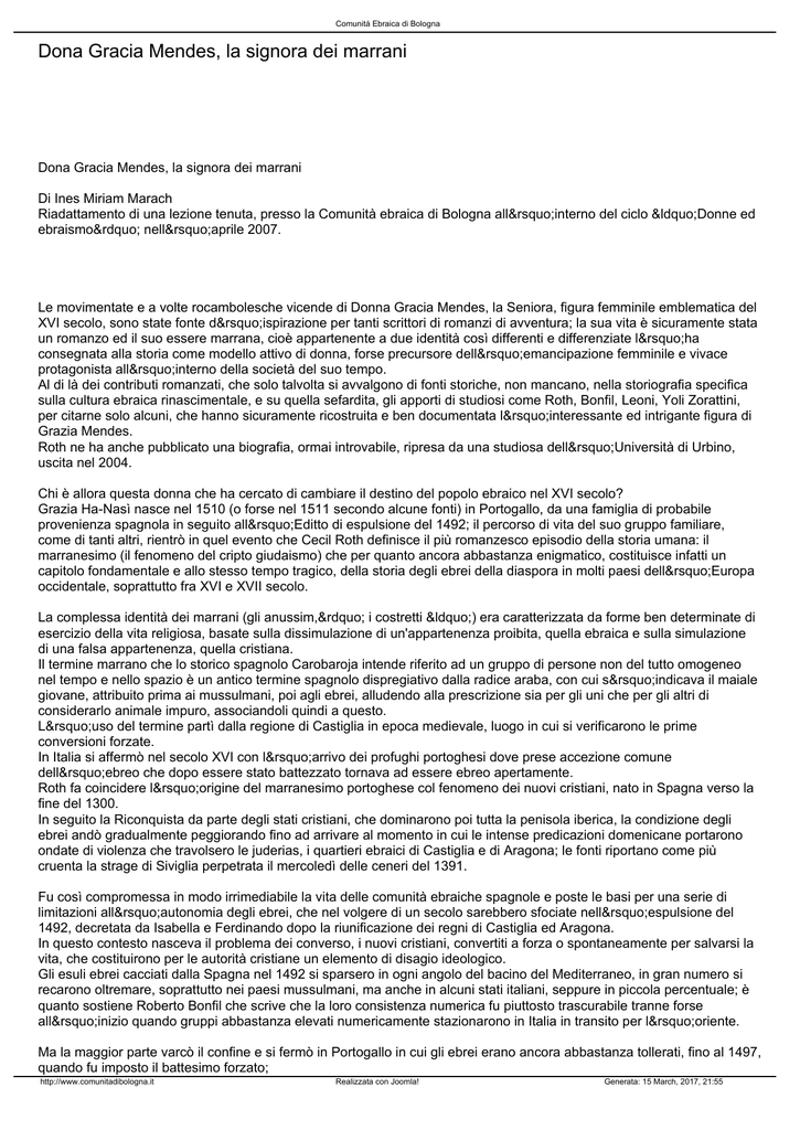 Comunità Ebraica di Bologna Dona Gracia Mendes, la signora dei marrani Dona Gracia Mendes, la signora dei marrani Di Ines Miriam Marach Riadattamento di una lezione tenuta, presso la Comunità ebraica di Bologna all’interno del ciclo “Donne ed ebraismo” nell’aprile 2007. Le movimentate e a volte rocambolesche vicende di Donna Gracia Mendes, la Seniora, figura femminile emblematica del XVI secolo, sono state fonte d’ispirazione per tanti scrittori di romanzi di avventura; la sua vita è sicuramente stata un romanzo ed il suo essere marrana, cioè appartenente a due identità così differenti e differenziate l’ha consegnata alla storia come modello attivo di donna, forse precursore dell’emancipazione femminile e vivace protagonista all’interno della società del suo tempo. Al di là dei contributi romanzati, che solo talvolta si avvalgono di fonti storiche, non mancano, nella storiografia specifica sulla cultura ebraica rinascimentale, e su quella sefardita, gli apporti di studiosi come Roth, Bonfil, Leoni, Yoli Zorattini, per citarne solo alcuni, che hanno sicuramente ricostruita e ben documentata l’interessante ed intrigante figura di Grazia Mendes. Roth ne ha anche pubblicato una biografia, ormai introvabile, ripresa da una studiosa dell’Università di Urbino, uscita nel 2004. Chi è allora questa donna che ha cercato di cambiare il destino del popolo ebraico nel XVI secolo? Grazia Ha-Nasì nasce nel 1510 (o forse nel 1511 secondo alcune fonti) in Portogallo, da una famiglia di probabile provenienza spagnola in seguito all’Editto di espulsione del 1492; il percorso di vita del suo gruppo familiare, come di tanti altri, rientrò in quel evento che Cecil Roth definisce il più romanzesco episodio della storia umana: il marranesimo (il fenomeno del cripto giudaismo) che per quanto ancora abbastanza enigmatico, costituisce infatti un capitolo fondamentale e allo stesso tempo tragico, della storia degli ebrei della diaspora in molti paesi dell’Europa occidentale, soprattutto fra XVI e XVII secolo. La complessa identità dei marrani (gli anussim,” i costretti “) era caratterizzata da forme ben determinate di esercizio della vita religiosa, basate sulla dissimulazione di un'appartenenza proibita, quella ebraica e sulla simulazione di una falsa appartenenza, quella cristiana. Il termine marrano che lo storico spagnolo Carobaroja intende riferito ad un gruppo di persone non del tutto omogeneo nel tempo e nello spazio è un antico termine spagnolo dispregiativo dalla radice araba, con cui s’indicava il maiale giovane, attribuito prima ai mussulmani, poi agli ebrei, alludendo alla prescrizione sia per gli uni che per gli altri di considerarlo animale impuro, associandoli quindi a questo. L’uso del termine partì dalla regione di Castiglia in epoca medievale, luogo in cui si verificarono le prime conversioni forzate. In Italia si affermò nel secolo XVI con l’arrivo dei profughi portoghesi dove prese accezione comune dell’ebreo che dopo essere stato battezzato tornava ad essere ebreo apertamente. Roth fa coincidere l’origine del marranesimo portoghese col fenomeno dei nuovi cristiani, nato in Spagna verso la fine del 1300. In seguito la Riconquista da parte degli stati cristiani, che dominarono poi tutta la penisola iberica, la condizione degli ebrei andò gradualmente peggiorando fino ad arrivare al momento in cui le intense predicazioni domenicane portarono ondate di violenza che travolsero le juderias, i quartieri ebraici di Castiglia e di Aragona; le fonti riportano come più cruenta la strage di Siviglia perpetrata il mercoledì delle ceneri del 1391. Fu così compromessa in modo irrimediabile la vita delle comunità ebraiche spagnole e poste le basi per una serie di limitazioni all’autonomia degli ebrei, che nel volgere di un secolo sarebbero sfociate nell’espulsione del 1492, decretata da Isabella e Ferdinando dopo la riunificazione dei regni di Castiglia ed Aragona. In questo contesto nasceva il problema dei converso, i nuovi cristiani, convertiti a forza o spontaneamente per salvarsi la vita, che costituirono per le autorità cristiane un elemento di disagio ideologico. Gli esuli ebrei cacciati dalla Spagna nel 1492 si sparsero in ogni angolo del bacino del Mediterraneo, in gran numero si recarono oltremare, soprattutto nei paesi mussulmani, ma anche in alcuni stati italiani, seppure in piccola percentuale; è quanto sostiene Roberto Bonfil che scrive che la loro consistenza numerica fu piuttosto trascurabile tranne forse all’inizio quando gruppi abbastanza elevati numericamente stazionarono in Italia in transito per l’oriente. Ma la maggior parte varcò il confine e si fermò in Portogallo in cui gli ebrei erano ancora abbastanza tollerati, fino al 1497, quando fu imposto il battesimo forzato; http://www.comunitadibologna.it Realizzata con Joomla! Generata: 15 March, 2017, 21:55 Comunità Ebraica di Bologna pena pagata per non adempiere a tale ordine era l’espulsione. Se per alcuni storici (Roth per primo) il termine marrano è sinonimo di converso secondo altri, il vero fenomeno del marranesimo, inteso proprio come cripto giudaismo, dilagò in Portogallo quando quasi tutti, per salvare anche le proprie attività, presero il battesimo continuando però segretamente, nel proprio interno, ad essere ebrei. Con l’introduzione nel 1536 dell’Inquisizione anche in Portogallo ed il conseguente rischio di essere scoperti e processati, la maggior parte dei marrani partirono alla volta dei Paesi Bassi (Amsterdam e Anversa furono i centri più importanti) e dell’Italia. Roma, ed Ancona (nello Stato pontificio), Venezia, Ferrara e più tardi Livorno, furono i luoghi in cui maggiormente si concentrarono le comunità marrane. Anche alla famiglia di Gracia, gli ha Nasì (i principi), come a tutti gli ebrei rifugiati in Portogallo, toccò la sorte del battesimo forzato imposto il 4 marzo 1497; Gracia nacque quindi col nome cristiano di Beatriz de Luna