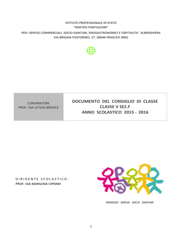 ISTITUTO PROFESSIONALE DI STATO “MAFFEO PANTALEONI” PER I SERVIZI COMMERCIALI, SOCIO-SANITARI, ENOGASTRONOMICI E OSPITALITA’ ALBERGHIERA VIA BRIGIDA POSTORINO, 27- 00044 FRASCATI (RM) CORDINATORE PROF. SSA LETIZIA BREDICE DOCUMENTO DEL CONSIGLIO DI CLASSE CLASSE V SEZ.F ANNO SCOLASTICO 2015 - 2016 DIRIGENTE SCOLASTICO: PROF. SSA MARILENA CIPRANI INDIRIZZO SERVIZI SOCIO SANITARI 1 Istituto Professionale di Stato “Maffeo Pantaleoni” Dirigente scolastico: Prof.ssa Marilena Ciprani DOCUMENTO DEL CONSIGLIO DI CLASSE Anno scolastico 2015/2016 Classe 5a sez. F Indirizzo : Coordinatrice : Prof.ssa Letizia Bredice Operatore servizi socio sanitari Composizione del Consiglio di classe: Docente MATERIA insegnata Religione Aniceto Adriana Italiano Bredice Letizia Storia Bredice Letizia Lingua straniera - Inglese Terregino Teresa Lingua straniera - Francese Ermellino Antonella Psicologia gen.le e applicata Vittori Marina Cultura medica Baggetta Alessandro Matematica Scarpati Mario Diritto Di Salvatore Maria Pia Tecnica amministrativa ed Economia sociale Romani Giancarlo Scienze motorie e sportive Basili Fausto Sostegno Tiberi Domenico Del Monte Catia Ferrara Luigi 2 Il Consiglio di classe ha designato i commissari interni titolari di materie diverse da quelle affidate ai membri esterni. Segue l’elenco dei docenti individuati come commissari interni: DOCENTE COMMISSARIO INTERNO - MATERIA Prof. Baggetta Alessandro (Cultura medica) Prof. Basili Fausto ( Scienze motorie e sportive ) Prof. Scarpati Mario ( Matematica) INDICE: 1. 2. 3. 4. 5. 6. 7. 8. 9. 10. 11. 12. 13. 14. 15. 16. PRESENTAZIONE DELL’ISTITUTO ARTICOLAZIONE DELL’OFFERTA FORMATIVA PROFILO PROFESSIONALE DEL DIPLOMATO DEI SERVIZI SOCIO--‐SANITARI PRESENTAZIONE DELLA CLASSE ELENCO DEGLI ALUNNI LIVELLI DI PARTENZA DELLA CLASSE PROFILO SINTETICO DELLA CLASSE ATTUALE PROGRAMMAZIONE GENERALE DEL CONSIGLIO DI CLASSE OBIETTIVI OBIETTIVI DIDATTICI DISCIPLINARI COMPETENZE -‐‐ OBIETTIVI TRASVERSALI METODOLOGIA E TECNICHE D’INSEGNAMENTO – STRUMENTI VERIFICA E VALUTAZIONE CRITERI DI ATTRIBUZIONE DEI CREDITI SCOLASTICI E VALUTAZIONE DEI CREDITI FORMATIVI ATTIVITA’ DI RECUPERO, INTEGRAZIONE E SOSTEGNO, DI APPROFONDIMENTO ATTIVITA’ DI SCUOLA – LAVORO, STAGE, ATTIVITA’ CURRICULARI ED EXTRACURRICULARI, VISITE D’ISTRUZIONE 17. ATTIVITA’ DI ALTERNANZA SCUOLA – LAVORO 18. SIMULAZIONI DELLE PROVE SCRITTE DEGLI ESAMI DI STATO -‐‐ -‐‐ -‐‐ -‐‐ -‐‐ -‐‐ -‐‐ -‐‐ ALLEGATI Relazioni e programmi delle singole discipline Programmazione didattico – educativa individualizzata (P.E.I.) alunne Testi delle prove di simulazione svolte Testi di simulazione 1a prova Testi di simulazione 2a prova Testi di simulazione 3a prova Griglie di valutazione relative alla 1a, 2a,3a prova scritta 3 4 6 7 8 8 9 9 10 10 10 10 11 12 14 14 14 15 25 1. PRESENTAZIONE DELL’ISTITUTO Presente nella realtà di Frascati da oltre quaranta anni, il ”Maffeo Pantaleoni” ha da tempo assunto un ruolo importante, costituendosi come qualificato polo di riferimento per la formazione secondaria superiore sia per l’utenza cittadina, sia per quella dei Comuni limitrofi. L’istituto ha sede nella storica “Villa Innocenti” che nel 1970, presa in affitto dal Comune di Frascati, divenne Scuola Professionale. La denominazione della scuola fu dovuta alla volontà del Preside Ippolito di onorare il concittadino Maffeo Pantaleoni, economista di fama mondiale. Più tardi, l’Amministrazione comunale acquistò la villa dandole l’attuale sistemazione. L’Istituto professionale nasce come istituto per il commercio e inizialmente funzionava solo con corsi biennali: stenografia e computisteria. Successivamente al 1962, quando la scuola di avviamento professionale si fonde con la neo scuola media inferiore, nel Professionale vengono attivati corsi triennali per il conseguimento delle qualifiche di : addetti agli uffici turistici; addetti alla contabilità d’azienda; addetti alla segreteria d’azienda; assistenza all’infanzia; accompagnatori turistici. I nuovi corsi sostituiscono i precedenti e la scuola cambia denominazione, viene infatti denominata Istituto Professionale di Stato per i servizi Commerciali, turistici, della pubblicità e sociali. Viene inserito anche il nuovo corso di grafica pubblicitaria. Successivamente, il progetto scolastico è rinnovato con la delibera del progetto 2002, un proseguo del progetto ’98 con rivisitazione di alcuni contenuti. In questa nuova struttura progettuale alcune discipline, nel primo biennio, con la riduzione oraria lasciano maggiore spazio a quelle di tipo professionalizzanti. Anche la riduzione settimanale delle ore di lezioni concorrono al rinnovo didattico. L’anno scolastico 2010/2011 vede un nuovo cambiamento, quello della Riforma Gelmini con la quale si introduce il nuovo ordinamento dal primo anno, che proprio nell’attuale anno scolastico è andato a regime. Pertanto gli indirizzi presenti nel nostro istituto sono: Servizi socio--‐sanitari; Servizi commerciali; servizi commerciali con opzione “promozione commerciale e pubblicitaria”; Servizi per l’enogastronomia e ospitalità alberghiera. La riforma ha puntato all’integrazione con il territorio e il mondo produttivo; infatti il riordino degli istituti professionali risponde all’esigenza di organizzare percorsi formativi quinquennali, finalizzati al conseguimento di un titolo di studio, fondati su una solida base di istruzione generale e tecnico-‐ professionale riferita a filiere produttive di rilevanza nazionale e locale. Pur concordi sulle finalità della riforma non si può, però, prescindere da ciò che essa ha comportato come conseguenza al nostro istituto stravolgendo quella che era la sua identità. Gli indirizzi che qualificavano il “Maffeo Pantaleoni” tranne quello socio‐ sanitario, sono venuti meno, anche se grazie agli spazi di flessibilità e le quote di autonomia l’istituto ha cercato di mantenere l