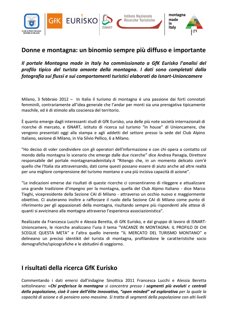 Donne e montagna: un binomio sempre più diffuso e importante Il portale Montagna made in Italy ha commissionato a GfK Eurisko l’analisi del profilo tipico del turista amante della montagna. I dati sono completati dalla fotografia sui flussi e sui comportamenti turistici elaborati da Isnart-Unioncamere Milano, 3 febbraio 2012 – In Italia il turismo di montagna è una passione dai forti connotati femminili, contrariamente all’idea generale che l’andar per monti sia una prerogativa tipicamente maschile, ed è di stimolo alla coscienza del territorio. È quanto emerge dagli interessanti studi di GfK Eurisko, una delle più note società internazionali di ricerche di mercato, e ISNART, istituto di ricerca sul turismo “in house” di Unioncamere, che vengono presentati oggi alla stampa e agli addetti del settore presso la sede del Club Alpino Italiano, sezione di Milano, in Via Silvio Pellico, 6 a Milano. "Ho deciso di voler condividere con gli operatori dell'informazione e con chi opera a contatto col mondo della montagna lo scenario che emerge dalle due ricerche” dice Andrea Panagia, Direttore responsabile del portale montagnamadeinitaly.it “Ritengo che, in un momento delicato com'è quello che l'Italia sta attraversando, dati come questi possano essere di aiuto anche ad altre realtà per una migliore comprensione del turismo montano e una più incisiva capacità di azione”. “Le indicazioni emerse dai risultati di queste ricerche ci consentiranno di rileggere e attualizzare una grande tradizione d’impegno per la montagna, quella del Club Alpino Italiano - dice Marco Tieghi, vicepresidente della Sezione CAI di Milano - attraverso un occhio nuovo e maggiormente obiettivo. Ci aiuteranno inoltre a rafforzare il ruolo della Sezione CAI di Milano come punto di riferimento per gli appassionati della montagna, risultando sempre più rispondenti alle attese di quanti si avvicinano alla montagna attraverso l’esperienza associazionistica”. Realizzate da Francesca Lucchi e Alessia Beretta, di GfK Eurisko, e dal gruppo di lavoro di ISNARTUnioncamere, le ricerche analizzano l’una il tema “VACANZE IN MONTAGNA: IL PROFILO DI CHI SCEGLIE QUESTA META” e l’altra quello inerente ”IL MERCATO DEL TURISMO MONTANO” e delineano un preciso identikit del turista di montagna, profilandone le caratteristiche socio demografiche/spicografiche e le abitudini di soggiorno. I risultati della ricerca GfK Eurisko Commentando i dati emersi dall’indagine Sinottica 2011 Francesca Lucchi e Alessia Beretta sottolineano: «Chi preferisce la montagna si concentra presso i segmenti più evoluti e centrali della popolazione, cioè il core dell’élite innovativa, “open minded” ed esplorativa per la quale la capacità di azione e di pensiero sono massime. Si tratta di segmenti della popolazione con alti livelli di realizzazione, progettualità, consapevolezza di sé e del contesto sociale. A dispetto di quanto generalmente si pensi, la componente femminile è ben rappresentata e contribuisce a rendere “più morbido” e diversificato l’approccio alla vacanza in montagna, non più solo prerogativa di un universo maschile, sportivo e tecnico. Oggi, infatti, la vacanza in montagna risponde ad evolute ed eterogenee esigenze di: evasione da una quotidianità frenetica e ricca di impegni (lavoro, famiglia…); contenuti, quindi non solo come svago, ma anche come cultura, tradizioni locali, storia; piacere della buona tavola, del paesaggio, del contatto con la natura; gratificazione, derivante dall’avere un momento tutto per sé, e ovviamente relax, comfort e attività fisica». Analizzando i dati dell’indagine Sinottica 2011, emerge infatti come la componente femminile rappresenti quasi la metà (47%) di coloro che scelgono la montagna per le proprie vacanze, sfatando un luogo comune che vede principalmente nel soggetto maschile il principale fruitore della montagna, e sia portatrice di interessi e bisogni differenti da quelli maschili. Altra informazione interessante è quella che evidenzia come i turisti che optano per la montagna siano prevalentemente persone di età intermedia: la fascia anagrafica che va dai 35 ai 54 anni rappresenta infatti ben il 39% del campione (14-34 anni, il 28% e >54 anni il 33%). Le risorse socio-economiche e culturali del turista-tipo sono tendenzialmente elevate (laurea 18% e reddito alto 17%, in entrambi i casi circa il doppio della media nazionale). Si tratta per lo più di impiegati/insegnanti, studenti fra i più giovani, ma anche di dirigenti, liberi professionisti e lavoratori autonomi. Si tratta di individui di successo, sicuri di sé che non si scoraggiano davanti alle difficoltà e, anzi, amano l’imprevisto e le sfide della vita. Sportivi, dinamici e dalla mente aperta, dalla vita non desiderano tranquillità, ma progettualità e impegno sia professionale, sia culturale. Se per la maggior parte dei turisti generici il concetto di vacanza significa soprattutto relax e comfort, per quelli che scelgono la montagna sembra emergere una certa inclinazione per la natura: l’81% dichiara infatti di amare la natura e i luoghi incontaminati, mentre il 75% visita con piacere parchi e siti naturalistici. Inoltre questo genere di turista sembra avere scarso interesse per i villaggi turistici. Si tratta di individui culturalmente attivi anche nella quotidianità (non solo “in vacanza”), con alti livelli di partecipazione ad attività quali teatro, conferenze, visite a musei, monumenti, siti archeologici e librerie, molto più elevati rispetto al totale dei «vacanzieri» e circa il doppio della media della popolazione. Fra le attività di svago e relax preferite spiccano le sagre/manifestazioni tradizionali o locali, le fiere enogastronomiche, ma anche gli eventi sportivi dal vivo e le passeggiate/escursioni nei parchi (locali, nazionali, acquatici..). Senza dimenticare l’attività fisica (le più diffuse sono la corsa leggera/jogging e la palestra - entra