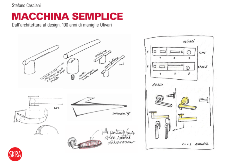 Simple machine Macchina semplice SIMPLE MACHINE From Architecture to Design 100 Years of Olivari Handles Stefano Casciani MACCHINA SEMPLICE Dall’architettura al design 100 anni di maniglie Olivari In copertina / Cover In senso orario / Clockwise, schizzi autografi per maniglie Olivari / autograph sketches for Olivari door handles: Enzo Mari, Stilo, 2003; Alessandro Mendini, Space-Time, 2003; Daniel Libeskind, Denver, 2009; Vico Magistretti, Club, 1999; Rodolfo Dordoni, Arc, 2010 Art director Marcello Francone Progetto grafico / Graphic design Luigi Fiore Coordinamento redazionale Editorial Coordination Giulia Valcamonica Redazione / Editing Anna Albano Impaginazione / Layout Flavio e / and Paola Ranzini Traduzioni / Translations Robert Burns, Christopher Evans, Marco Migotto, Leslie Ray per /for Language Consulting Congressi, Milano First published in Italy in 2010 by Skira editore S.p.A. Palazzo Casati Stampa via Torino 61 20123 Milano Italy www.skira.net Nessuna parte di questo libro può essere riprodotta o trasmessa in qualsiasi forma o con qualsiasi mezzo elettronico, meccanico o altro senza l’autorizzazione scritta dei proprietari dei diritti e dell’editore. © 2010 Olivari B. S.p.A. © 2010 Stefano Casciani per i testi / for the texts © 2010 Skira editore, Milano © FLC by SIAE 2010 © René Magritte, Victor Horta, Dominique Perrault by SIAE 2010 Tutti i diritti riservati All rights reserved under international copyright conventions. No part of this book may be reproduced or utilized in any form or by any means, electronic or mechanical, including photocopying, recording, or any information storage and retrieval system, without permission in writing from the publisher. Printed and bound in Italy. First edition ISBN: 978-88-572-0629-5 Distributed in North America by Rizzoli International Publications, Inc., 300 Park Avenue South, New York, NY 10010. Distributed elsewhere in the world by Thames and Hudson Ltd., 181A High Holborn, London WC1V 7QX, United Kingdom. Finito di stampare nel mese di agosto 2010 a cura di Skira, Ginevra-Milano Printed in Italy www.skira.net Nota ai crediti fotografici Note to photo credits Tutte le immagini / All the images Archivio Domus sono / are to be intended as copyright Editoriale Domus S.p.A., Rozzano (Milano) Italia Sommario / Contents 8 9 Objects of Desire Gli oggetti del desiderio 120 121 12 13 From Handcraft to Industry. Modern Architecture and the Precursors of Industrial Design Dall’artigianato all’industria. L’architettura moderna e i precursori del disegno industriale 190 191 30 31 54 55 88 89 Origins of Italian Design. Industrial Reconstruction and Rebirth Alle origini del design italiano. Ricostruzione e rinascita dell’industria The Boom Years. Italian Design Between Standard and Heresy Gli anni del boom. Il design italiano tra standard ed eresia The Quest for Freedom: from Modern to Post-Modern La ricerca della libertà: dal moderno al postmoderno Minimum, Global and Sustainable. For an Environmentally Balanced Design Minimo, globale e sostenibile. Per un progetto dell’equilibrio ambientale Parallel Industries. A Conversation between Alberto Alessi, Stefano Casciani, Antonio Olivari Industrie parallele. Una conversazione tra Alberto Alessi, Stefano Casciani e Antonio Olivari 204 205 Biographies Biografie 216 217 Chronology Cronologia 220 Bibliografia / Bibliography Why this second book of environmental sustainability, where we long ago A number of years ago, 1992 to be precise, we published a implemented a concrete production strategy aimed first volume dedicated to the history of our production, at maximising compatibility between production L’architettura presa per mano [Architecture taken by the and environment. hand], edited by Stefano Casciani. This was an occasion for Hence this new book is not intended to be a celebratory us to begin putting into order the wealth of documentation publication, but a project in itself that documents and on the work of the first and second Olivari generations with affirms the close and privileged relationship with the world major figures in modern and contemporary architecture of design, and tells the story of what is, for us, the essential since the birth of the family business in 1911. symbiosis between the quest for form and the development Now, as the company’s one hundredth anniversary of technology. Lastly, looking more deeply not only into the approaches, it is our intention to look back anew on our history and contemporary reality of the door handle, which history and review nearly twenty additional years of stands as the first level of physical and perceptual business with the third Olivari generation at the helm. This interaction between people and architecture, but also into volume thus recounts other quests, technological its symbolic meanings has seemed to us to be the best way innovations and collaborative efforts, new or firmly to offer once again to our professional counterparts — and established, with architects and designers from all over the to all those who are simply keen world who have been called upon on the culture of dwelling places — an original instrument to measure themselves against the design of a product, of knowledge: a critical visual document that goes beyond the door handle, which only appears to be simple. And we the specificities of our production to explore the fascinating have turned once again to Stefano Casciani to provide realms of expression that are an integral and fundamentally a fresh interpretation of the history of the interactions determining part of Olivari’s genetic makeup. between the processes of business, technology, research and design in light of the new issues and demands conditioning today’s industry, starting with that Antonio Olivari Perché questo secondo libro su cui abbiamo da tempo concretamente avviato una Diversi anni fa, per la precisione nel 1992, abbiamo strategia di produzione tesa alla massima compatibi