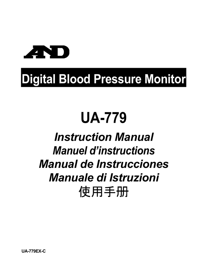Digital Blood Pressure Monitor UA-779 Instruction Manual Manuel d’instructions Manual de Instrucciones Manuale di Istruzioni UA-779EX-C 12:4007501? ENGLISH Preliminary remarks The device conforms to the following requirements: European Directive 93/42 EEC for Medical Products Act; Medical Products Act; European Standards for Electrical Medical Equipment EN 60601-1 (General Safety Provisions), EN 60601-1-2 and EN 55011 (Electromagnetic Compatibility). The above is evidenced by the CE mark of conformity accompanied by the reference number of a designated authority. This device is designed for adults only. Environment for use The device is for use in a hospital and / or patient's home. Precaution 1. Precision components were used in the construction of this device. Extremes in temperature, humidity, direct sunlight, shock or dust should be avoided. 2. Clean the device with a dry, soft cloth. Never use thinner, alcohol, benzene, or wet dusters. 3. Avoid tightly folding the cuff or storing the hose tightly twisted for long periods, as such treatment may shorten the life of the components. 4. The device, cuff and tubing are not water resistant. Prevent rain, sweat and water from wetting the device, cuff and tubing. ENGLISH 1 Parts Identification Air Connector Plug Systolic Display Measurement in Progress Diastolic Display Pulse Display Low Battery Display Start/Stop Switch Memory Switch Arm Cuff 1.5 V Batteries (R6P, LR6, or AA) Battery Cover ENGLISH 2 Symbols Symbols SN Type BF Measurement in Progress Low Battery Function / Meaning Turns on or off the device ___________ Direction guide to install battery ___________ Direct current ___________ Serial number ___________ Date of manufacture ___________ Device, cuff and tubing are designed to provide special protection against electric shocks. ___________ Appears when measurement is in progress and flashes when the pulse is detected. Measurement is in progress - remain as still as possible. Appears when the battery voltage is too low for the device to work properly. Replace all batteries with new ones. Appears if the pressure value is unstable due to movement during the measurement. Try the measurement again. Remain very still during the measurement. Appears if the cuff is not attached properly or the cuff is not connected to the device firmly. Pulse Display Error Treatment Appears if pulses are not detected correctly. ENGLISH 3 ? Attach the cuff properly and try the measurement again. ? Insert the air hose into the air socket firmly. Attach the cuff properly and try the measurement again. Previous measurement stored in MEMORY ENGLISH 4 ___________ Preparation for Measurements 1. Installing / Changing the Batteries Remove the battery cover and insert new batteries into the battery compartment as shown, taking care to observe the proper direction for each battery. Use R6P, LR6, AA, or similar type batteries. appears on the display panel, this means that the batteries are If the symbol depleted. Always change all batteries at the same time. If you do not intend to use the device for longer periods, remove the batteries. Only use high quality, leakproof batteries with the specified ratings. Never mix new and old batteries or batteries from different manufactures. Used batteries do not fall within the category of household waste, and must be disposed of according to the applicable regulations. 2. Connecting the Air Hose Insert the air connector plug into the air socket firmly. 3. Attaching the Arm Cuff Wrap the cuff around the upper arm about 2-3 cm above the elbow as shown. Place the cuff directly against the skin, as clothing may cause a faint heart beat, and result in an error. Constriction of the upper arm caused by rolling up a shirt sleeve may prevent accurate readings. Left arm Hose 2-3 cm 4. Posture While Measuring Remain seated in a comfortable position, placing the center of the upper arm at the same height as your heart. Excessive constriction 5. Measurement During the measurement, the cuff will become very tight. Do not be alarmed as this is normal. 6. After the Measurement After the measurement, remove the cuff and record your data. ENGLISH 5 Measurements 1. Place the cuff on the arm that will be used for the measurement (preferably the left arm). 2. Press the START/STOP switch. • When the START/STOP switch is pressed, all of the display symbols will appear for about one second. 3. • When the "0" is displayed, the device is calibrating its zero point. If there is still some air in the arm cuff, it will be exhausted at this time. • The micro pump will pressurize the cuff. Note: The cuff will become very tight. Do not be alarmed, as this is normal. • If the START/STOP switch is pressed again during pressurization or during the measurement, the pump will stop and the air will be released from the cuff. When pressurization has completed, the automatic exhaust mechanism will gradually reduce the pressure in the cuff and the Measurement in Progress symbol will appear along with the current pressure reading. This symbol will flash in unison with the pulse of the person being monitored. Measurement in Progress ENGLISH 6 Measurements • • • 4. Remain still while the device is in operation. When a measurement is made with insufficient pressure, the device will pump again to a higher pressure. If necessary, the starting pressure can be set manually. Press the START/STOP switch and hold it down until the display shows a pressure 30-40 mmHg above your normal systolic blood pressure, then release the switch. The device will start the measurement from that pressure. When measurement has completed, the systolic pressure, diastolic pressure readings, and the pulse rate are displayed. The air is automatically released from the cuff. Systolic Display Diastolic Display Pulse Display 5. Turning the Power OFF Press the START/STOP switch to turn the power off. 6. Subsequent Measurements If a subsequent measurement is required, turn off the power