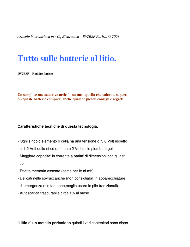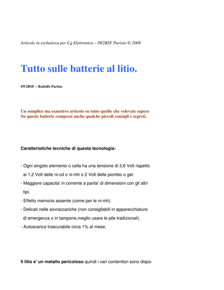Articolo in esclusiova per Cq Elettronica – IW2BSF Parisio © 2008 Tutto sulle batterie al litio. IW2BSF – Rodolfo Parisio Un semplice ma esaustivo articolo su tutto quello che volevate sapere Su queste batterie compresi anche qualche piccoli consigli e segreti. Caratteristiche tecniche di questa tecnologia: - Ogni singolo elemento o cella ha una tensione di 3,6 Volt rispetto ai 1,2 Volt delle ni-cd o ni-mh o 2 Volt delle piombo o gel. - Maggiore capacita' in corrente a parita' di dimensioni con gli altri tipi. - Effetto memoria assente (come per le ni-mh). - Delicati nelle sovraccariche (non consigliabili in apparecchiature di emergenza o in tampone,meglio usare le pile tradizionali). - Autoscarica trascurabile circa 1% al mese. Il litio e' un metallo pericoloso quindi i vari contenitori sono dispo- nibili solo in contenitori "sigillati". Anch'esso come i suoi stretti parenti reagisce con acqua formando idrogeno, che come credo tutti sappiano e' infiammabile! E quindi non e' possibile usare soluzioni chimiche in acqua per elettrolita del elemento. Risulta incredibile che in un elemento al litio si possa ottenere tensione tripla rispetto a un elemento singolo al ni-cd o ni-mh ma capacita' in corrente rispettivamente quasi doppia o quadrupla nel secondo caso. Incredibile pure in fatto che autoscarica sia di solo 1% al mese rispetto al 1% al giorno per una ni-cd! Classica batteria Litio-ION dei cellulari MANUTENZIONE E RICARICA OTTIMALE. Cosa importante e' dopo una ricarica NON mantenere una carica di man- tenimento,oltre a rappresentare un pericolo non sarebbe di alcuna utilita' visto come menzionato prima autoscarica di "solo" 1% al mese. Importante nella ricarica delle batterie al Litio-Ion o polimeri sarebbe sapere la composizione chimica delle stesse, e' infatti basilare se non fondamentale nella corretta ricarica e eventuale durata nel tempo (vedi cicli utili di vita). E' la piastra negativa che puo' presentare vari costituzioni chimiche, spesso e' costituita da litio metallico me scolato a carbonio, ma ultimante per stabilizzare meglio il funzionamento vengono usati ossidi di litio e cobalto o fosfato di litio o perganganato di litio o con pellicole su catodo ottenuto con vapori per attrazione elettrostatica o con materiale partendo dal plasma. la resistenza interna e' molto bassa, quindi si produce nella ricarica poco calore e il relativo processo di ricarica e' molto efficente dal punto di vista energetico. Come menzionato sopra soffrendo molto per la sovraccarica, specie nella ricarica di piu' elementi occore fare in modo che non vi siano differen ze anche minime di tensione per singolo elemento. Ideale quindi come av rete capito e' usare o costruire un caricatore per ogni singolo elemento! Ideale e molto economico e' il MAX712 della Maxim che ricarica per fettamente controllando sia in tensione che in corrente le stesse ed e' possibile pure selezionare (ove si sappia) il tipo di materiale utiliz zato nel catodo delle stesse, e il tutto con pochissimi componenti est erni, una manna per noi costruttori ma anche per i neofiti. Va' quindi ricordato che per avere sempre elementi in stato ottimale e con lunghe durate, che: - La tensione di fine carica si attesta sui 4,25 Volt (che varia a seconda come abbiamo visto della chimica delle stesse!). - La tensione di scarica sui 3,5 Volt massimo 2,75 Volt, anche in questo caso NON arrivate alla scarica totale cioe' a 0 Volt !!! Magari usate dei limitatori di sovratensione con PTC o fusibili elettronici tarati a 4,3 Volt, ricordando che superati i suddetti limiti potrebbero non solo guastarsi in modo irreversibile ma anche INCENDIARSI o peggio ESPLODERE ! . Per caricarle in sicurezza bisogna avere le istruzioni del costruttore,procurarsi cioe` i data sheets come se fossero circuiti circuiti integrati. Oggi tramite Internet e` spesso possibile ottenere letteratura tecnica senza troppa fatica, ma bisogna identificare il costruttore ed il modello. Per quanto riguarda i telefoni cellulari,la carica avviene in modo brutale ed a corrente non costante, ma il circuito del telefono, o meglio il microprocessore che controlla il te lefono, controlla durante la carica la tensione ai capi della batteria; in questo modo avverte tramite il display che la batteria e` scarica, e, durante la carica, impedisce il superamento della soglia di fine ca rica. Vediamo innanzitutto di sfatare alcuni luoghi comuni o leggende createsi su queste batterie utilizzate ormai ovunque dalle video o fotocamere, ai vari utensili tipo trapani o avvitatori fino ai nostri ormai omnipresenti telefoni cellulari ai nostri ricetrasmettitori portatili: - Ricarica la batteria per almeno 14 - 18 ore! - Al termine della ricarica stacca il caricabatteria dal caricatore o dal cellulare e poi ricollegalo per altre 14 ore! - Utilizza un caricabatteria lento anzichè quello originale in dotazione, più veloce! E cosi via....... Queste teorie sono obsolete e servono quando ci troviamo di fronte a batterie di bassa qualità.... in questi casi una "strapazzata" iniziale le da vigore ma presto evidenzierà i suoi limiti! Famosi sono gli spegnimenti con 2 tacche.... dei cellulari tanto per dirne una! La ricarica della batteria rappresenta uno dei momenti più importanti.... i progettisti prestano particolare attenzione a questa fase in quanto sono consapevoli che la corretta ottimizzazione di questa fase può conferire maggiore performance al apparecchiatura. Del resto sarebbe assurdo investire in tecnologie capaci di rendere apparato meno avido di corrente e poi non prestare attenzione alla ricerca del miglior modo di ricaricare la batteria e quindi al miglior modo di fruttarla. Per ottimizzare i cicli di ricarica è necessario far capire al apparato che tipo di batteria viene utilizzata, per questo motivo ogni batteria in commercio è equipaggiata, (al suo interno), di un chip identificativo (il classico 3 polo dei pacchi pile!). Quando colleghiamo caricabatteria al apparato l'elettronica di 