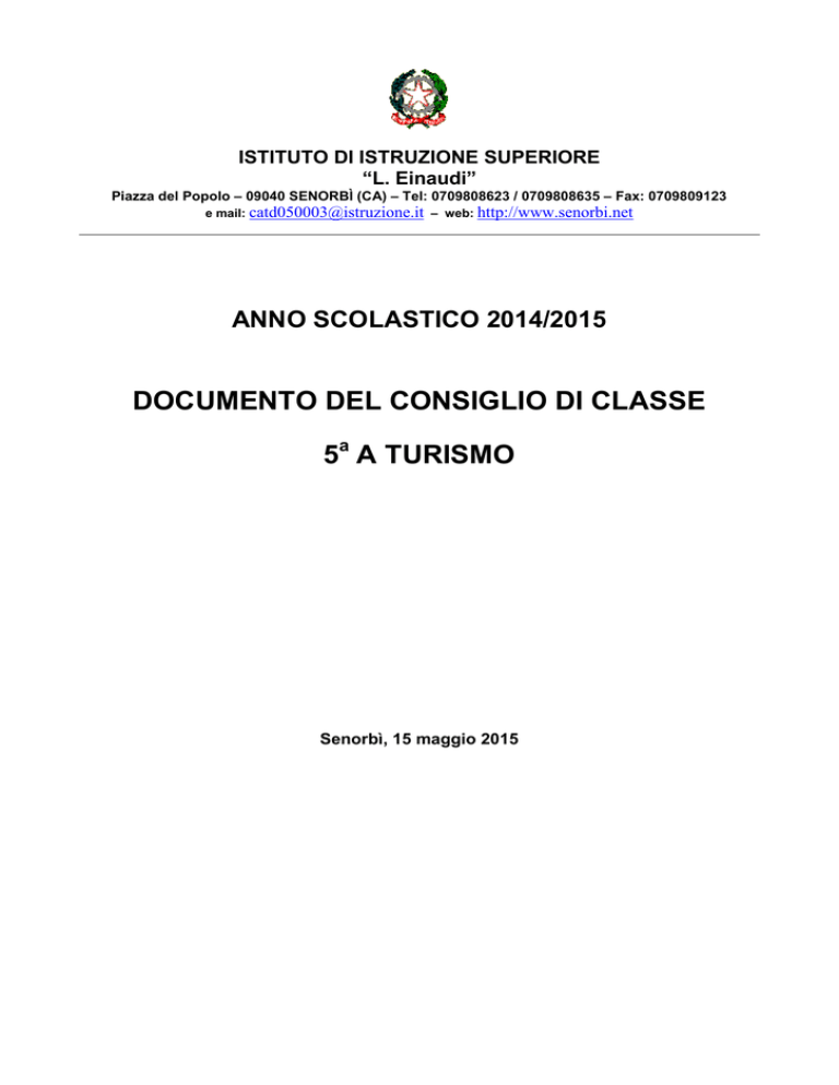 ISTITUTO DI ISTRUZIONE SUPERIORE “L. Einaudi” Piazza del Popolo – 09040 SENORBÌ (CA) – Tel: 0709808623 / 0709808635 – Fax: 0709809123 e mail: [email protected] – web: http://www.senorbi.net ANNO SCOLASTICO 2014/2015 DOCUMENTO DEL CONSIGLIO DI CLASSE 5a A TURISMO Senorbì, 15 maggio 2015 2 INDICE Composizione del Consiglio di Classe Elenco dei candidati all'Esame di Stato Contesto generale - Profilo della classe Tabella credito scolastico Obiettivi trasversali raggiunti Sussidi e spazi didattici Altri elementi significativi Contenuti disciplinari Attività integrative Calendario simulazioni Metodi di insegnamento Criteri e strumenti di misurazione e valutazione Lingua e Letteratura Italiana Storia Arte e territorio Lingua Inglese Seconda Lingua Comunitaria (Francese) Terza Lingua Comunitaria (Spagnolo) Terza Lingua Comunitaria (Tedesco) Diritto e Legislazione Turistica Discipline Turistiche e Aziendali Matematica Geografia Turistica Scienze Motorie e Sportive Insegnamento Religione Cattolica Griglie di Valutazione della prima prova Griglia di Valutazione della seconda prova Griglia di Valutazione della terza prova Tabella di conversione voti Firme dei docenti del Consiglio di Classe Allegato n° 1 simulazioni della I prova scritta Allegato n° 2 simulazioni della II prova scritta Allegato n° 3 simulazioni della III prova scritta Allegato n° 4 programmi dei singoli docenti . pag. 3 pag. 3 pag. 4 pag. 5 pag. 6 pag. 7 pag. 7 pag. 7 pag. 7 pag. 8 pag. 8 pag. 8 pag. 10 pag. 14 pag. 16 pag. 19 pag. 22 pag. 26 pag. 27 pag. 29 pag. 32 pag. 36 pag. 37 pag. 39 pag. 42 pag. 43 pag. 46 pag. 47 pag. 48 pag. 49 3 COMPOSIZIONE DEL CONSIGLIO DI CLASSE INSEGNANTI PROF.SSA ARTIZZU M. AUSILIA PROF.SSA SPIGA BRUNA M. C. PROF.SSA CARBONI BRUNA PROF. BULLEGAS GIUSEPPE PROF.SSA CONTU DANIELA PROF.SSA SULLIOTTI ALESSANDRA PROF.SSA MANIS PATRIZIA PROF. GAROFALO GIOVANNI PROF. ZARA RENZO PROF. MURGIA GIANFRANCO PROF. ANEDDA SALVATORE PROF. SERRA MAURIZIO DISCIPLINE ITALIANO E STORIA ARTE E TERRITORIO LINGUA INGLESE SECONDA LINGUA COMUNITARIA (FRANCESE) TERZA LINGUA COMUNITARIA (TEDESCO) TERZA LINGUA COMUNITARIA (SPAGNOLO) DIRITTO E LEGISLAZIONE TURISTICA DISCIPLINE TURISTICHE E AZIENDALI MATEMATICA GEOGRAFIA TURISTICA SCIENZE MOTORIE E SPORTIVE INSEGNAMENTO RELIGIONE CATTOLICA ELENCO DEI CANDIDATI ALL'ESAME DI STATO CODICE STUDENTE COGNOME 1 2 3 4 5 6 7 8 9 10 11 12 13 14 15 16 ANEDDA BALLOI BOI CAMBARAU CIRINA LECCA MAMELI MASCIA MASCIA MAXIA MURA PILI PORCEDDU PORCU SANNA ZARA NOME ANDREA BENIAMINO GIADA FEDERICO GIORGIA SIMONE SARA VERONICA YLENIA RITA GIORGIA MICHELA ROBERTA LUCA ROBERTA BEATRICE LAURA CAMILLA CLASSE DI PROVENIENZA 4A TURISMO 4 A TURISMO 4A TURISMO 4 A TURISMO 4 A TURISMO 4 A TURISMO 4 A TURISMO 4 A TURISMO 4 A TURISMO 4 A TURISMO 4A TURISMO 4 A TURISMO 4 A TURISMO 4 A TURISMO 4 A TURISMO 4 A TURISMO 4 IL CONTESTO GENERALE Il Consiglio di classe, in aderenza a quanto indicato nel Piano dell’offerta formativa d’Istituto, al fine di individuare obiettivi educativi e didattici adeguati ai reali bisogni degli utenti, ha preso in esame la realtà socio-culturale e ambientale dei Comuni da cui provengono gli studenti. PROFILO DELLA CLASSE La classe è composta da 16 allievi (di cui 12 ragazze e 4 ragazzi) provenienti da un ampio bacino di utenza e pendolari nella percentuale di oltre l’ 80% (13 alunni su 16). Per quanto riguarda la terza lingua comunitaria: 13 alunni studiano lo spagnolo, 3 il tedesco. Il nucleo della classe è formato da studenti della quarta A TURISMO. La classe è eterogenea, diversi studenti hanno dimostrato di possedere buone potenzialità, altri hanno evidenziato una preparazione di base non sempre sufficiente in tutte le discipline anche a causa di una scarsa applicazione e una modesta motivazione allo studio. Dall’ analisi generale, relativa all’anno scolastico, è emerso che la maggior parte degli alunni si è dimostrata demotivata e indifferente a qualunque sollecitazione da parte degli insegnanti; i docenti hanno, inoltre, constatato con rammarico la difficoltà di stabilire una forma di empatia con gli alunni, riconoscendo in loro un atteggiamento non sempre responsabile e adeguato ai doveri scolastici. Nello specifico, le dinamiche relazionali all’interno della classe, sono state caratterizzate da momenti di conflittualità e da punte polemiche che hanno in parte compromesso il raggiungimento degli obiettivi prefissati e/o programmati. I ragazzi hanno partecipato alle attività di alternanza scuola-lavoro svolte presso lo stesso istituto, il Museo Civico di Senorbì e gli scavi di Monte Luna. Hanno inoltre partecipato con interesse alle attività di orientamento tenutesi sia presso il nostro Istituto sia presso la Cittadella Universitaria di Cagliari. . Durante le varie simulazioni d’esame, in cui si è fatto ricorso a diverse tipologie e dove sono state ricreate le condizioni pressoché simili al giorno della prova effettiva (durata, ritiro cellulari, assenza ricreazione, uscite controllate) gli alunni hanno tenuto un comportamento adeguato e hanno calibrato le energie in base a ciò che è stato loro richiesto. Sotto l’aspetto didattico vanno individuate varie fasce: una comprende un ristretto gruppo di alunni che nel corso del quinquennio ha mostrato costanza e coerenza nell’applicazione con risultati discreti; un altro gruppo, sicuramente più numeroso, che non ha comunque ottenuto risultati positivi e si assesta intorno alla mediocrità; si indica, infine, un gruppo formato da studenti con valutazioni allo stato attuale insufficienti. Gli obiettivi indicati nella programmazione del C.d.C. sono stati raggiunti parzialmente poiché solo pochissimi alunni hanno raggiunto risultati più che sufficienti nonostante permangano alcune carenze metodologiche ed espressive. Per la metodologia, la valutazione e i contenuti delle diverse discipline si fa i riferimento alla sezione riservata ai singoli docenti. 5 TABELLA CREDITO SCOLASTICO LEGEND