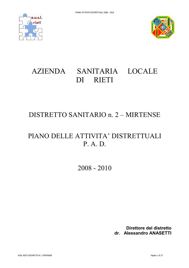 PIANO ATTIVITÀ DISTRETTUALI 2008 - 2010 AZIENDA SANITARIA DI RIETI LOCALE DISTRETTO SANITARIO n. 2 – MIRTENSE PIANO DELLE ATTIVITA’ DISTRETTUALI P. A. D. 2008 - 2010 Direttore del distretto dr. Alessandro ANASETTI AUSL RIETI DISTRETTO N. 2 MIRTENSE Pagina 1 di 27 PIANO ATTIVITÀ DISTRETTUALI 2008 - 2010 INDICE 1. PREMESSA: PAD Pag. 3 2. DISTRETTO SANITARIO N. 2 MIRTENSE Pag. 4 2.1 DEMOGRAFIA DEL TERRITORIO Pag. 4 2.2 VARIABILI DEMOGRAFICHE Pag. 5 2.3 ALCUNI INDICATORI SOCIO - SANITARI Pag. 9 3. Pag. 10 ORGANIZZAZIONE DEL DISTRETTO 3.1 PERSONALE DIPENDENTE Pag. 12 3.3 LE STRUTTURE OPERATIVE Pag. 13 4. Pag. 20 PROGRAMMAZIONE SOCIO-SANITARIA 2008-2010 4.1 PUNTO UNICO DI ACCESSO Pag. 21 4.2 UNITA’ DI VALUTAZIONE MULTIDIMENSIONALE Pag. 22 4.3 CONTINUITA’ ASSISTENZIALE Pag. 23 5. Pag. 25 PROGRAMMAZIONE ULTERIORE ATTIVITA’ DISTRETTUALE 5.1 POTENZIAMENTO ORGANICO DEI SERVIZI NOD Pag. 25 5.2 PRESIDIO TERRITORIALE PROSSIMITÀ Pag. 26 5.3 SISTEMA RESIDENZIALE EX ART. 26/833 Pag. 27 AUSL RIETI DISTRETTO N. 2 MIRTENSE Pagina 2 di 27 PIANO ATTIVITÀ DISTRETTUALI 2008 - 2010 1. PREMESSA P.A.D. AUSL RIETI DISTRETTO N. 2 MIRTENSE Il PAD (Programma Attività Distrettuali) è il documento di programmazione sanitaria triennale (2008 – 2010) del Distretto N. 2 e si affianca al Piano Sociale di Zona che, nello stesso territorio, definisce la pianificazione in ambito socio-sanitario ed assistenziale. Necessariamente i due strumenti devono essere tra di loro fortemente coerenti sulla base di progettualità condivise tra Aziende Sanitarie e Comuni. L’integrazione tra la programmazione e l’operatività nel sociale e nel sanitario partono nel Distretto di Poggio Mirteto da una comune cultura che vede nel cittadino il soggetto centrale per l’organizzazione dei servizi pubblici: un cittadino portatore di diritti da garantire, di potenzialità da valorizzare e, contemporaneamente, consapevole della propria responsabilità nei confronti della comunità in cui vive. Il progressivo incremento delle cosiddette “fasce deboli” (anziani, adolescenti con diverse forme di disagio, immigrati, disabili...) impone un continuo ripensamento e riqualificazione dei servizi erogati per mantenerli adeguati all’evolversi dei bisogni e compatibili con le risorse disponibili in un quadro di solidarietà e sussidiarietà che coinvolga tutta la comunità e i suoi protagonisti pubblici e privati. Il PAT 2000 - 2002 ha consentito già una prima positiva valutazione per l’impianto generale delle attività del Distretto di Poggio Mirteto in cui si sono evidenziati i passaggi fondamentali per la identificazione: • Delle strutture; • Delle sedi di attività; • Delle risorse umane e tecnologiche; • Delle criticità riscontrate; • Delle azioni da intraprendere; • Delle responsabilità, • Dei tempi per realizzare quanto predisposto. I cittadini, le Associazioni, il volontariato e gli operatori del settore potranno così avere strumenti di verifica e indicazioni per il prossimo futuro sulle quali fornire osservazioni, suggerimenti e proposte per il miglioramento continuo dei servizi. Pagina 3 di 27 PIANO ATTIVITÀ DISTRETTUALI 2008 - 2010 2. DISTRETTO SANITARIO MIRTENSE IL DISTRETTO 2. 1 Demografia del territorio: caratteristiche della popolazione AUSL RIETI DISTRETTO N. 2 MIRTENSE Il Distretto N. 2 Mirtense comprende 20 Comuni con una popolazione residente alla data del 31 dicembre 2007 di 32.842 abitanti, con una superficie di 414,4 Km2 ed una densità abitativa di 79,25 abitanti per km2. Il compito principale del Distretto è di assicurare alla popolazione residente la disponibilità dei servizi sanitari e socio sanitari integrati Comuni del Distretto N. 2 Mirtense Popolazione • • • • • • • • • • • • • • • • • • • • 1714 1155 1594 705 538 2942 3880 551 389 946 4098 1340 5800 608 555 1088 2007 1390 1278 264 Cantalupo in Sabina: Casperia Collevecchio Configni Cottanello Forano Magliano in Sabina Mompeo Montasola Montebuono Montopoli in Sabina Poggio Catino Poggio Mirteto: Comune Capofila Roccantica Salisano Selci Sabino Stimigliano Tarano Torri in Sabina Vacone La popolazione del Distretto di N. 2 Mirtense è aumentata costantemente negli ultimi decenni, principalmente per effetto di tre fattori: • aumento della popolazione con età superiore a 65 anni, dovuto al prolungamento dell’età media, • incremento dell’immigrazione, • ripresa della natalità, a fronte del tasso di mortalità che non è cambiato negli anni. Tale andamento demografico ha portato ad un progressivo incremento del numero di minori e anziani (categorie di popolazione che utilizzano maggiormente i servizi sanitari e socio-sanitari), rispetto a giovani e adulti. Pagina 4 di 27 PIANO ATTIVITÀ DISTRETTUALI 2008 - 2010 2.2 Le variabili demografiche STRUTTURA POPOLAZIONE DISTRETTO N° 2 DI POGGIO MIRTETO (01.01.1998) CLASSI DI ETÀ 0 4 5 9 10 14 15 19 20 24 25 29 30 34 35 39 40 44 45 49 50 54 55 59 60 64 65 69 70 74 75 79 80 84 > 84 TOTALE FREQUENZE ASSOLUTE MASCHI FEMMINE 671 615 725 704 750 698 850 789 999 993 1.069 1.085 1.154 1.119 1.092 1.050 999 965 1.080 904 905 848 831 975 849 940 889 1.003 836 1.010 557 788 341 579 249 463 14.846 15.528 FREQUENZE ASSOLUTE CLASSI DI ETÀ MASCHI 0 4 671 5 14 1.475 15 39 5.164 40 64 4.664 65 e+ 2.872 TOTALE 14.846 TOTALE 1.286 1.429 1.448 1.639 1.992 2.154 2.273 2.142 1.964 1.984 1.753 1.806 1.789 1.892 1.846 1.345 920 712 30.374 FEMMINE 615 1.402 5.036 4.632 3.843 15.528 TOTALE 1.286 2.877 10.200 9.296 6.715 30.374 MASCHI FREQUENZE PERCENTUALI FEMMINE 4.5 4.0 4.9 4.5 5.1 4.5 5.7 5.1 6.7 6.4 7.2 7.0 7.8 7.2 7.4 6.8 6.7 6.2 7.3 5.8 6.1 5.5 5.6 6.3 5.7 6.1 6.0 6.5 5.6 6.5 3.8 5.1 2.3 3.7 1.7 3.0 100.0 100.0 FREQUENZE PERCENTUALI MASCHI FEMMINE 4.5 4.0 9.9 9.0 34.8 32.4 31.4 29.8 19.3 24.7 100.0 100.0 TOTALE 4.2 4.7 4.8 5.4 6.6 7.1 7.5 7.1 6.5 6.5 5.8 5.9 5.9 6.2 6.1 4.4 3.0 2.3 100.0 TOTALE 4.2 9.5 33.6 30.6 22.1 100.0 0 15 60 TOTALE 14 59 e+ 2.146 8.979 3.