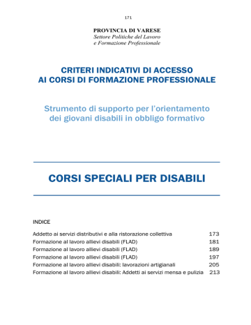 171 PROVINCIA DI VARESE Settore Politiche del Lavoro e Formazione Professionale CRITERI INDICATIVI DI ACCESSO AI CORSI DI FORMAZIONE PROFESSIONALE Strumento di supporto per l’orientamento dei giovani disabili in obbligo formativo CORSI SPECIALI PER DISABILI INDICE Addetto ai servizi distributivi e alla ristorazione collettiva Formazione al lavoro allievi disabili (FLAD) Formazione al lavoro allievi disabili (FLAD) Formazione al lavoro allievi disabili (FLAD) Formazione al lavoro allievi disabili: lavorazioni artigianali Formazione al lavoro allievi disabili: Addetti ai servizi mensa e pulizia 173 181 189 197 205 213 172 Appunti 173 ADDETTO AI SERVIZI DISTRIBUTIVI E ALLA RISTORAZIONE COLLETTIVA La figura professionale in oggetto è un operatore polivalente che verrà impiegata nella grande e media distribuzione, a diretto contatto con il caporeparto o il titolare dell’esercizio; inoltre potrà essere impiegato nella ristorazione collettiva con compiti di ausilio. La figura agisce a livello prevalentemente operativo. Il processo produttivo nel quale è inserito si articola nelle seguenti fasi: - approvvigionare e stoccare i prodotti e le materie prime - effettuare la preparazione di base degli alimenti - eseguire la pulizia e il riordino degli ambienti e attrezzature di lavoro - predisporre e riordinare ambienti ed arredi di distribuzione e di servizio Abilità lavorative e capacità personali - Caricare e scaricare merci Stoccare merci in magazzino Distribuire i prodotti nel punto vendita Pulire e riordinare ambienti Effettuare operazioni di prima preparazione di sostanze alimentari Ingredienti e materie prime (cucina) Pulire apparecchiature di lavoro Ambiti di lavoro Questa figura polivalente potrà essere impiegata presso supermercati e la grande distribuzione, presso centri di ristorazione collettiva (aziende, scuole, mense), cooperative sociali di servizi, case di riposo e strutture di servizi, magazzini di grosse aziende. Percorso formativo Il corso ha durata biennale, suddivisa in quattro cicli di frequenza diurna con una media di 27 ore settimanali per un totale annuo di 900 ore. La scelta multisettoriale e la polivalenza delle prestazioni è funzionale allo sviluppo delle autonomie e alla crescita personale degli allievi in difficoltà: pertanto sono previsti importanti interventi su tecniche di comunicazione e di relazione. E’ previsto un tirocinio in aziende e strutture di 200 ore per il I anno e di 400 ore per il II anno. Il corso è attivato presso: E.N.A.I.P. Lombardia - C.S.F. di BUSTO ARSIZIO Viale Stelvio, 143 – 21052 Settore Politiche del Lavoro e Formazione Professionale Tel. 0331.372.111 fax 0331.681.171 174 Corso Sede Addetto ai servizi ditributivi e alla ristorazione collettiva E.N.A.I.P. Lombardia - C.S.F. di Busto Arsizio COMPETENZE DI BASE (SAPERE) LEGGERE - Per niente - Poco Leggere il proprio nome e cognome e discriminare per riconoscimento le parole - Sufficiente Leggere e comprendere frasi semplici composte da soggetto, verbo e predicato - Discreto Leggere e comprendere brani semplici dai contenuti familiari (rispetto alla esperienza di vita) - Molto Leggere e comprendere brani semplici di diversa tipologia (anche tecni ca, termini e codici più correnti) SCRIVERE - Per niente - Poco Scrivere autonomamente il proprio nome e cognome e parole di più frequente uso - Sufficiente Scrivere sotto dettatura semplici frasi e comporre semplici brani in situazione guidata - Discreto Scrivere autonomamente brani semplici - Molto Scrivere e produrre autonomamente testi semplici anche con contenuti di carattere tecnico COMPRENSIONE ORALE - Per niente - Poco Comprendere alcuni elementi del messaggio anche tecnico senza essere in grado autonomamente di elaborare/organizzare i dati recepiti - Sufficiente Comprendere gli elementi essenziali del messaggio anche tecnico rivolto individualmente sapendo elaborare/organizzare i dati recepiti in situazione guidata - Discreto Comprendere i contenuti generali e specifici del messaggio anche tecnico, rivolto individualmente sapendo elaborare/organizzare i principali dati recepiti - Molto Comprendere gli elementi essenziali dei contenuti generali e specifici del messaggio, anche tecnico, rivolto al gruppo classe e saper elaborare/ organizzare i principali dati in situazione guidata Settore Settore Politiche Politiche del del Lavoro Lavoro ee Formazione Formazione Professionale Professionale 175 COMPRENSIONE SCRITTA - Per niente - Poco Leggere ed interpretare il significato di brevi frasi dal contenuto semplice e collegato ad esperienze di vita quotidiana - Sufficiente Leggere ed interpretare semplici brani dal contenuto semplice - Discreto Leggere ed interpretare semplici brani anche dal contenuto tecnico in situazione guidata - Molto Leggere, interpretare ed organizzarsi su testi anche dal contenuto tecnico purché già conosciuto o affrontato in situazione guidata. Leggere ed interpretare schemi e disegni tecnici di tipo semplice CAPACITA’ DI ESPRESSIONE VERBALE - Per niente - Poco Articolare in maniera comprensibile parole-frase per comunicare richieste ed esigenze - Sufficiente Dialogare su semplici contenuti di vita quotidiana con frasi semplici e sufficientemente articolate - Discreto Avere a disposizione nel proprio vocabolario terminologie anche tecniche specifiche e saperle utilizzare coerentemente - Molto Esprimere il proprio pensiero, in forma semplice su argomenti diversi anche di contenuto tecnico NOZIONI DI MATEMATICA - Per niente - Poco Riconoscere il simbolo numerico entro la decina e le quantità che gli si riferiscono - Sufficiente Avere il concetto di somma, sottrazione e divisione; saper eseguire semplici operazioni di calcolo (addizione e sottrazione) entro le centinaia. Riconoscere le forme geometriche piane - Discreto Eseguire semplici calcoli (quattro operazioni) anche con l’uso di strumentazione appropriata, applicando concetti logici per risolvere semplici problemi - Molto Come sopra. E possiede il c