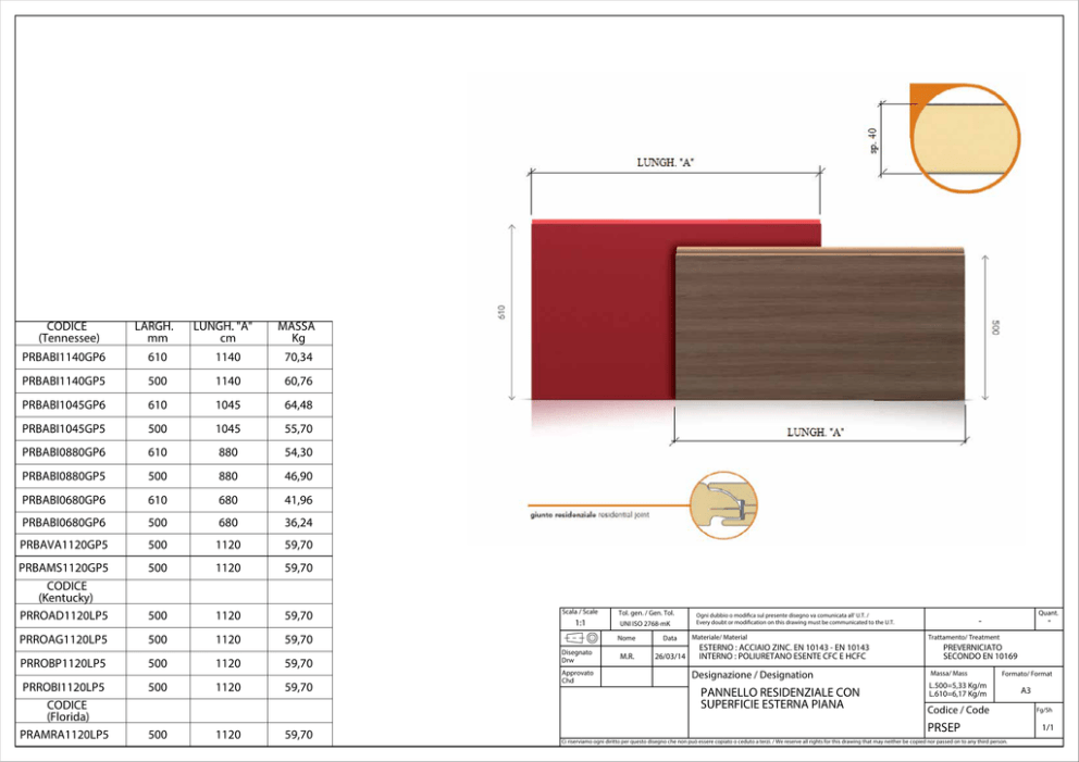 CODICE (Tennessee) LARGH. mm LUNGH. "A" cm MASSA Kg PRBABI1140GP6 610 1140 70,34 PRBABI1140GP5 500 1140 60,76 PRBABI1045GP6 610 1045 64,48 PRBABI1045GP5 500 1045 55,70 PRBABI0880GP6 610 880 54,30 PRBABI0880GP5 500 880 46,90 PRBABI0680GP6 610 680 41,96 PRBABI0680GP6 500 680 36,24 PRBAVA1120GP5 500 1120 59,70 PRBAMS1120GP5 CODICE (Kentucky) PRROAD1120LP5 500 1120 59,70 500 1120 59,70 PRROAG1120LP5 500 1120 59,70 PRROBP1120LP5 500 1120 59,70 PRROBI1120LP5 CODICE (Florida) PRAMRA1120LP5 500 1120 59,70 500 1120 59,70 Scala / Scale Tol. gen. / Gen. Tol. 1:1 UNI ISO 2768-mK Disegnato Drw Approvato Chd Nome Data M.R. 26/03/14 Ogni dubbio o modifica sul presente disegno va comunicata all' U.T. / Every doubt or modification on this drawing must be communicated to the U.T. Materiale/ Material ESTERNO : ACCIAIO ZINC. EN 10143 - EN 10143 INTERNO : POLIURETANO ESENTE CFC E HCFC Designazione / Designation PANNELLO RESIDENZIALE CON SUPERFICIE ESTERNA PIANA Quant. - Trattamento/ Treatment PREVERNICIATO SECONDO EN 10169 Massa/ Mass Formato/ Format L.500=5,33 Kg/m L.610=6,17 Kg/m Codice / Code PRSEP Ci riserviamo ogni diritto per questo disegno che non può essere copiato o ceduto a terzi. / We reserve all rights for this drawing that may neither be copied nor passed on to any third person. A3 Fg/Sh 1/1