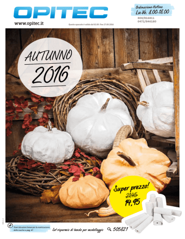 Ordinazione-Hotline: Lu-Ve: 8.00-18.00 www.opitec.it 800/816811 0472/846180 Questo opuscolo è valido dal 02.09. fino 27.09.2016 AUTUNNO 2016 Super prezzo! 21,45 S004_it_it 14,95 Trovi istruzioni breve per la realizzazione delle zucche a pag. 47 Set risparmio di bende per modellaggio 505821 INDICE Cara/o amica/o della OPITEC in autunno la natura sfocia in giochi di colori e forme che non avremmo mai il coraggio di riprodurre e dipingere. Così il cielo non è solo blu, ma anche rosa o giallo e una foglia che brilla di verde intenso si trasforma in autunno in un favoloso rosso caldo. Fatti ispirare dalla natura e sii creativo. a nelle Ti auguriamo tanta gioi o at tività creative in autunn il team O PI TEC Übrigens: Der neue Hauptkatalog 2016 / 2017 ist erschienen. Fordern Sie Ihr Exemplar kostenlos unter 01806 908 908 an! 12 Handlettering Calligrafia ... 18 SILHOUETTE CAMEO® Plottare ti renderà felice! 25 Mosaico Oggetti decorativi autunnali 28 Infeltrire Amorevoli uccelli bislacchi 07 Giostrine con foglie Modellare in autunno SILHOUETTE CAMEO® Disegnare-Ritagliare-Decorare 26 Pagina 18 Anello di maglia - gufi 15 Mandalas Arte su legno 48 Autunno - stagione delle conserve 47 Bellissime zucche terrificanti 3 4 S004_it_it Esempio d’impiego proposto dalla OPITEC a i h c c a m a n u Creare da o t t e l a m i n a o un allegr E si procede così: Dipingi un cerchio con colore acrilico, lascia asciugare e dipingi motivi con un Fineliner. 1 2 5 3 4 6 Esempio d’impiego proposto dalla OPITEC 3| STAEDTLER® Lumocolor permanente Marker 1| Marabu Artist colori acrilici - Set 12 colori da 22 ml nei colori giallo primario, giallo cadmio scuro, rosso cinabro, rosso carminio, violetto, ultramarino, blu phthalo, verde phthalo chiaro, ocra chiaro, umbra cotto, bianco titanio e nero, ottima qualità e lucentezza, impiego versatile grazie alla consistenza pastosa, applicabile su tela, legno e altro. Set da 12 502096 19,70 14,95 100ml= 5,66 2| Dischi di betulla assortimento non impegnativo, rotondo, misure: ca. ø 80 - 120 mm, ca. 10 - 15 mm spessore, 10 pezzi 723441 assortimento non impegnativo, rotondo, misure: ca. ø 200 - 300 mm, ca. 20 - 35 mm spessore, 1 pezzo 723463 Tutti i prezzi in EUR 6,95 1pz= 0,70 5,80 1pz= 5,80 superfine 0,4 mm, nero, 1 pezzo 454197 1,95 4| Marabu Acryl Color 5| Legno - tavoletta ovale piastra in fibra di legno, naturale, senza decorazione, 1 pezzo 471356 ca. 180 x 130 mm 2,35 1,85 471345 ca. 230 x 160 mm 3,15 2,35 Mixed Media Colore acrilico cremoso a base di acqua. I colori sono mescolabili tra loro, diluibili ad acqua, di rapida asciugatura, resistenti alla luce diurna e all’acqua. Possono essere applicati su fondi privi di polvere e unto come tele, carta, cartoncino, legno ecc. Adatti per lavori con timbri e mascherine. 100 ml, 1 pezzo 584393 bianco 584256 arancione 584267 rosso ciliegia 3,25 3,25 3,25 6| FABER - CASTELL GRIP Finepen set 10 pen nei colori giallo, arancione, rosso, pink, lilla, blu chiaro, blu scuro, verde, marrone e nero. I pen hanno una zona soft-grip per una presa sicura. Essi sono molto adatti per lavorare con un righello o stencil. Tratto ca. 0,4 mm, set da 10 514774 6,95 1pz= 0,70 5 o c s o b l e d i l a Anim Esempio d’impiego proposto dalla OPITEC Trovi i tronchetti, pezzetti e dischi di legno nel catalogo generale alle pagine 506 - 507. Super prezzo! Trovi le istruzioni per gli animali del bosco sotto www.opitec.it/ animalidelbosco-argilla 24,35 4 pezzi 2 pezzi 10 pezzi 19,90 20 g set da 14 Set di fustelle - anelli Terracotta - vasetti Terracotta - vaso per rose misure interne: ca. ø 35 x 30 mm, fondo con foro ca. ø 5 mm, 10 pezzi misure interne: ca. ø 120 x 140 mm, fondo con foro ca. ø 10 mm, 2 pezzi 2,90 1pz= 0,29 954920 598693 2,95 1pz= 1,48 lamiera stagnata, idonea per alimenti, misure: ca. ø 29 - 112 mm, altezza ca. 30 mm, con barattolo di latta, 14 parti 24,35 19,90 541375 Muschio decorativo verde, 20 g 907520 misure interne: ca. ø 45 x 40 mm, fondo con foro ca. ø 5 mm, 10 pezzi 3,50 954953 misure interne: ca. ø 55 x 50 mm, fondo con foro ca. ø 10 mm, 10 pezzi 3,60 534160 misure interne: ca. ø 70 x 60 mm, fondo con foro ca. ø 10 mm, 10 pezzi 3,95 534170 1pz= 0,35 20 g 1pz= 0,40 misure interne: ca. ø 90 x 80 mm, fondo con foro ca. ø 10 mm, 10 pezzi 4,75 1pz= 0,47 523032 misure interne: ca. ø 110 x 100 mm, fondo con foro ca. ø 10 mm, 4 pezzi 4,75 523021 6 S004_it_it 50 g 1pz= 0,36 naturale 530497 20 g 511446 50 g arancione 511491 50g rosso 510242 50g verde chiaro 511505 50g Rafia naturale 20 g 1pz= 1,19 giallo banana 511468 50g 50 g www.opitec.it 0,95 100g= 4,75 2,35 100g= 4,70 Tel.: 800 - 81 68 11 Fax: 800 - 81 68 12 2,70 100g= 13,50 4,65 per ATTENZIONE! Non adatto a bambini di età inferiore a 3 anni Questo prodotto contiene piccole parti che potrebbero essere ingerite Pericolo di soffocamento I bambini sotto i 3 anni devono essere sorvegliati da adulti. Età consigliata: da 3 anni 4,20 Modellare in autunno Trovi il set dei pezzetti di radice N° 726771 a pagina 22, i colori acrilici Reeves nel catalogo generale a pagina 409. Creall® Do & Dry - sostanza da modellare È una pasta da modellare, che indurisce all’aria, adatta sia per bambini che per professionisti. È pronta per l’uso, aderisce su quasi tutte le superfici (legno, cartone, polistirolo, plastica, ecc.), non si attacca alle mani, facile da colorare, lunga tenuta, dopo l’apertura chiudere ermeticamente, 1000 g. 541788 bianco 4,65 4,20 1kg= 4,20 541777 terracotta 4,65 4,20 1kg= 4,20 100 g ATTENZIONE! Non adatto a bambini di età inferiore a 3 anni Pericolo di asfissia a causa di piccole sfere Perline di legno 2ª scelta: leggere imperfezioni di forma e colore, misure: ca. ø 6/10/15 mm, foro: ca. 1 - 3 mm, tonalità marrone, ca. 100 g = ca. set da 500 605602 9,85 7,95 1kg= 79,50 Spray acrilico trasparente Verniciare a spray in modo ecologico Aqua-Spray solventi ridotti del 90%, privo di odore sgradevole, ottima copertura, adatto per interni ed esterni e b