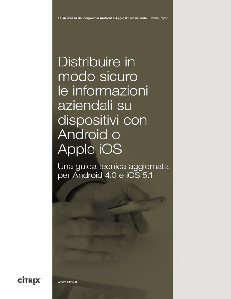 La sicurezza dei dispositivi Android e Apple iOS in azienda White Paper Distribuire in modo sicuro le informazioni aziendali su dispositivi con Android o Apple iOS Una guida tecnica aggiornata per Android 4.0 e iOS 5.1 www.citrix.it La sicurezza dei dispositivi Android e Apple iOS in azienda White Paper I dispositivi consumer basati su Android e iOS fra i quali smartphone e tablet giocano un ruolo sempre più importante nell’informatica aziendale, offrendo nuova flessibilità e mobilità per la forza lavoro e l’IT. Tuttavia pongono nuove sfide in merito alla sicurezza. Questo articolo affronta tali problematiche e spiega come poterle risolvere in modo efficace grazie alle soluzioni Citrix. Executive summary L’uso diffuso di dispositivi Android ha rapidamente portato il suo sistema operativo mobile nella posizione di leader del mercato globale. Ogni giorno vengono attivati centinaia di migliaia di nuovi telefoni Android e tablet.1 Quale piattaforma aperta con radici nel software open-source, Android è diventato un sistema operativo chiave nella ricerca di sempre maggiore mobilità. Le caratteristiche e i vantaggi richiesti sia dai consumatori sia dalle aziende rendono Android una scelta attraente sia per il singolo sia per le organizzazioni, ma queste ultime devono assicurare che vengano attuate le misure per garantire la sicurezza e la riservatezza delle informazioni aziendali. I dispositivi mobili di Apple, come ad esempio iPhone e iPad, hanno creato quello che si chiama un “iPhenomeno”. Sebbene siano stati commercializzati come dispositivi consumer, li troviamo utilizzati in molte aziende per consentire la mobilità del personale. Il 99% delle aziende Fortune 500 hanno provato o installato iPhone e l’86% stanno installando o provando dispositivi iPad all’interno dell’azienda.2 Il sistema operativo proprietario iOS è rigidamente controllato e ciò porta a un’esperienza stabile per tutte le applicazioni e dispositivi. Inoltre, dispone di un ecosistema ampio di software e hardware fortemente integrato con i dispositivi Apple. Apple ha elevato gli standard dell’esperienza utente. Come parte di una tendenza più ampia della consumerizzazione dell’IT, l’uso di dispositivi consumer all’interno dell’azienda può offrire vantaggi significativi sia per le organizzazioni sia per le persone. Un rapporto recente ha rivelato che quasi i due terzi delle organizzazioni intervistate, il 64%, ha citato la capacità di aumentare la produttività come uno dei vantaggi dei luoghi di lavoro flessibili.3 Quando il personale può scegliere i dispositivi di cui ha bisogno per svolgere il proprio lavoro, quando ha la libertà di usare i dispositivi personali, quando ha la flessibilità di utilizzare dispositivi diversi in base alla propria attività e all’ubicazione corrente e quando può accedere sempre ai dispositivi personali, la sua produttività aumenta. Tuttavia, affinché le aziende possano sfruttare appieno il valore di tali dispositivi, l’IT deve garantire che i vantaggi offerti non vadano a scapito della sicurezza delle informazioni. Occorre comprendere in questo contesto le nuove funzionalità, le impostazioni di configurazione, alcune limitazioni intrinseche e i rischi nell’utilizzo di dati aziendali su un dispositivo consumer. Citrix® si è impegnata a creare un mondo in cui le persone possano lavorare e giocare ovunque, su qualsiasi dispositivo, e nel rispetto di questo impegno ha sviluppato le tecnologie e le best practice volte a offrire il pieno valore dei dispositivi mobili più recenti per l’elaborazione sia personale sia aziendale. Le soluzioni “bring-your-own-device” di Citrix consentono agli utenti, che comprendono dipendenti, lavoratori a contratto e personale in outsourcing, di utilizzare i loro tablet e smartphone in modo ottimale nello svolgimento del loro lavoro offrendo nel contempo all’IT il controllo per garantire la sicurezza e la protezione delle informazioni aziendali riservate. TechCrunch, 27 febbraio 2012. PadGadget, luglio 2011. 3 Citrix, Workshifting: A Global Market Research Report, 2011. 1 2 www.citrix.it 2 La sicurezza dei dispositivi Android e Apple iOS in azienda White Paper In questo white paper verranno descritte, dal punto di vista dell’IT, le problematiche che emergono quando si consente l’utilizzo di tablet e smartphone basati su Android o iOS all’interno della rete aziendale e i passi che l’IT deve fare per mantenere il controllo pur promuovendo la produttività e la mobilità. In questo articolo verranno delineate le considerazioni in merito alla sicurezza, le alternative relative alla riduzione dei rischi e l’architettura, necessarie al supporto di tablet e smartphone che hanno accesso ai dati aziendali sensibili come dispositivi consumer. Verranno descritte, inoltre, le modalità con cui Citrix consente l’utilizzo di smartphone e tablet all’interno dell’azienda offrendo al personale l’accesso protetto ai desktop e alle applicazioni aziendali sui dispositivi mobili basati su Android e iOS. Citrix XenDesktop® consente all’IT di centralizzare le applicazioni e i desktop all’interno del datacenter per poi effettuarne la distribuzione come servizi on-demand. Citrix Receiver™, un client software leggero, semplifica l’accesso degli utenti a tali risorse da qualsiasi dispositivo di loro scelta, personale o di proprietà dell’azienda. Citrix ShareFile® consente il follow-me data. Insieme, tali soluzioni offrono all’azienda il controllo sui dati dal datacenter per qualsiasi dispositivo e risolvono molte delle problematiche legate alla sicurezza che l’IT deve affrontare, sia che i criteri consentano la mobilità dei dati aziendali sia che non la consentano. A completare XenDesktop, Citrix Receiver e ShareFile, vi sono Citrix GoToMeeting® per una facile collaborazione on-line, GoToManage per il supporto da remoto e GoToMyPC per la connessione ai desktop fisici. www.citrix.it 3 La sicurezza dei 