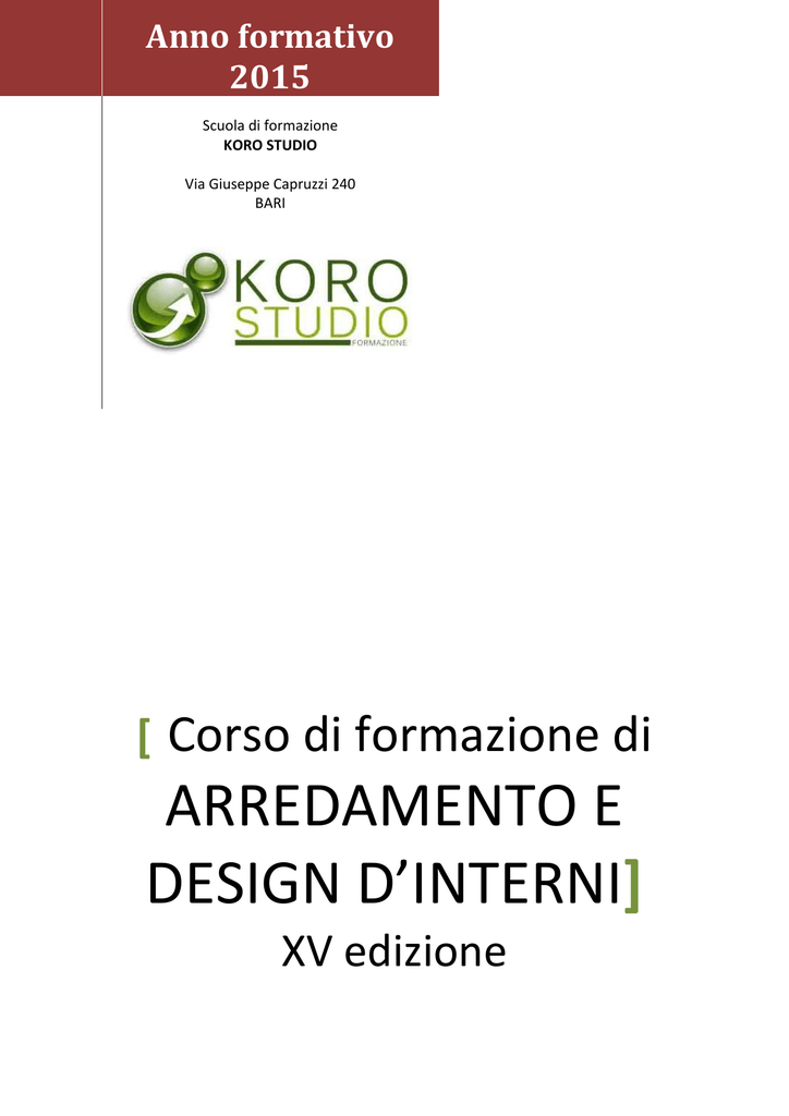 Anno formativo 2015 Scuola di formazione KORO STUDIO Via Giuseppe Capruzzi 240 BARI [ Corso di formazione di ARREDAMENTO E DESIGN D’INTERNI] XV edizione [CORSO DI FORMAZIONE DI ARREDAMENTO E DESIGN D’INTERNI] A.F. 2015 1° lezione: EXCURSUS STORICO DELL'ARREDAMENTO E DEL DESIGN D’INTERNI I LUOGHI DELL’ARREDAMENTO L'abitazione moderna e contemporanea Il caso italiano I luoghi pubblici EVOLUZIONE DEL DESIGN DAL ‘900 AD OGGI Fasi storiche dell’arredamento e del design Il design moderno e contemporaneo 2° lezione: METODOLOGIA DELLA PROGETTAZIONE Il sopralluogo e l’analisi preliminare Il progetto e la rappresentazione Possibili problematiche nell’iter progettuale 3° - 4° lezione: I LUOGHI DELL’INTERIOR DESIGN: LA CASA ZONA GIORNO L'ingresso: tipologie distributive, arredo, colore, illuminazione La cucina: aree di lavoro, spazi, illuminazione, materiali, colori Il soggiorno e l’area pranzo: materiali, illuminazione, colore ZONA NOTTE La camera da letto: evoluzione, materiali, illuminazione, colore La zona studio: materiali, illuminazione, colore LOCALI IGIENICI E DI SERVIZIO Il bagno: evoluzione, materiali, illuminazione, colore, arredo Lavanderie, ripostigli, balconi Normativa di riferimento ESERCITAZIONI PRATICHE 5° lezione: TEORIA DEL COLORE Fisiologia del colore Effetti psicologici dei colori Il colore negli ambienti della casa, nei luoghi di lavoro, negli spazi commerciali 6° / 8° lezione: TEORIA DELLA RAPPRESENTAZIONE Metodi di rilievo e relativi strumenti Problematiche nel rilievo IL DISEGNO Rappresentazione grafica del progetto e scale di riduzione Norme UNI per il disegno ESERCITAZIONI PRATICHE E PRESENTAZIONE TEMA D’ANNO Scuola di formazione KORO STUDIO 2 [CORSO DI FORMAZIONE DI ARREDAMENTO E DESIGN D’INTERNI] A.F. 2015 9° - 10° lezione: MATERIALI TRADIZIONALI E INNOVATIVI Materiali naturali e materiali artificiali: interferenze ed interazioni Il legno ed i suoi utilizzi Materiali lapidei Fibre naturali ed artificiali Carta e derivati per il design e l'architettura Cotti e ceramiche Metalli Plastiche e resine ESERCITAZIONE PRATICA: REVISIONE TEMA D’ANNO 11° - 12° lezione: I LIMITI DELLO SPAZIO COSTRUITO Pavimenti: tecniche, materiali e finiture Soffitti e controsoffitti: tecniche, materiali e finiture Pareti: tecniche, materiali e finiture ESERCITAZIONE PRATICA: REVISIONE TEMA D’ANNO 13° lezione: TEORIA DELLA RAPPRESENTAZIONE Modello tridimensionale Proiezioni Assonometria Prospettiva 14° - 15° lezione:: L’ARREDAMENTO NELLA STORIA Excursus storico degli stili Arredo classico e modernariato Il progetto dell’elemento d’arredo I complementi d’arredo e il loro utilizzo Progettazione su misura 16° lezione: TECNOLOGIE E IMPIANTI Gli impianti domestici: la casa come struttura collaborante, Impianto elettrico, a gas e di riscaldamento, idraulico Aerazione e purificazione dell'aria 17° lezione: ILLUMINOTECNICA Fisiologia della luce: il fenomeno della visione Illuminazione naturale: illuminazione diretta e sistemi di illuminazione naturale (coni di luce, etc) Illuminazione artificiale: elementi di valutazione delle lampade Classificazione delle fonti luminose Scuola di formazione KORO STUDIO 3 [CORSO DI FORMAZIONE DI ARREDAMENTO E DESIGN D’INTERNI] A.F. 2015 Illuminazione diretta e illuminazione diffusa: corpi illuminanti e loro utilizzo L'illuminazione: gli ambienti domestici, di lavoro, commerciali. 18° lezione: IL PROGETTO DEL VERDE Classificazione dei giardini Il progetto del verde in casa: problematiche e soluzioni Le piante da appartamento e le relative proprietà purificanti ESERCITAZIONE PRATICA: REVISIONE TEMA D’ANNO 19° lezione: L’ARREDAMENTO MODERNO Gli stili da adottare Gli accostamenti dei colori Il mix tra gli stili e le nuove tendenze 20° / 25° lezione: RESTYLING E HOME STAGING Cos’è il restyling L’Home Staging: migliorare un ambiente per vendere con più facilità un immobile Utilizzo di colori, complementi d’arredo, tessuti, tendaggi, illuminazione, carte da parati per effettuare un restyling efficace Esempi di prima e dopo I casi e le soluzioni ESERCITAZIONI PRATICHE 26° / 28° lezione: I LUOGHI DELL’INTERIOR DESIGN: LUOGHI PUBBLICI Metodologie di approccio alla progettazione di un luogo pubblico Spazi serviti e spazi serventi Locali igienici e arredo tecnico Possibili problematiche e principali normative di riferimento ESERCITAZIONI PRATICHE E REVISIONE FINALE TEMA D’ANNO 29° lezione: DOMOTICA ED ERGONOMIA L'ottimizzazione degli spazi L'ergonomia applicata al design La domotica e il suo sviluppo 30° lezione:: PROGETTARE L’ARMONIA: IL FENG SHUI Il Feng Shui e l'arte del vento e dell'acqua Il vastu Cenni sulla progettazione di interni secondo il Feng Shui Scuola di formazione KORO STUDIO 4 [CORSO DI FORMAZIONE DI ARREDAMENTO E DESIGN D’INTERNI] A.F. 2015 CONTATTI Segreteria didattica - aule di formazione: Via Giuseppe Capruzzi 240 – 70124 Bari Tel / Fax: 080. 557.42.28 Cell: 393. 549.14.29 E-mail: [email protected] - [email protected] Sito internet: www.korostudio.it Koro Studio Scuola di formazione KORO STUDIO 5