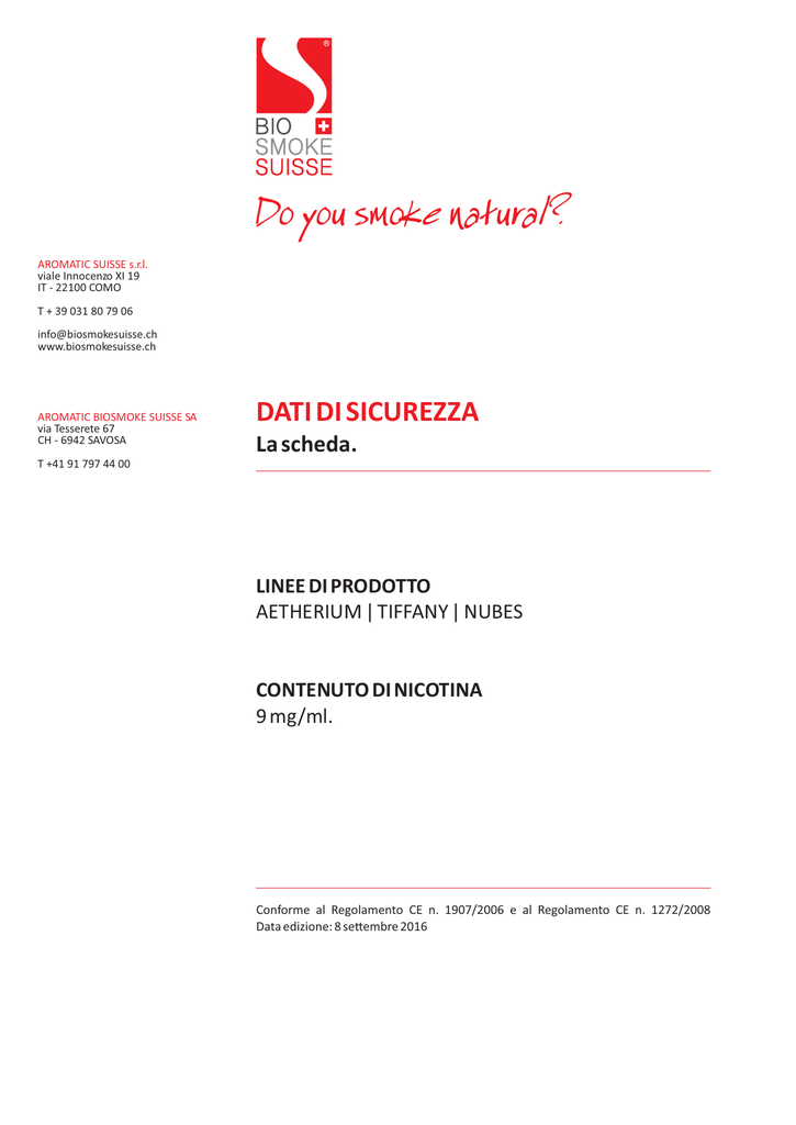 BIO SMOKE SUISSE Do you smoke natural? AROMATIC SUISSE s.r.l. viale Innocenzo XI 19 IT - 22100 COMO T + 39 031 80 79 06 [email protected] www.biosmokesuisse.ch AROMATIC BIOSMOKE SUISSE SA via Tesserete 67 CH - 6942 SAVOSA DATI DI SICUREZZA La scheda. T +41 91 797 44 00 LINEE DI PRODOTTO AETHERIUM | TIFFANY | NUBES CONTENUTO DI NICOTINA 9 mg/ml. Conforme al Regolamento CE n. 1907/2006 e al Regolamento CE n. 1272/2008 Data edizione: 8 se embre 2016 BIO SMOKE SUISSE Do you smoke natural? AROMATIC SUISSE s.r.l. viale Innocenzo XI 19 IT - 22100 COMO 1.0 | IDENTIFICAZIONE DEL PRODOTTO E DELLA SOCIETÀ T + 39 031 80 79 06 1.1 | IDENTIFICAZIONE DEL PRODOTTO [email protected] www.biosmokesuisse.ch Nome commerciale: Linea AETHERIUM Aroma Virginia Aroma Cuba Aroma Menta Linea TIFFANY Aroma Mandarino Aroma Mela Verde Aroma Fragolina Aroma Passion Fruit Aroma Cocco Aroma Exo c Aroma Bistrot Aroma Delizia Aroma Caffè Aroma Cool Berries Aroma Ice Aroma Vaniglia Aroma Maryland Aroma El Puro’s Aroma Kentuky Tobacco Aroma Basmas Tobacco Aroma Anatholia Aroma Black Tobacco Aroma Italian Blend Aroma American Blend AROMATIC BIOSMOKE SUISSE SA via Tesserete 67 CH - 6942 SAVOSA T +41 91 797 44 00 Linea NUBES Aroma Aristoblend Aroma Virginia Aroma Cuba Aroma Light Tobacco Aroma Liquirizia Aroma Menta Aroma Whisky Aroma Agrumi Aroma Ananas Aroma Cherry 1.2 | PERTINENTI USI DEL PRODOTTO E USI SCONSIGLIATI Uso per nente: Uso sconsigliato: liquido per vaporizzatori personali (sigare a ele ronica) tu quelli diversi dall'uso per nente. BIO SMOKE SUISSE Do you smoke natural? AROMATIC SUISSE s.r.l. viale Innocenzo XI 19 IT - 22100 COMO T + 39 031 80 79 06 1.3 | INFORMAZIONI SUL FORNITORE DELLA SCHEDA DATI DI SICUREZZA Ragione Sociale: AROMATIC BIOSMOKE SUISSE SA via Tesserete 67 CH - 6942 SAVOSA T +41 91 797 44 00 [email protected] [email protected] www.biosmokesuisse.ch AROMATIC SUISSE Srl viale Papa Innocenzo XI° 19 IT - 22100 COMO T +39 031 80 79 06 [email protected] CF & PI 03588160139 AROMATIC BIOSMOKE SUISSE SA via Tesserete 67 CH - 6942 SAVOSA T +41 91 797 44 00 1.4 | NUMERO TELEFONICO DI EMERGENZA Per informazioni urgen rivolgersi al numero +39 345 598 82 42 oppure consultare il Centro An veleno più vicino (l'elenco è stato tra o dal sito del Ministero della Salute Italiano). Numeri telefonici dei principali Centri An veleni italiani (a vi 24/24 ore) Centro An veleni Pavia: 0382 24444 (CAV IRCCS Fondazione Maugeri - Pavia) Centro An veleni Milano: 02 66101029 (CAV Ospedale Niguarda Ca' Granda - Milano) Centro An veleni Bergamo: 800 883300 (CAV Ospedali Riuni - Bergamo) Centro An veleni Firenze: 055 7947819 (CAV Ospedale Careggi - Firenze) Centro An veleni Roma: 06 3054343 (CAV Policlinico Gemelli - Roma) Centro An veleni Roma: 06 49978000 (CAV Policlinico Umberto I - Roma) 2.0 | IDENTIFICAZIONE DI PERICOLI 2.1 | CLASSIFICAZIONE DELLA MISCELA 2.1.1 | CLASSIFICAZIONE SECONDO DIRETTIVA 1999/45/CE Xn; Nocivo; R21 2.1.2 | CLASSIFICAZIONE SECONDO IL REGOLAMENTO (CE) N. 1272/2008 [CLP] Tossicità acuta; Categoria 4; H312 2.2 | ELEMENTI DELL’ETICHETTA Pi ogrammi di pericolo: Avvertenza · ATTENZIONE Indicazioni di pericolo · H312 - Nocivo a conta o con la pelle BIO SMOKE SUISSE Do you smoke natural? AROMATIC SUISSE s.r.l. viale Innocenzo XI 19 IT - 22100 COMO T + 39 031 80 79 06 [email protected] www.biosmokesuisse.ch AROMATIC BIOSMOKE SUISSE SA via Tesserete 67 CH - 6942 SAVOSA T +41 91 797 44 00 Consigli di prudenza · P102 - Tenere fuori dalla portata dei bambini · P280 - Indossare guan /indumen prote vi; Proteggere gli occhi/il viso · P302+P352 - In caso di conta o con la pelle lavare abbondantemente con acqua e sapone · P312 - In caso di malessere, conta are UN CENTRO ANTI VELENI o un medico · P363 - Lavare gli indumen contamina prima di indossarli nuovamente · P501 - Smal re il prodo o in conformità alle norma ve locali vigen Indicazioni supplementari · Vietata la vendita ai minori di anni 18 · Leggere a entamente il foglie o illustra vo · Non ingerire · Non u lizzare durante la gravidanza o l'alla amento · L'uso prolungato può indurre dipendenza 2.3 | ALTRI PERICOLI Informazione non disponibile. 3.0 | COMPOSIZIONE/INFORMAZIONI SUGLI INGREDIENTI 3.1 | SOSTANZE Informazione non per nente. 3.2 | MISCELE Descrizione della miscela Miscela contenente glicerolo vegetale, glicole propilenico vegetale, nico na, acqua e aromi. Ingredien pericolosi Numero CAS 54-11-5 Numero di registrazione REACH 17-2119382432-41-0000 Concentrazione ≥ 0,7 ≤ 0,9% Nome Nico na Classificazione secondo T+; R27/ T;R25/ N; R51; R53 la dire va 67/548/CEE Classificazione secondo Tossicità Acuta Cutanea (Categoria 1) H310; il regolamento (CE) N.1272/2008 Tossicità Acuta Orale (Categoria 3) H301; Tossicità Cronica per gli organismi acqua ci (Categoria 2) H411; Informazioni aggiun ve Per il testo completo delle frasi R e dei consigli H cfr. sez. 16. 4.0 | MISURE DI PRIMO SOCCORSO 4.1 | DESCRIZIONE DELLE MISURE DI PRIMO SOCCORSO Note generali In caso di necessità rivolgersi a un medico e mostrare la presente Scheda Da di Sicurezza. Se inalato In caso di malessere rivolgersi al personale medico. BIO SMOKE SUISSE Do you smoke natural? AROMATIC SUISSE s.r.l. viale Innocenzo XI 19 IT - 22100 COMO T + 39 031 80 79 06 [email protected] www.biosmokesuisse.ch AROMATIC BIOSMOKE SUISSE SA via Tesserete 67 CH - 6942 SAVOSA T +41 91 797 44 00 A conta o con la pelle Lavare abbondantemente con acqua e sapone, in caso di necessità rivolgersi al personale medico. A conta o con gli occhi Rimuovere eventuali len a conta o, lavarsi immediatamente e abbondantemente con acqua per almeno 15 minu , in caso di necessità rivolgersi al personale medico. Se ingerita Sciacquare la bocca con acqua, non provocare il vomito, in caso di malessere rivolgersi al personale medico. 4.2 | PRINCIPALI SINTOMI ED EFFETTI, SIA ACUTI CHE RITARDATI La Nico na, anche se in quan tà rido a (≤ 0,9%), presente nella miscela può causare i seguen effe : nausea, reaz