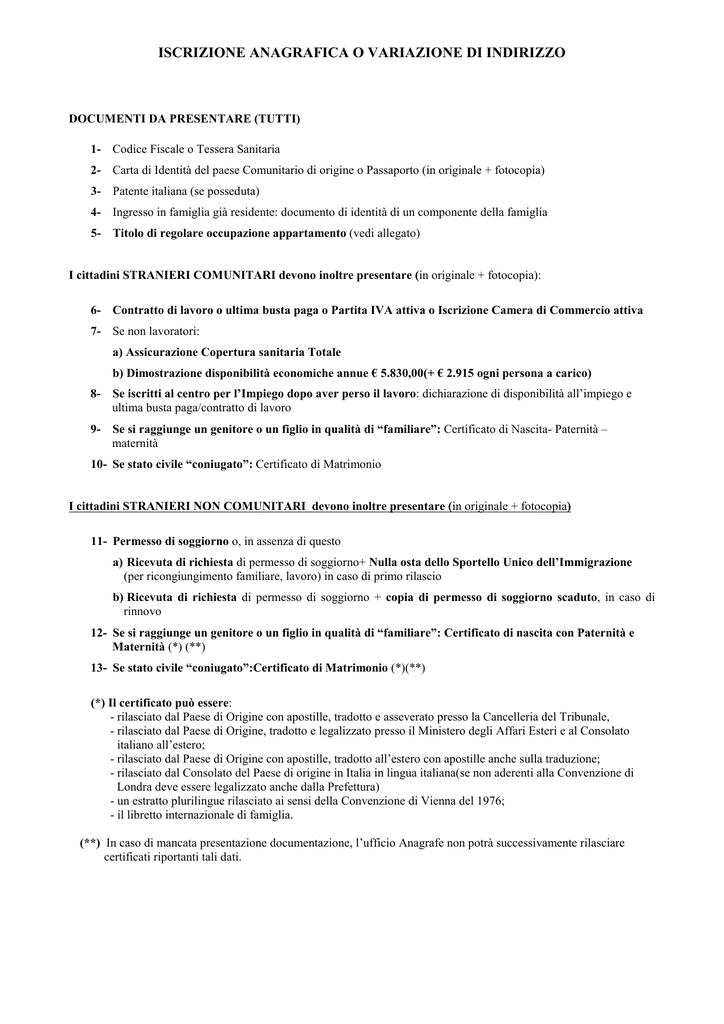 ISCRIZIONE ANAGRAFICA O VARIAZIONE DI INDIRIZZO DOCUMENTI DA PRESENTARE (TUTTI) 1- Codice Fiscale o Tessera Sanitaria 2- Carta di Identità del paese Comunitario di origine o Passaporto (in originale + fotocopia) 3- Patente italiana (se posseduta) 4- Ingresso in famiglia già residente: documento di identità di un componente della famiglia 5- Titolo di regolare occupazione appartamento (vedi allegato) I cittadini STRANIERI COMUNITARI devono inoltre presentare (in originale + fotocopia): 6- Contratto di lavoro o ultima busta paga o Partita IVA attiva o Iscrizione Camera di Commercio attiva 7- Se non lavoratori: a) Assicurazione Copertura sanitaria Totale b) Dimostrazione disponibilità economiche annue € 5.830,00(+ € 2.915 ogni persona a carico) 8- Se iscritti al centro per l’Impiego dopo aver perso il lavoro: dichiarazione di disponibilità all’impiego e ultima busta paga/contratto di lavoro 9- Se si raggiunge un genitore o un figlio in qualità di “familiare”: Certificato di Nascita- Paternità – maternità 10- Se stato civile “coniugato”: Certificato di Matrimonio I cittadini STRANIERI NON COMUNITARI devono inoltre presentare (in originale + fotocopia) 11- Permesso di soggiorno o, in assenza di questo a) Ricevuta di richiesta di permesso di soggiorno+ Nulla osta dello Sportello Unico dell’Immigrazione (per ricongiungimento familiare, lavoro) in caso di primo rilascio b) Ricevuta di richiesta di permesso di soggiorno + copia di permesso di soggiorno scaduto, in caso di rinnovo 12- Se si raggiunge un genitore o un figlio in qualità di “familiare”: Certificato di nascita con Paternità e Maternità (*) (**) 13- Se stato civile “coniugato”:Certificato di Matrimonio (*)(**) (*) Il certificato può essere: - rilasciato dal Paese di Origine con apostille, tradotto e asseverato presso la Cancelleria del Tribunale, - rilasciato dal Paese di Origine, tradotto e legalizzato presso il Ministero degli Affari Esteri e al Consolato italiano all’estero; - rilasciato dal Paese di Origine con apostille, tradotto all’estero con apostille anche sulla traduzione; - rilasciato dal Consolato del Paese di origine in Italia in lingua italiana(se non aderenti alla Convenzione di Londra deve essere legalizzato anche dalla Prefettura) - un estratto plurilingue rilasciato ai sensi della Convenzione di Vienna del 1976; - il libretto internazionale di famiglia. (**) In caso di mancata presentazione documentazione, l’ufficio Anagrafe non potrà successivamente rilasciare certificati riportanti tali dati. TITOLO DI OCCUPAZIONE DELL’IMMOBILE VERIFICARE LA DOCUMENTAZIONE DA PORTARE, A SECONDA DEL PROPRIO CASO, DA SOMMARE ALLA DOCUMENTAZIONE GIA’PREVISTA PER IL CAMBIO INDIRIZZO/RESIDENZA: Proprietario o comproprietario, in alloggio libero Dati estremi catastali: Cat A/ Sez Fg. Part/Mapp. oppure copia atto notarile Intestatario del contratto di locazione, in alloggio libero, registrato c/o Agenzia delle Entrate N° in data oppure copia contratto registrato Intestatario del contratto di locazione di alloggio ATC, in alloggio libero Copia del contratto o verbale di consegna alloggio Il comodatario, in alloggio libero, con contratto di comodato d’uso gratuito regolarmente registrato c/o Agenzia Entrate di N° In data oppure copia del comodato Sub Usufruttuario in alloggio libero - dati dell’atto che stabiliscono l’usufrutto - estremi catastali alloggio: Cat A/ Sez Fg art. Sub oppure copia dell’atto costitutivo dell’usufrutto Intestatario del contratto di locazione, in alloggio libero, in corso di registrazione dati relativi al proprietario dell’alloggio e codice fiscale oppure copia del contratto firmato in originale dalle parti. Entro i 45 giorni successivi alla richiesta di residenza o cambio indirizzo, dovranno essere forniti i dati di registrazione oppure copia del contratto firmato in originale(se non fornito alla richiesta) e copia del documento di identità del proprietario Il comodatario d’uso verbale, non registrato, in alloggio libero - dichiarazione del proprietario dell’alloggio “ di aver dato in comodato d’uso gratuito verbale a ” - copia documento di identità del proprietario. Si raggiunge il proprietario dell’alloggio, ivi già residente, nella stessa famiglia anagrafica - estremi catastali: Cat A/ Sez Fg Part/Mapp Sub - dati del proprietario oppure copia atto di proprietà Si raggiunge il proprietario dell’alloggio, ivi già residente, in coabitazione (senza vincoli di parentela o affettivi) - dichiarazione del proprietario dell’alloggio di assenso all’ingresso per con i dati catastali o visura - copia documento di identità del proprietario Si raggiunge l’affittuario, ivi già residente, che è un familiare o convivente oppure in coabitazione (senza vincoli di parentela o affettivi) - estremi reg. contratto di affitto o comodato registrato - dati dell’intestatario - dichiarazione del proprietario dell’alloggio di assenso all’ingresso per - copia documento di identità del proprietario Si entra come ospiti in un appartamento ma l’intestatario del contratto di affitto NON è residente anagraficamente nell’alloggio - estremi registrazione contratto di affitto o copia - dichiarazione di assenso dell’intestatario e copia del documento di identità - dichiarazione del proprietario dell’alloggio di assenso all’ingresso per - copia documento di identità del proprietario Persona che va ad abitare con datore di lavoro (badante, cameriera, baby sitter…) Dati del contratto di affitto registrato o comodato o catastali da atto di proprietà, dati proprietario, contratto di lavoro Si raggiunge l’assegnatario ATC ivi residente - copia del contratto o del verbale di consegna alloggio - copia dichiarazione di ospitalità presentata all’ATC (o ricevuta di invio)quando non si tratti di coniuge, figli e nipoti minori, genitori per i quali non è prevista la dichiarazione Studenti in residenza universitaria Copia assegnazione camera Cu